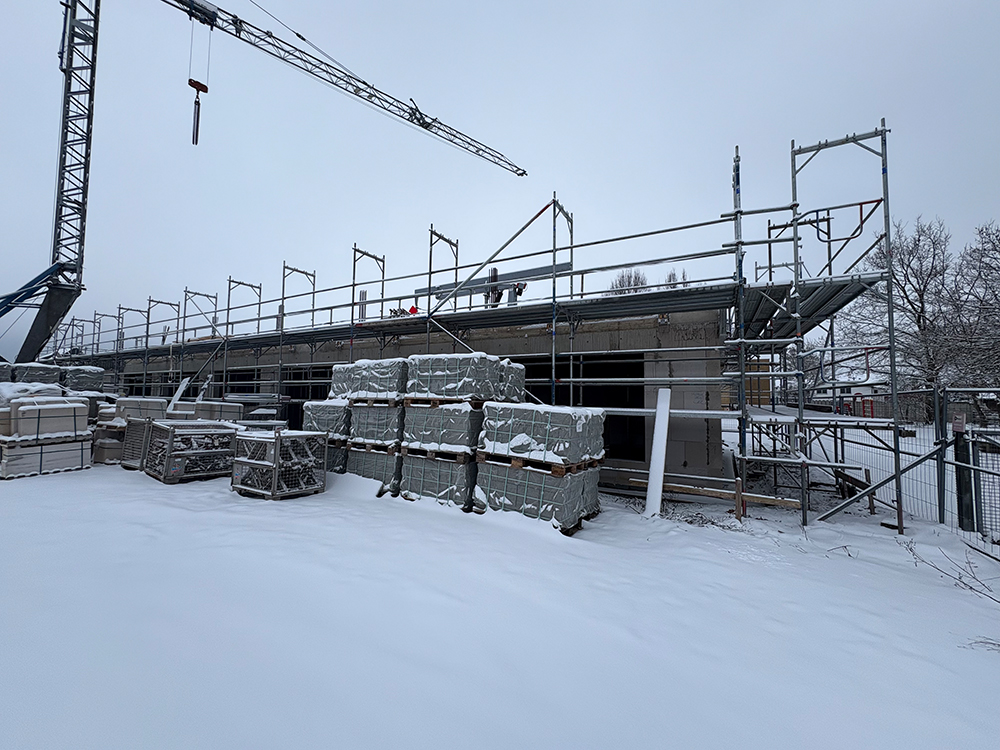 Nach dem Richtfest im September ging es dann ganz schnell - Binder und Dach wurden inzwischen montiert, nun geht der Ausbau los. Die Halle soll im August 2025 fertig sein.