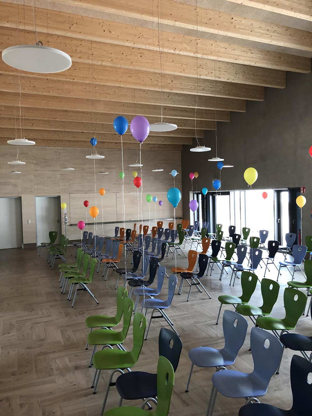 Alle Flure der Schule verlaufen konisch. Wir haben dafür Nutzungskonzepte entwickelt. In der Grundschule sind es Spielangebote: Im EG gibt es Spielkuben, zum Flur hin zum Sitzen und Klettern, zum Ganztagsbereich Rückzugsnischen. Boulderwände laden ein zum alternativen Bewegen den Flur entlang. Im OG gibt es Balanciersteine und Sitzpodeste. In der Gemeinschaftsschule gibt es Platz für Selbstlernbereiche, Aufenthalts-Inseln, einen offenen Steh-Arbeitstisch für eine ganze Klasse, einen offenen Bibliotheksbereich und eine Sitztreppe, die als kleine Tribüne für unterschiedlichste Veranstaltungen genutzt werden kann. Mit der Brandschutzsachverständigen haben wir das Konzept der Nutzungseinheiten so optimiert, dass alle Flure bespielbar sind und eingerichtet werden können. Die Fluchttreppen aus den Nutzungseinheiten sind außenliegende Stahltreppen. Alle WCs sind Unisex, als Einzel-WCs den Klassen zugeordnet mit offenen Waschbereichen. Bereits im 1.BA wurde für die Barrierefreiheit ein Aufzug eingebaut. Im 2.BA blieb die Raumspange der NaWi-Fachräume und der Lehrküche im Bestand erhalten, Klassenräume und Verwaltung wurden in einer neuen Raumspange angebaut. Die Planung entstand deutlich vor Corona. Deshalb werden die Klassenräume noch natürlich gelüftet mit Lüftungsklappen zur Nachtauskühlung. Die Schule wird über Fernwärme beheizt. Das vorhandene Stahlbetonskelett wird mit einem neuen Stahlbetonskelett ergänzt. Nur aussteifende Wände sind massiv. Das Ziegeldach des zu erhaltenden Altbautraktes blieb erhalten, das Neubaudach wurde als Flachdach aus Trapezblech mit Gefälledämmung angeschlossen. Die Fassaden sind Holzrahmenelemente.
