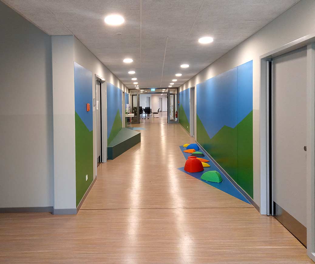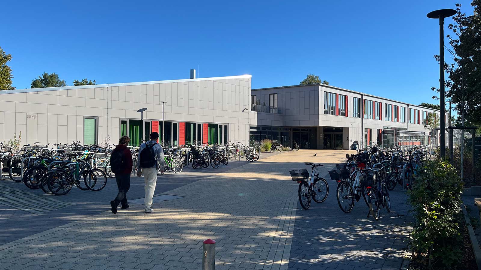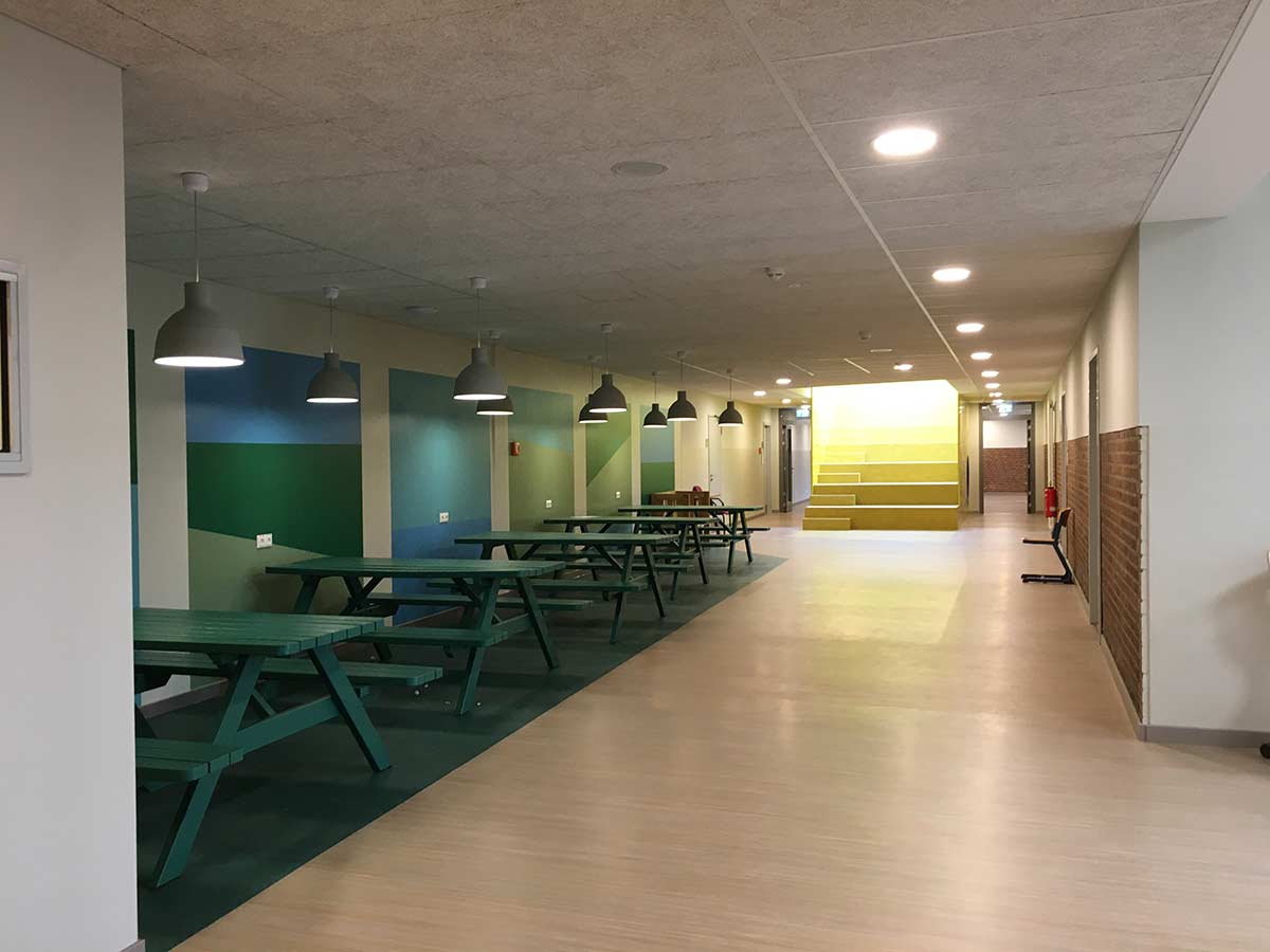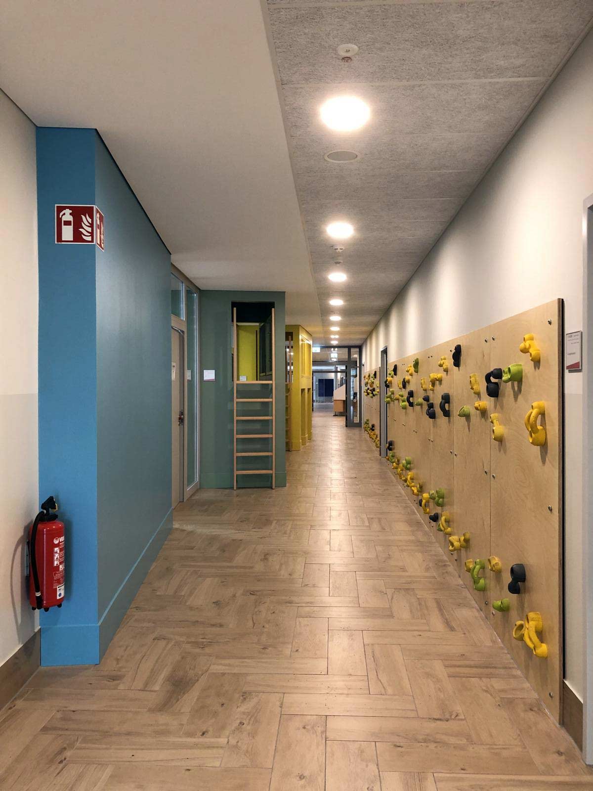 Alle Flure der Schule verlaufen konisch. Wir haben dafür Nutzungskonzepte entwickelt. In der Grundschule sind es Spielangebote: Im EG gibt es Spielkuben, zum Flur hin zum Sitzen und Klettern, zum Ganztagsbereich Rückzugsnischen. Boulderwände laden ein zum alternativen Bewegen den Flur entlang. Im OG gibt es Balanciersteine und Sitzpodeste. In der Gemeinschaftsschule gibt es Platz für Selbstlernbereiche, Aufenthalts-Inseln, einen offenen Steh-Arbeitstisch für eine ganze Klasse, einen offenen Bibliotheksbereich und eine Sitztreppe, die als kleine Tribüne für unterschiedlichste Veranstaltungen genutzt werden kann. Mit der Brandschutzsachverständigen haben wir das Konzept der Nutzungseinheiten so optimiert, dass alle Flure bespielbar sind und eingerichtet werden können. Die Fluchttreppen aus den Nutzungseinheiten sind außenliegende Stahltreppen. Alle WCs sind Unisex, als Einzel-WCs den Klassen zugeordnet mit offenen Waschbereichen. Bereits im 1.BA wurde für die Barrierefreiheit ein Aufzug eingebaut. Im 2.BA blieb die Raumspange der NaWi-Fachräume und der Lehrküche im Bestand erhalten, Klassenräume und Verwaltung wurden in einer neuen Raumspange angebaut. Die Planung entstand deutlich vor Corona. Deshalb werden die Klassenräume noch natürlich gelüftet mit Lüftungsklappen zur Nachtauskühlung. Die Schule wird über Fernwärme beheizt. Das vorhandene Stahlbetonskelett wird mit einem neuen Stahlbetonskelett ergänzt. Nur aussteifende Wände sind massiv. Das Ziegeldach des zu erhaltenden Altbautraktes blieb erhalten, das Neubaudach wurde als Flachdach aus Trapezblech mit Gefälledämmung angeschlossen. Die Fassaden sind Holzrahmenelemente.