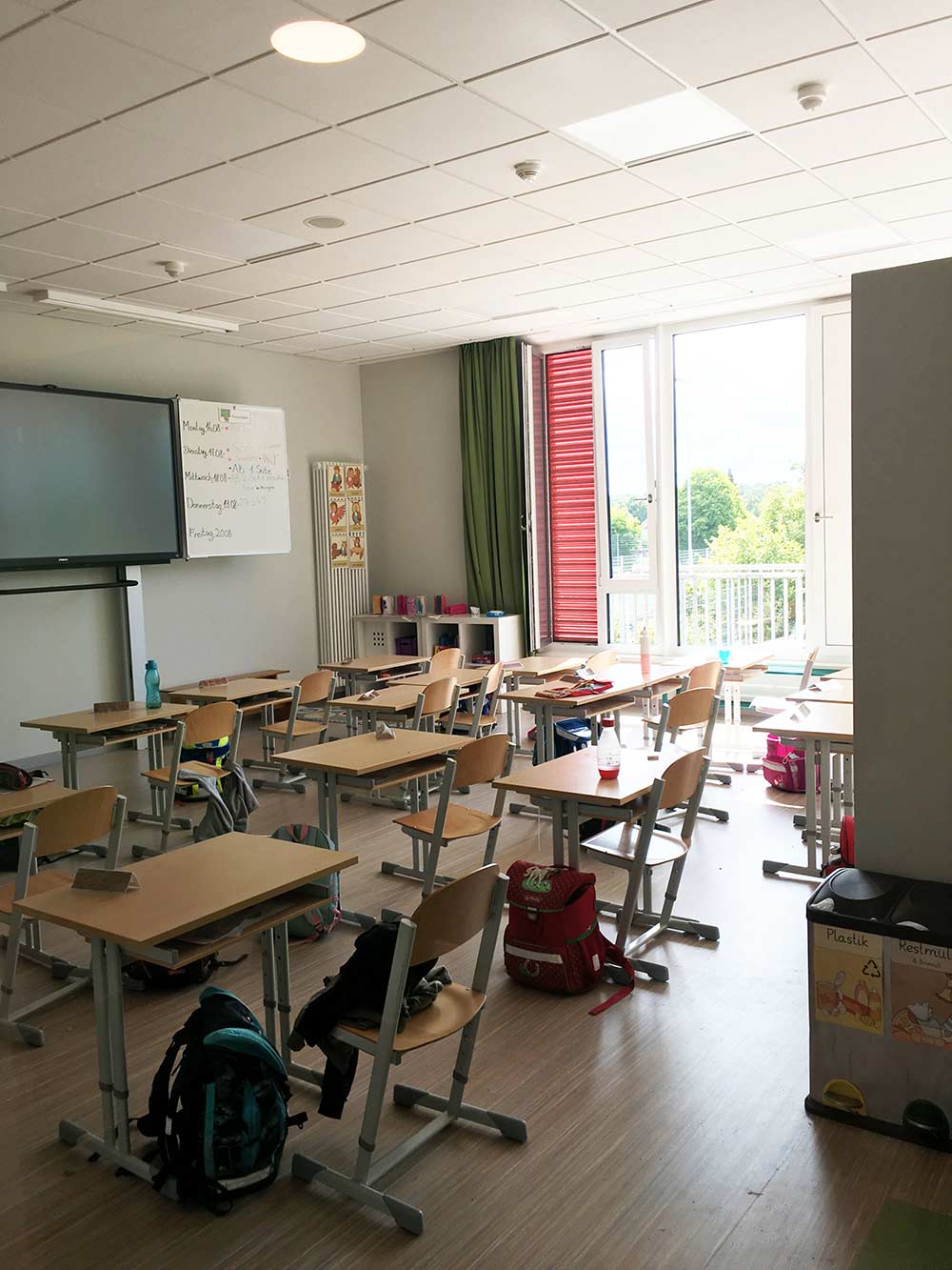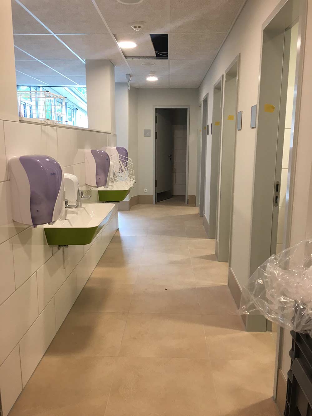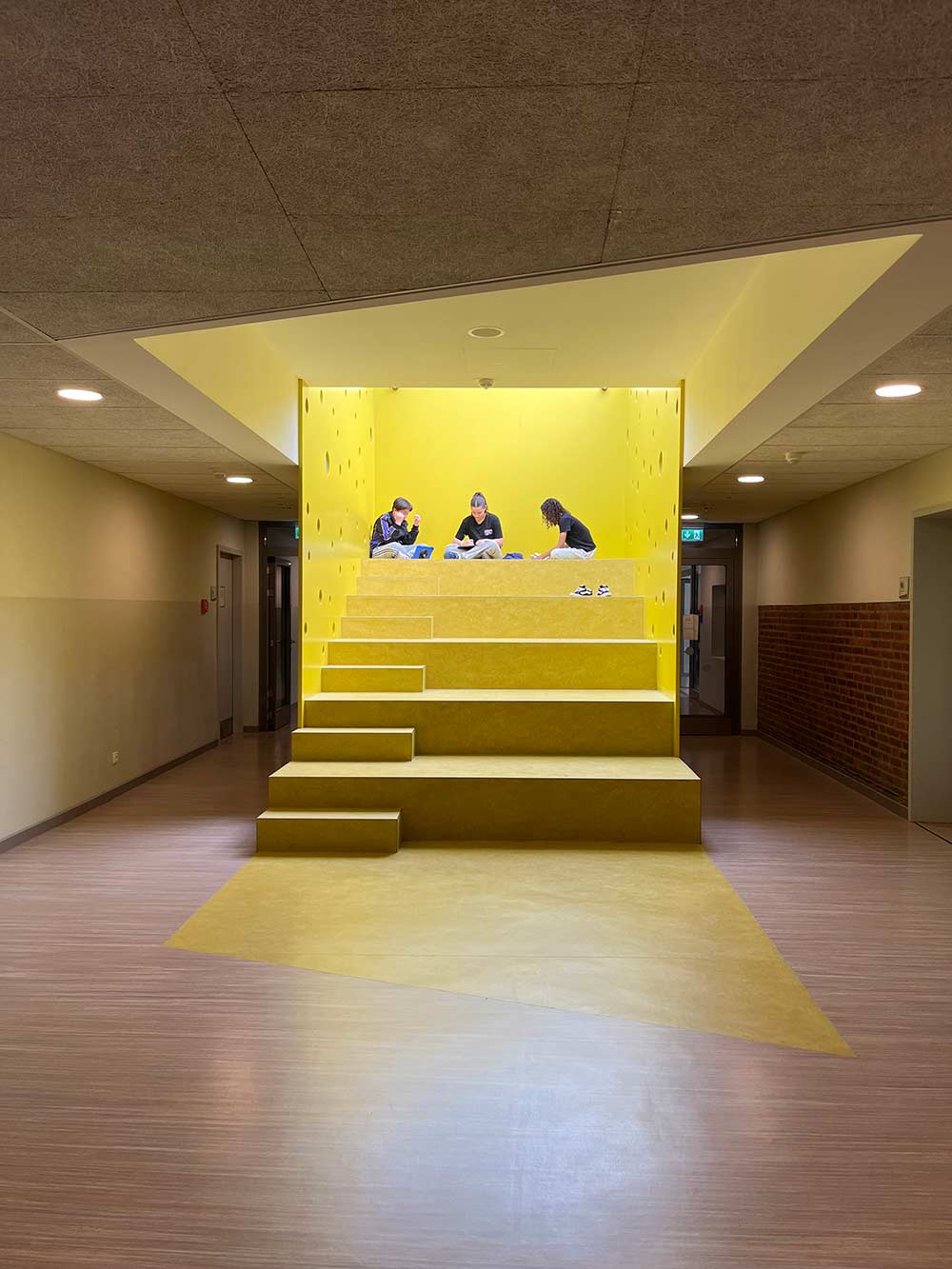 Alle Flure der Schule verlaufen konisch. Wir haben dafür Nutzungskonzepte entwickelt. In der Grundschule sind es Spielangebote: Im EG gibt es Spielkuben, zum Flur hin zum Sitzen und Klettern, zum Ganztagsbereich Rückzugsnischen. Boulderwände laden ein zum alternativen Bewegen den Flur entlang. Im OG gibt es Balanciersteine und Sitzpodeste. In der Gemeinschaftsschule gibt es Platz für Selbstlernbereiche, Aufenthalts-Inseln, einen offenen Steh-Arbeitstisch für eine ganze Klasse, einen offenen Bibliotheksbereich und eine Sitztreppe, die als kleine Tribüne für unterschiedlichste Veranstaltungen genutzt werden kann. Mit der Brandschutzsachverständigen haben wir das Konzept der Nutzungseinheiten so optimiert, dass alle Flure bespielbar sind und eingerichtet werden können. Die Fluchttreppen aus den Nutzungseinheiten sind außenliegende Stahltreppen. Alle WCs sind Unisex, als Einzel-WCs den Klassen zugeordnet mit offenen Waschbereichen. Bereits im 1.BA wurde für die Barrierefreiheit ein Aufzug eingebaut. Im 2.BA blieb die Raumspange der NaWi-Fachräume und der Lehrküche im Bestand erhalten, Klassenräume und Verwaltung wurden in einer neuen Raumspange angebaut. Die Planung entstand deutlich vor Corona. Deshalb werden die Klassenräume noch natürlich gelüftet mit Lüftungsklappen zur Nachtauskühlung. Die Schule wird über Fernwärme beheizt. Das vorhandene Stahlbetonskelett wird mit einem neuen Stahlbetonskelett ergänzt. Nur aussteifende Wände sind massiv. Das Ziegeldach des zu erhaltenden Altbautraktes blieb erhalten, das Neubaudach wurde als Flachdach aus Trapezblech mit Gefälledämmung angeschlossen. Die Fassaden sind Holzrahmenelemente.
