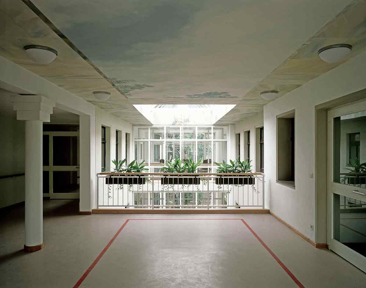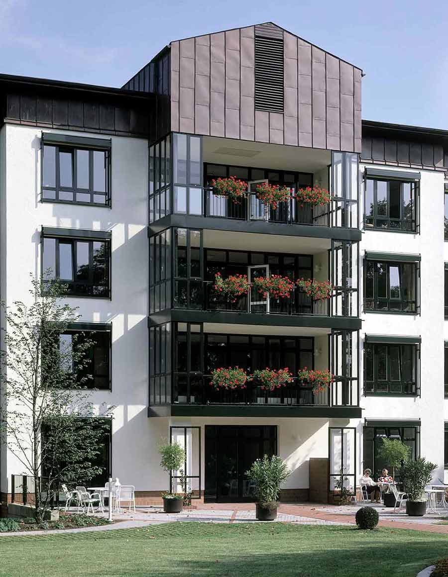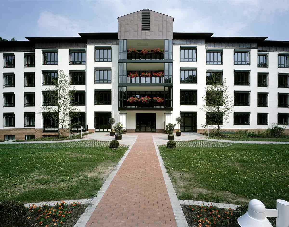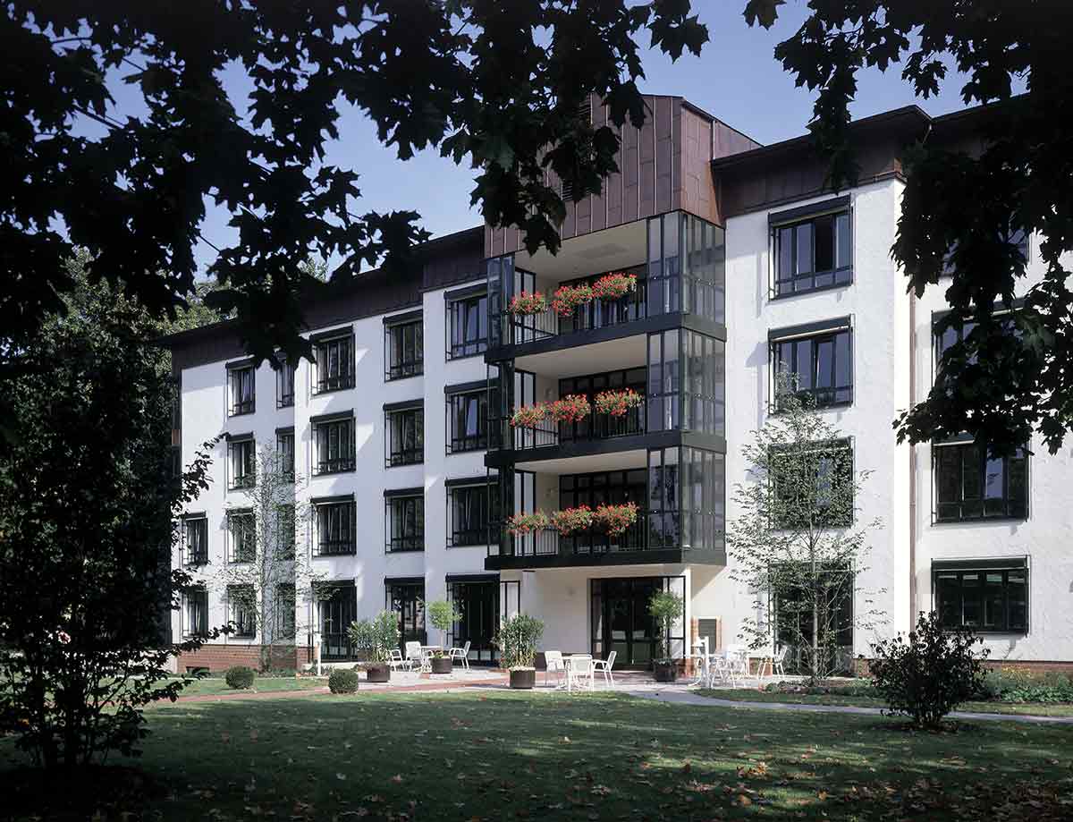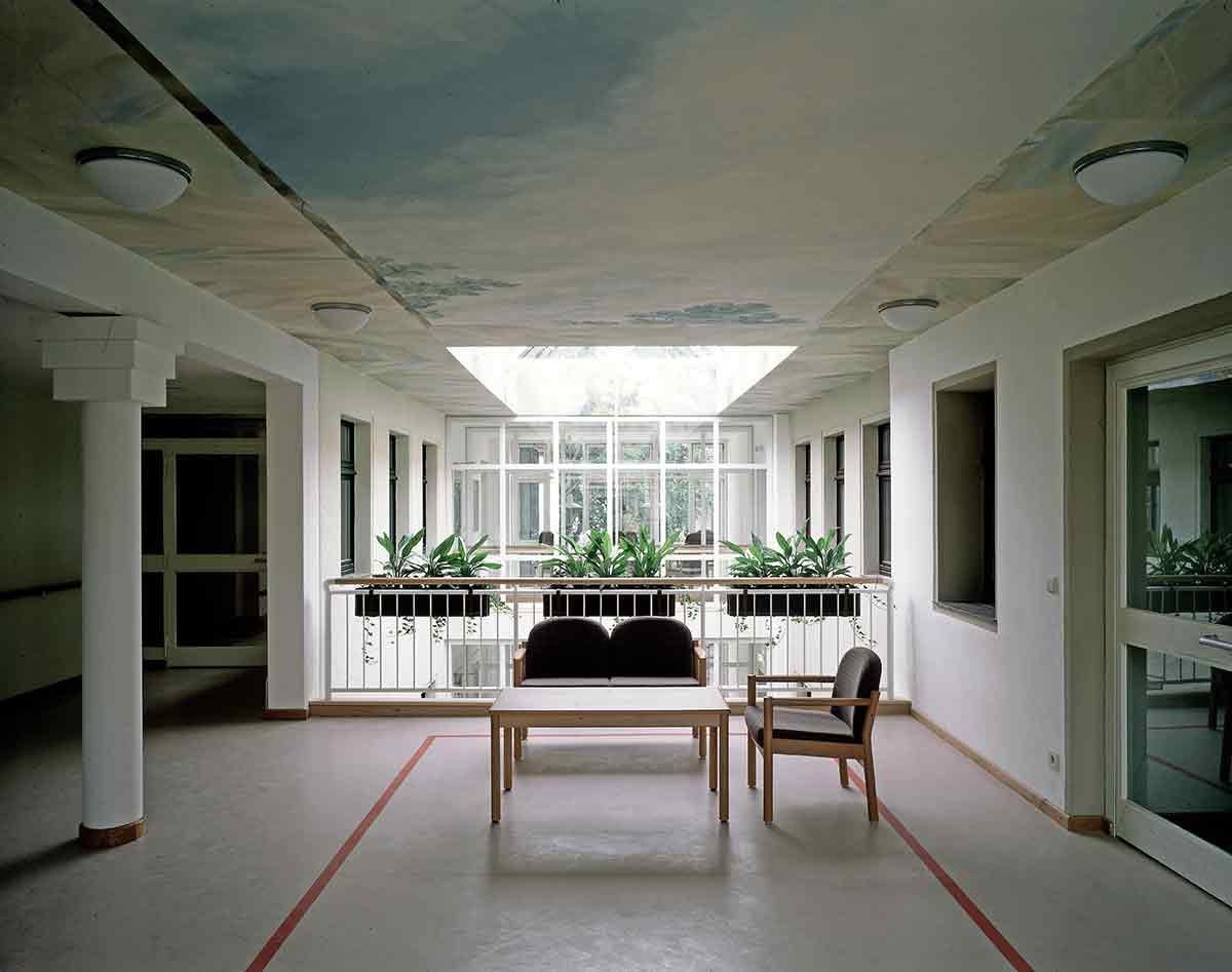 Der Altbau wurde vollständig erhalten, denkmalpflegerisch saniert und als Pflegeheim umgebaut. In seinem Erdgeschoss wurde die Begegnungsstätte eingerichtet. Der Neubau, den wir parallel hinter dem Altbau angeordnet haben, ist in der Mittelachse des Altbaus mit einem gläsernen Zwischenbau angeschlossen, in dem Treppe und Aufzug und die Gemeinschaftsräume sowie der neue Haupteingang untergebracht sind. Die Pflegestationen des Neubaus sind zum Park im Süden orientiert.