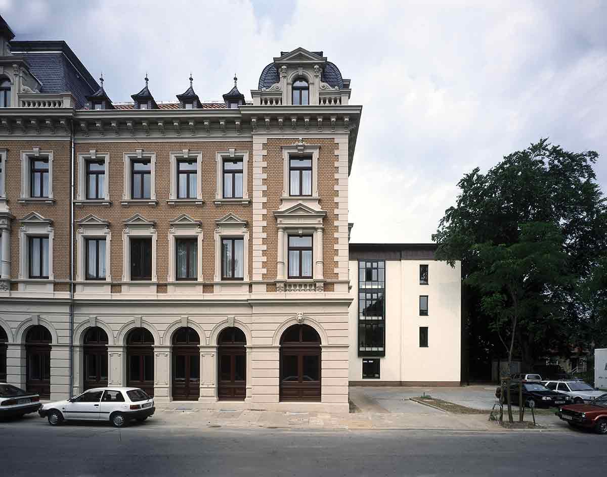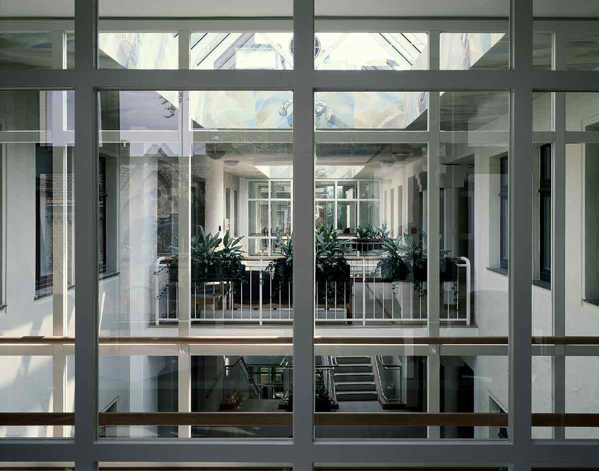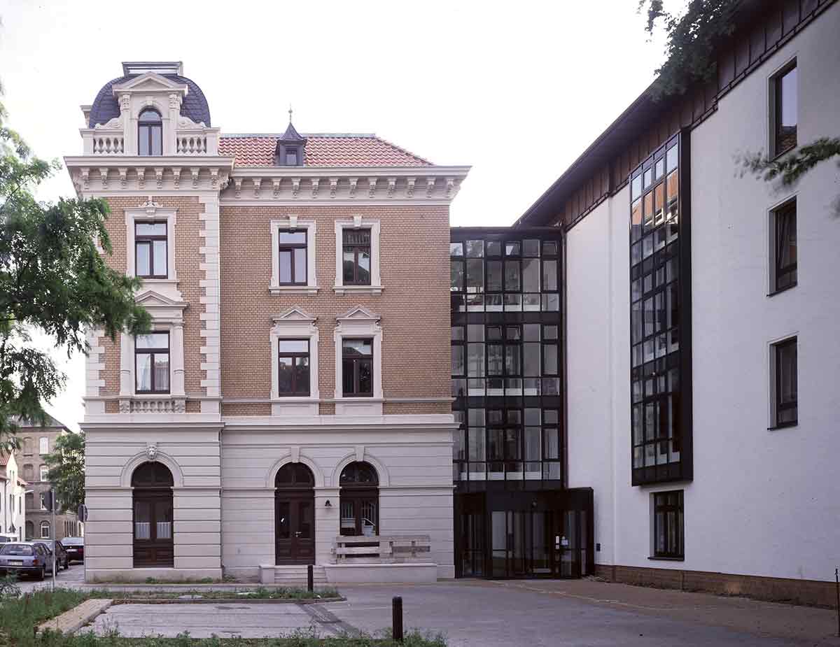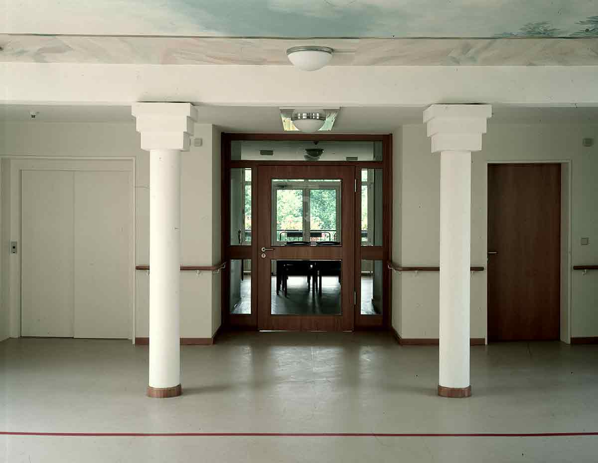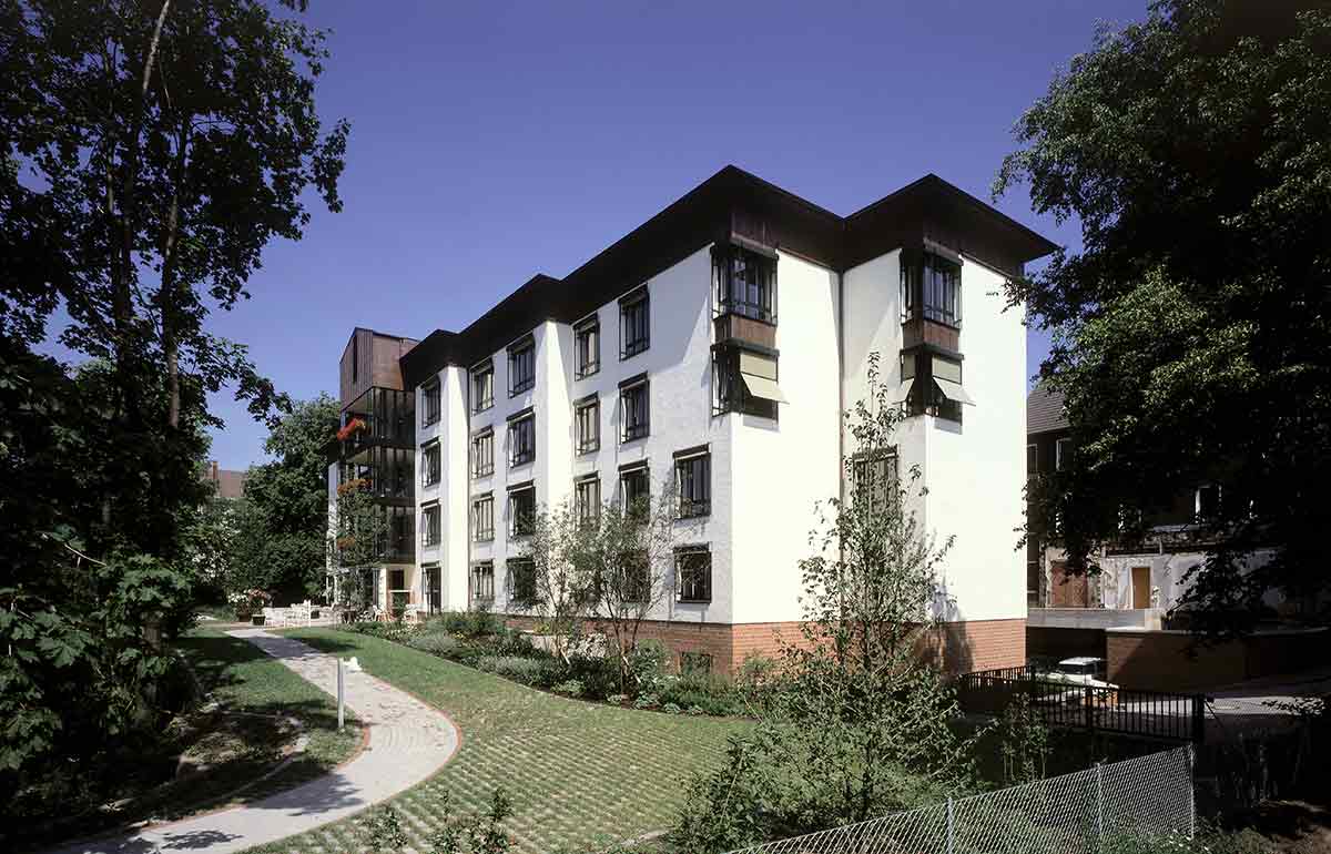 Der Altbau wurde vollständig erhalten, denkmalpflegerisch saniert und als Pflegeheim umgebaut. In seinem Erdgeschoss wurde die Begegnungsstätte eingerichtet. Der Neubau, den wir parallel hinter dem Altbau angeordnet haben, ist in der Mittelachse des Altbaus mit einem gläsernen Zwischenbau angeschlossen, in dem Treppe und Aufzug und die Gemeinschaftsräume sowie der neue Haupteingang untergebracht sind. Die Pflegestationen des Neubaus sind zum Park im Süden orientiert.