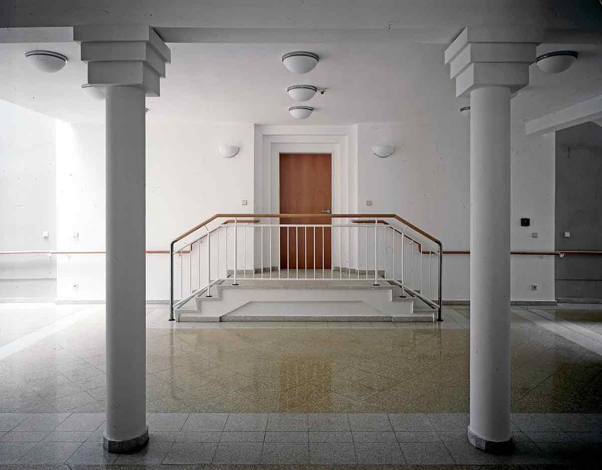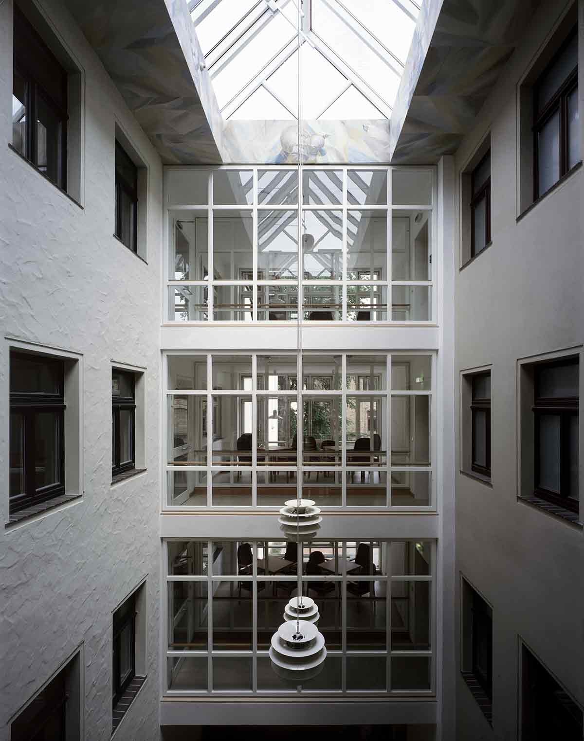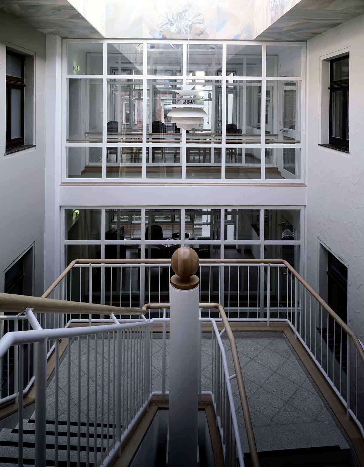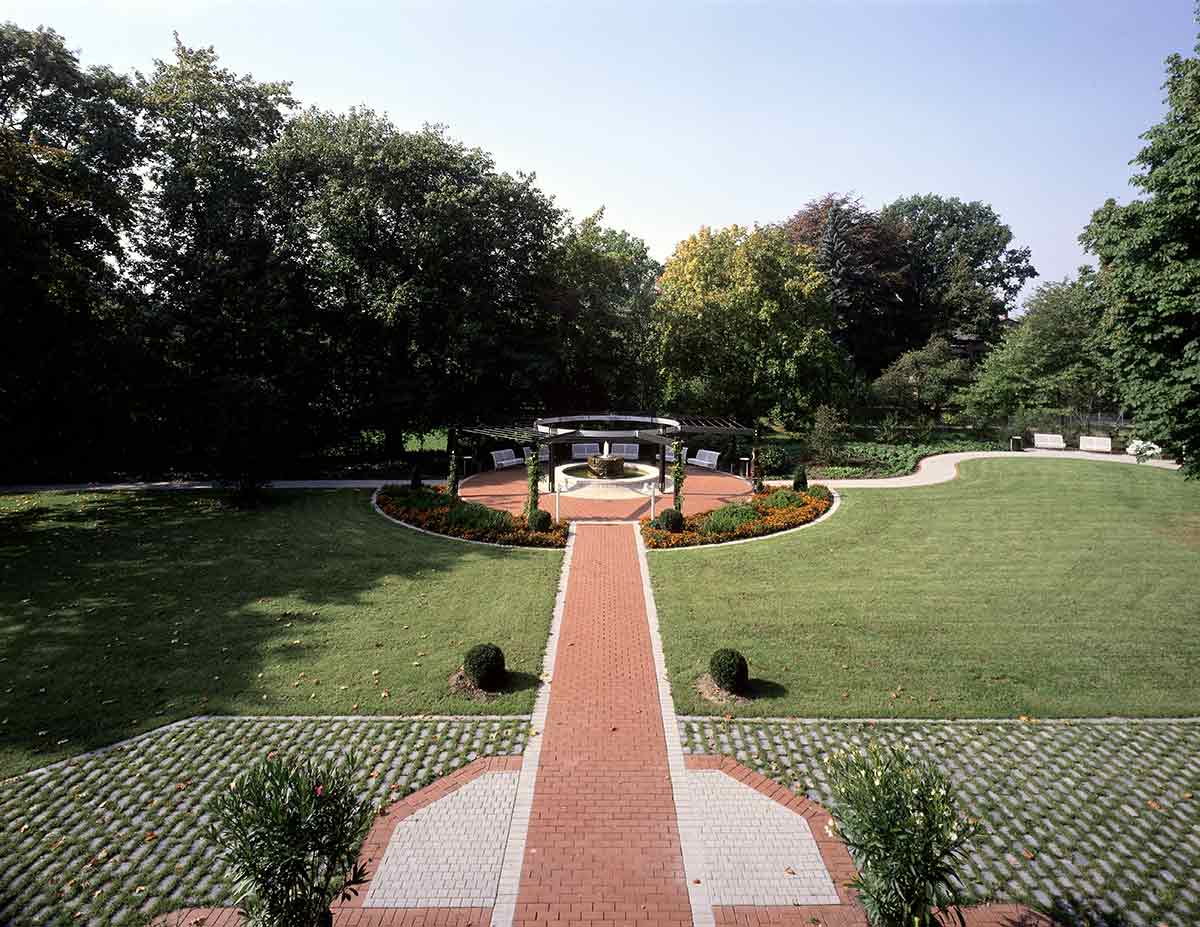 Der Altbau wurde vollständig erhalten, denkmalpflegerisch saniert und als Pflegeheim umgebaut. In seinem Erdgeschoss wurde die Begegnungsstätte eingerichtet. Der Neubau, den wir parallel hinter dem Altbau angeordnet haben, ist in der Mittelachse des Altbaus mit einem gläsernen Zwischenbau angeschlossen, in dem Treppe und Aufzug und die Gemeinschaftsräume sowie der neue Haupteingang untergebracht sind. Die Pflegestationen des Neubaus sind zum Park im Süden orientiert.