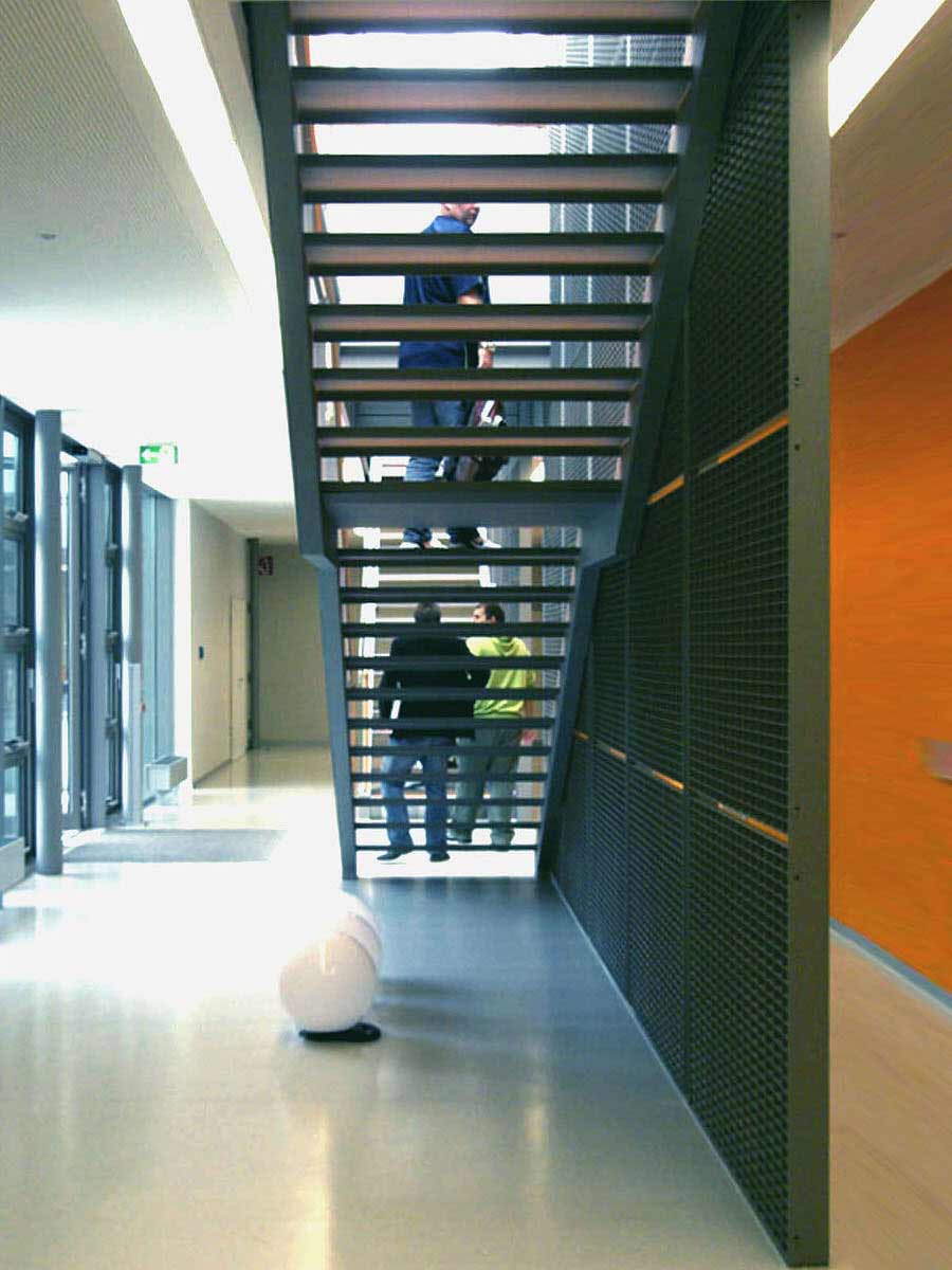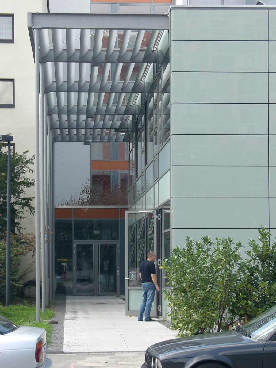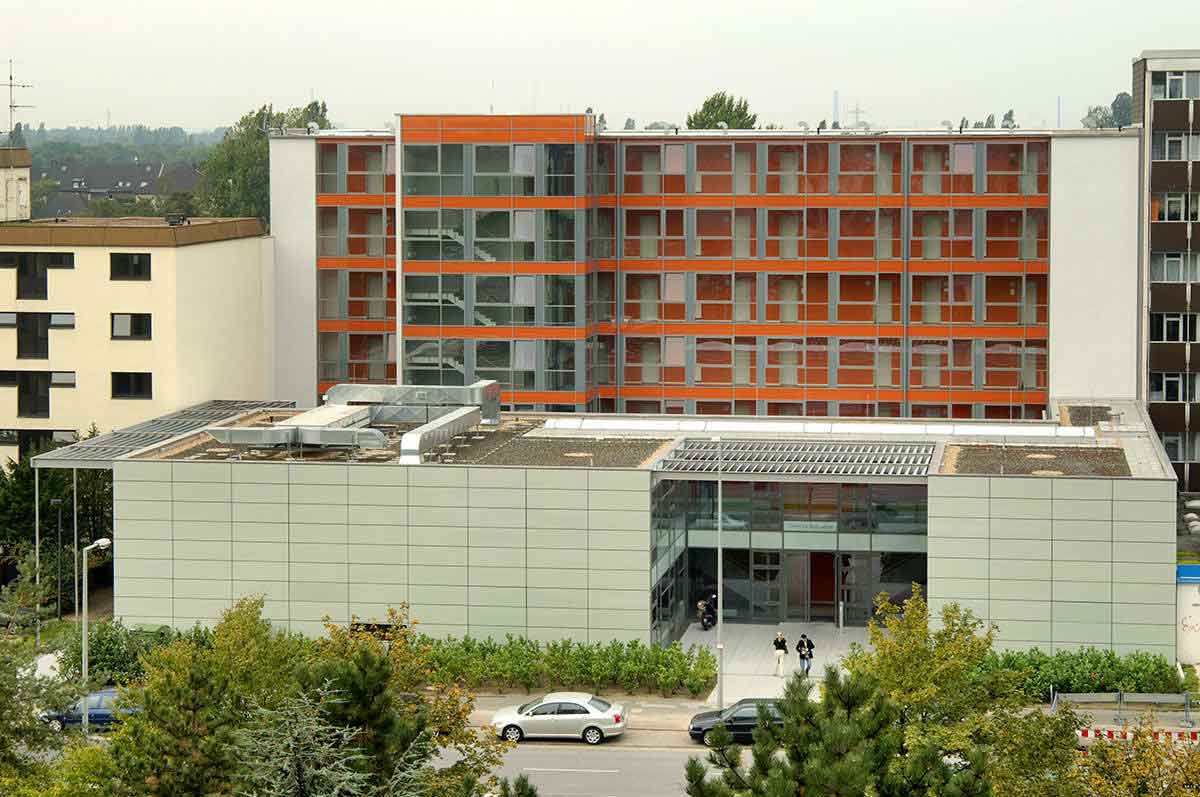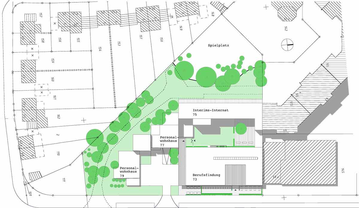 Der Eingang markiert sich als Hofeinschnitt in der vollständig geschlossenen Straßenfassade. Das Erdgeschoss erhält eine Verbindung mit den Gruppenräumen des Internates, so dass die gemeinsame Nutzung möglich ist. Zwischen Berufsfindung und Internat entsteht ein begrünter, ruhiger Pausenhof zusätzlich zum gepflasterten Eingangshof. Aus Zeitgründen wurde das Gebäude als vorgefertigter Modulbau errichtet.
