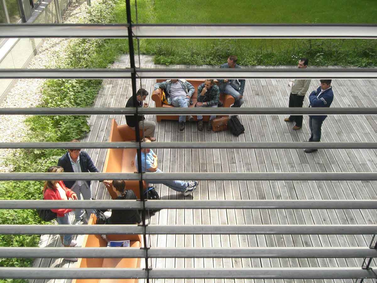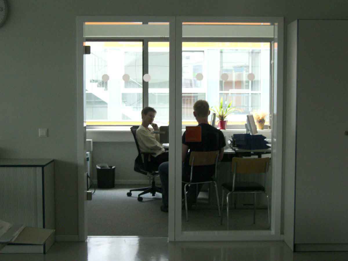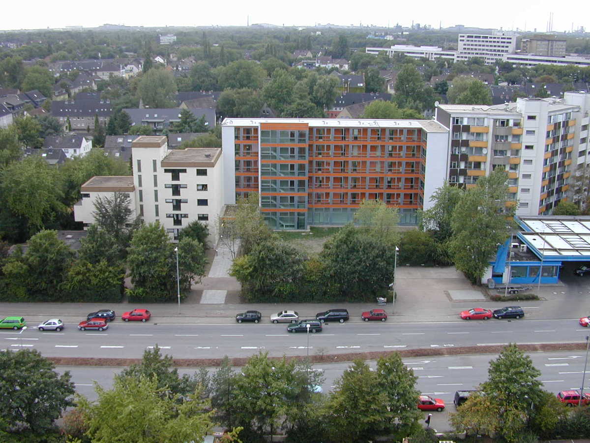 Der Eingang markiert sich als Hofeinschnitt in der vollständig geschlossenen Straßenfassade. Das Erdgeschoss erhält eine Verbindung mit den Gruppenräumen des Internates, so dass die gemeinsame Nutzung möglich ist. Zwischen Berufsfindung und Internat entsteht ein begrünter, ruhiger Pausenhof zusätzlich zum gepflasterten Eingangshof. Aus Zeitgründen wurde das Gebäude als vorgefertigter Modulbau errichtet.