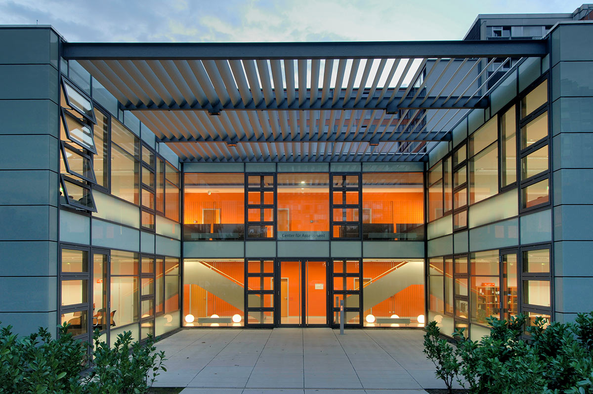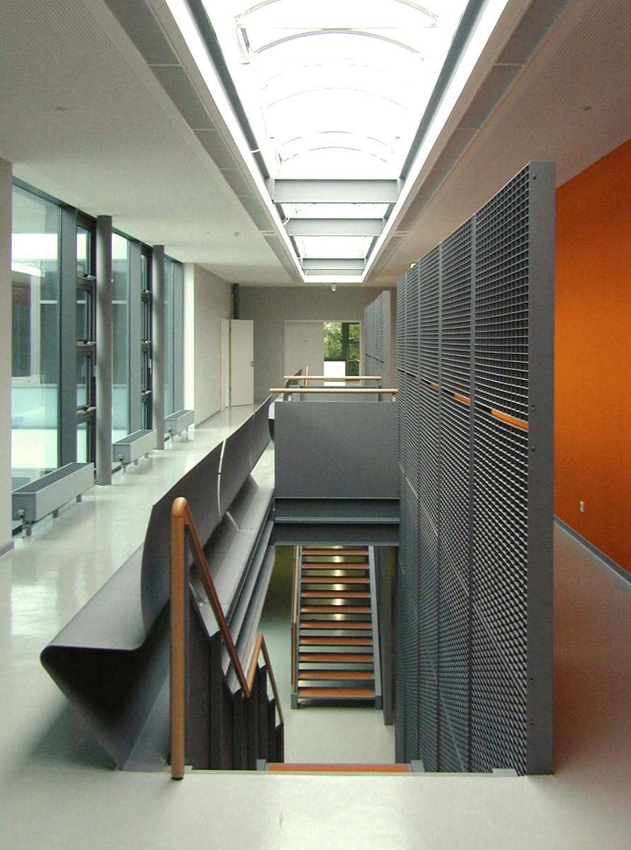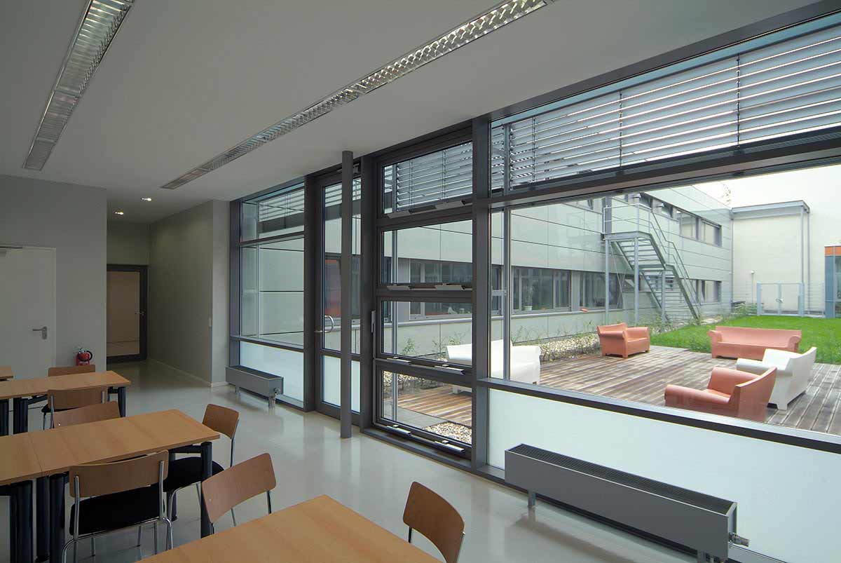 Die Abteilung Berufsfindung sollte in einem passenden Neubau auf eigenem Grundstück untergebracht werden. Das Raumprogramm umfasste große Erprobungssäle, Klassenräume, Büros und Pausenflächen. Der Fertigstellungstermin lag zwingend fest. Wir haben den Neubau als kompakten Bau mit zwei identischen Geschossen vor dem ein Jahr vorher fertig gestellten Internatsneubau platziert.