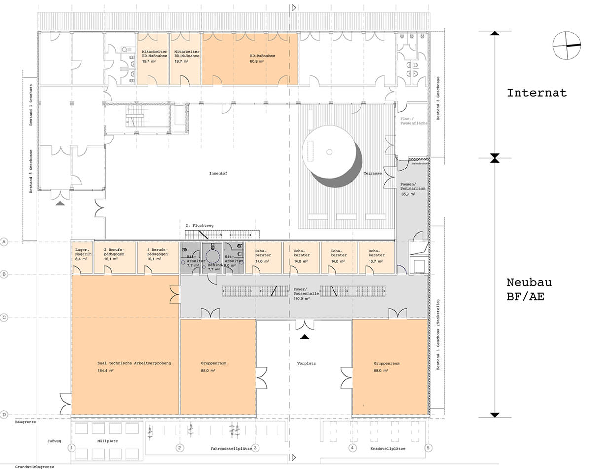 Neubau Abteilung Berufsfindung mit zwei ca. 200 m2 großen Erprobungssälen auch Klassenräume, Trainingsräume, Büros und Pausenfläche |
