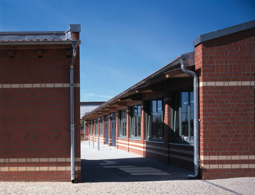 Herstellen des Ausbildungsbetriebes für Bauberufe mit 320 Ausbildungsplätzen in 16 Übungseinheiten. Gliederung des Raumprogramms in vier Werkhallenkomplexe mit je vier Übungseinheiten sowie Schulungs- und Nebenräumen. Leitbild "Schuldorf“, Schulstraße mit kleinteiliger Randbebauung und Übergängen in die Auelandschaft der Saale. Hauptgebäude im Schwerpunkt der Anlage zwischen Internat und Ausbildungsbetrieb. Im Hauptgebäude liegen Mensa, zusätzliche Seminarräume und Verwaltung um eine große Pausenhalle , die gleichzeitig Raum für Veranstaltungen oder Vollversammlungen ist. Gebäudeformen und -materialien sind aus der dörflichen Nachbarschaft entwickelt: Roter und gelber Mauerziegel, Sattel- und Pultdächer als Holzkonstruktion mit rotem Dachziegel.