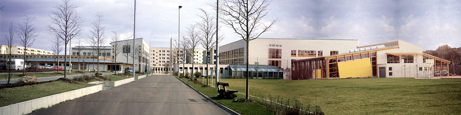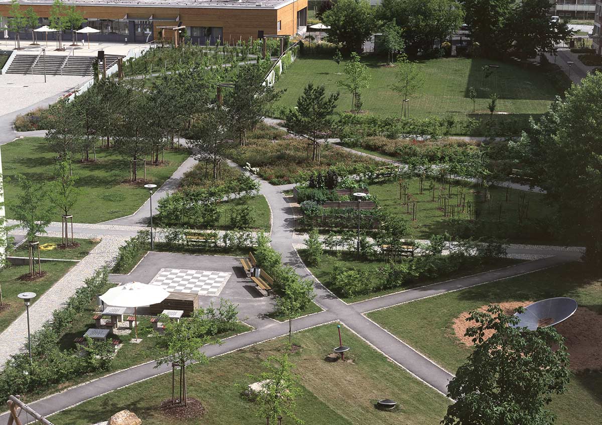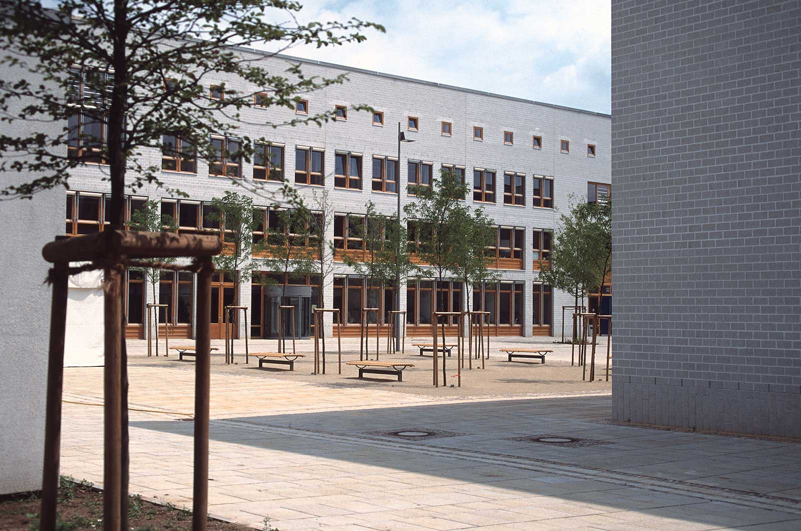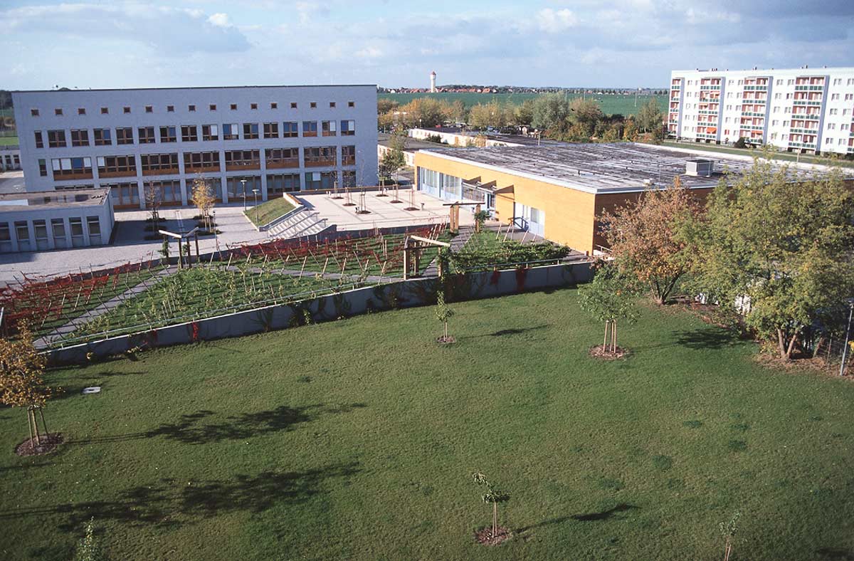 Materialwahl: Qualitätvolle Integration von Alt und Neu. Betonstein und Holz ergänzen die Dämmputzsanierung. Herstellen von Freiräumen mit unterschiedlichem Charakter: "Forum" als Zentrum der Anlage, "Promenade" mit Weinberg zwischen Mensa und Schulen, "Obstgärten" als nutzbare Wohnhöfe