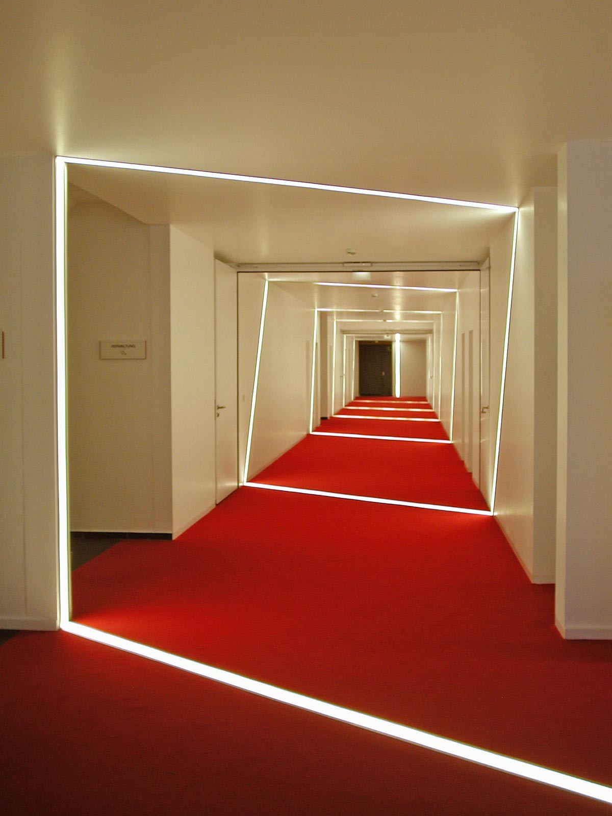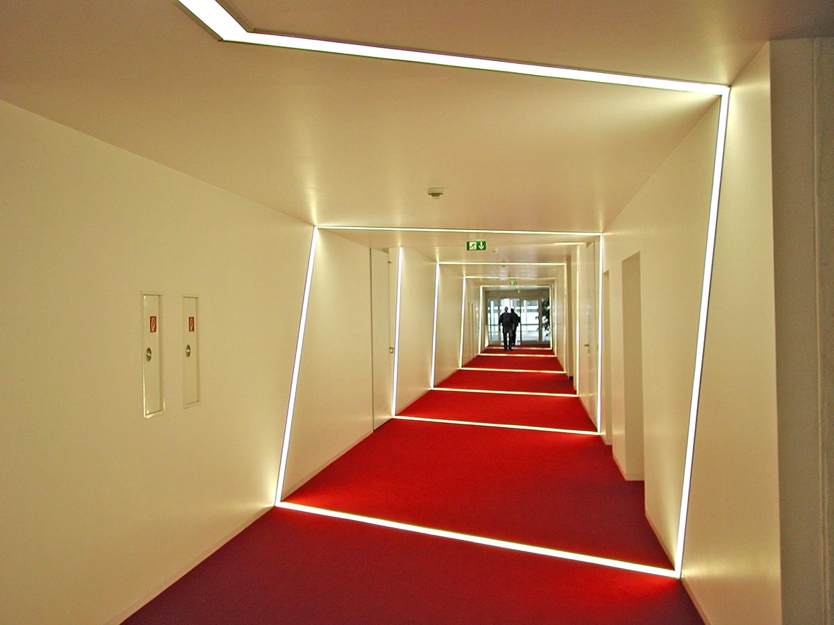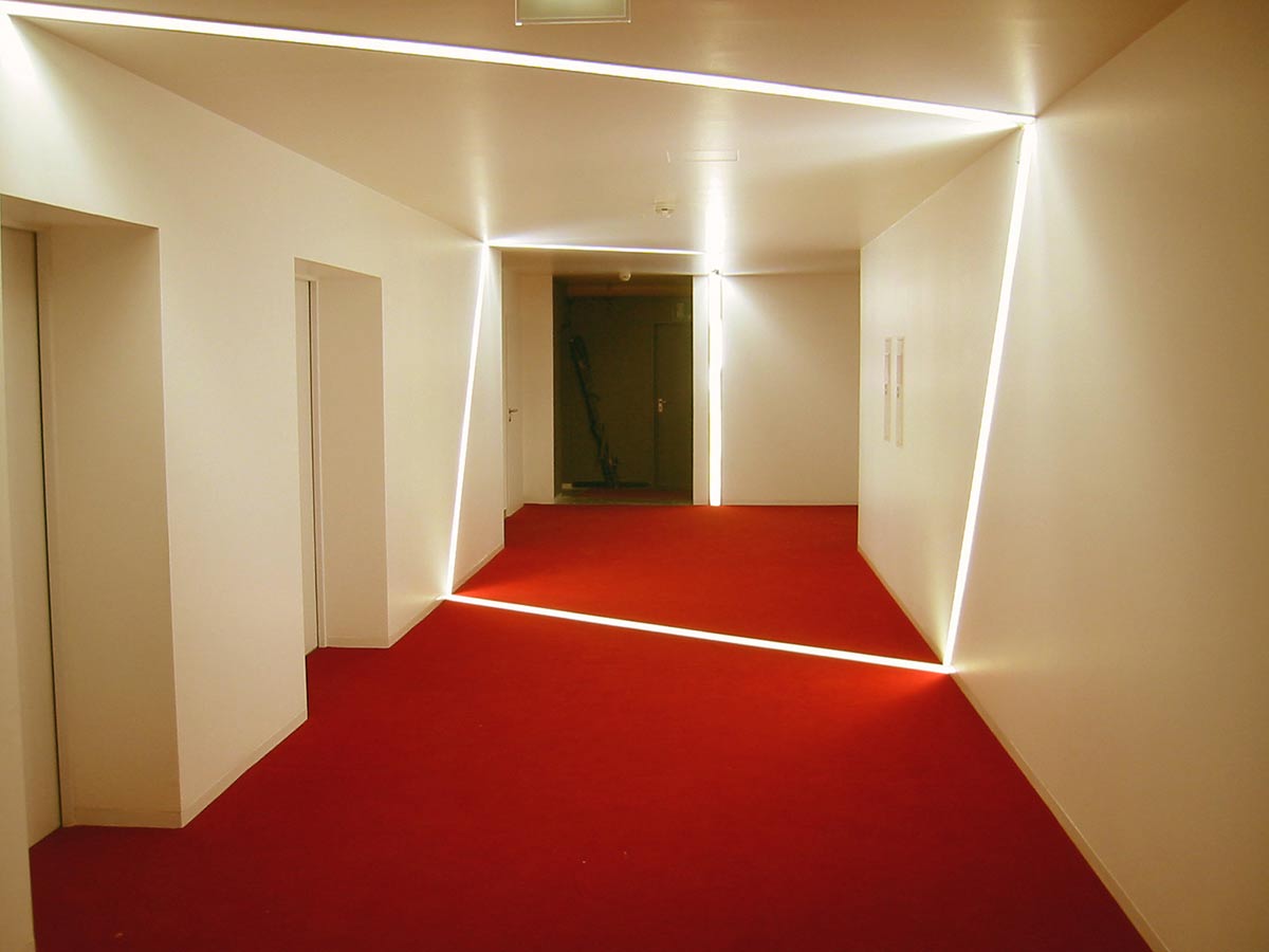 Zunächst rollten wir für den Besucher den roten Teppich aus. Dann beleuchteten wir den Flur mit einer Lichtspirale, die in die Tiefe des Flures leitet. Die Spirale thematisiert das Motiv Bewegung im Raum. Wir arbeiteten im Bestand: Alle Störungen des Flures - Brandschutztüren, Heizkörper, Türen, Treppenaufgänge - wurden in die Abwicklung der Spirale integriert; ein geometrisches Kunststück.