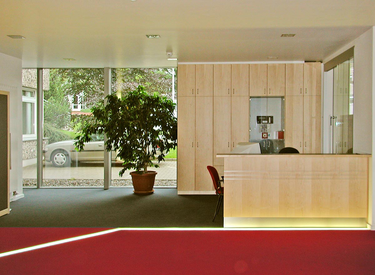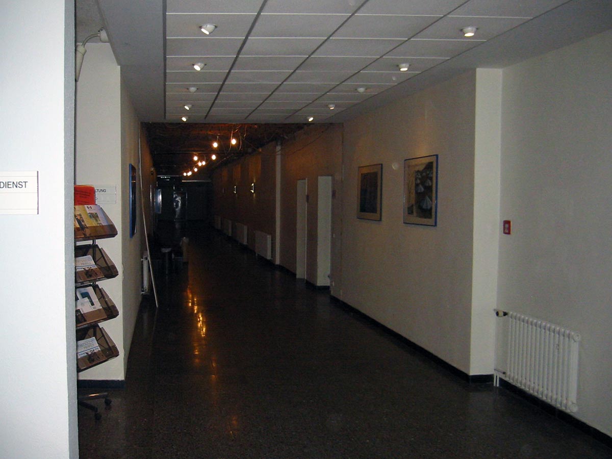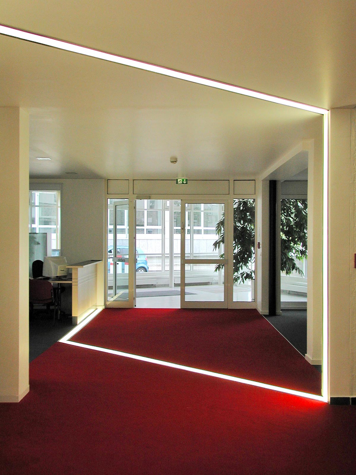 Zunächst rollten wir für den Besucher den roten Teppich aus. Dann beleuchteten wir den Flur mit einer Lichtspirale, die in die Tiefe des Flures leitet. Die Spirale thematisiert das Motiv Bewegung im Raum. Wir arbeiteten im Bestand: Alle Störungen des Flures - Brandschutztüren, Heizkörper, Türen, Treppenaufgänge - wurden in die Abwicklung der Spirale integriert; ein geometrisches Kunststück.