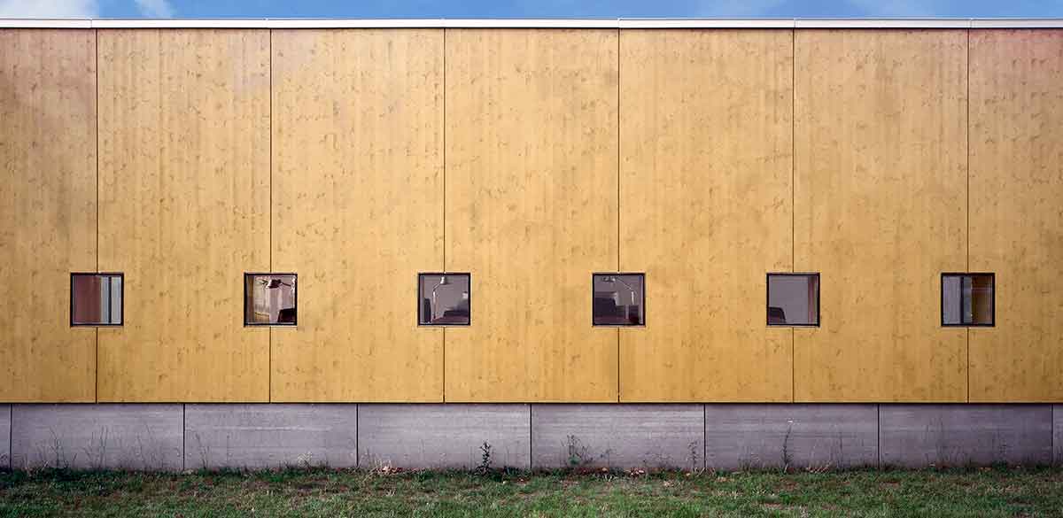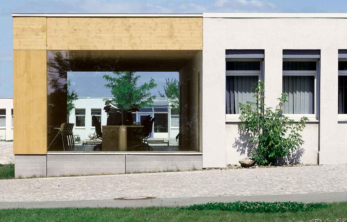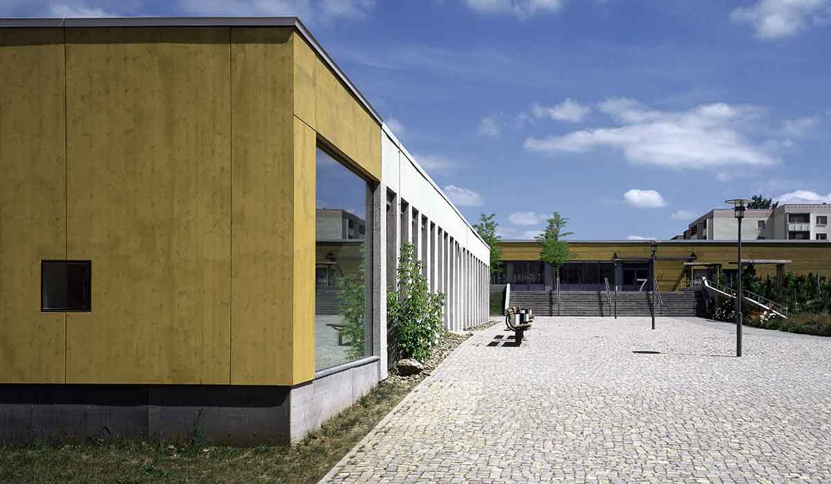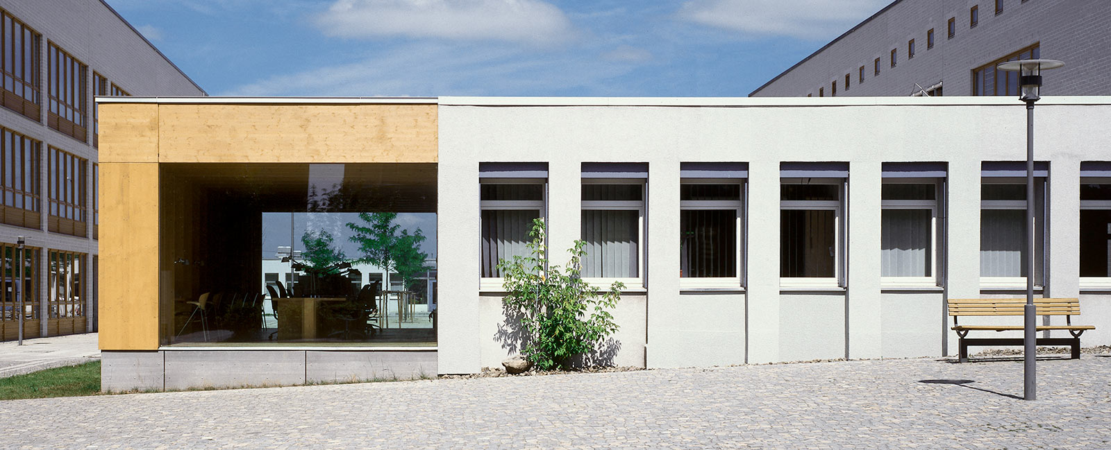 Mit der Fertigstellung der Neubauten am Berufsförderungswerk wurde der erdgeschossige Plattenbau frei, nun genutzt als Kommunikationszentrum für die Umschüler. Die vorhandene Einzelraumstruktur musste erhalten bleiben, deshalb wurde das Gebäude um einen großen Bibliotheksraum ergänzt. Die Ergänzung ist deutlich erkennbar: Ein Winkel lehnt sich an die Giebelwand