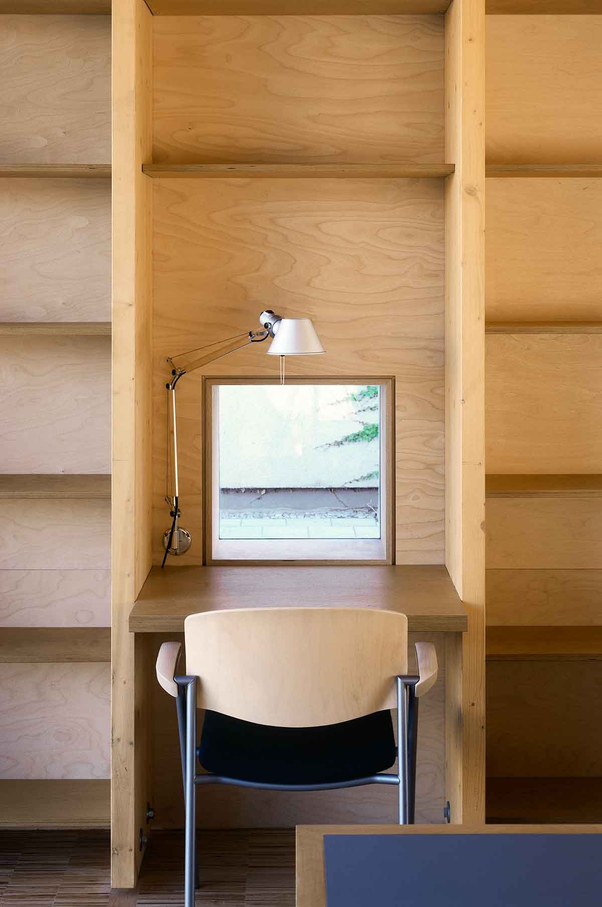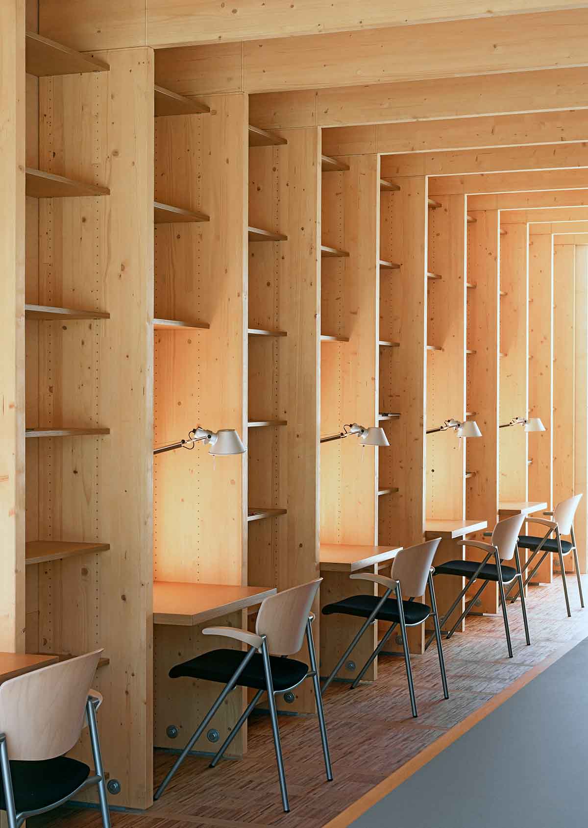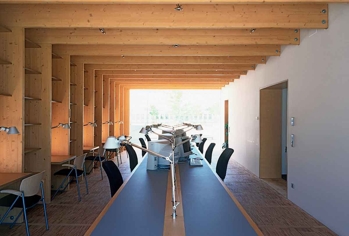 des Plattenbaus. Der Winkel ist aus Holzleimbindern konstruiert, zwischen denen Regalböden und Leseplätze montiert sind. Die Außenwand ist mit Kerto-Platten verkleidet, die Isolierverglasung rahmenlos eingesetzt. Der Raum ist ausgestattet mit einem 9m langen Tisch für Lese- und Internet-Arbeitsplätze, den wir speziell hierfür entworfen haben, und den konventionellen Leseplätzen an der Fassade. Der Anbau wurde als Holzbau einschließlich der Wand- und Deckenplatten vorgefertigt.