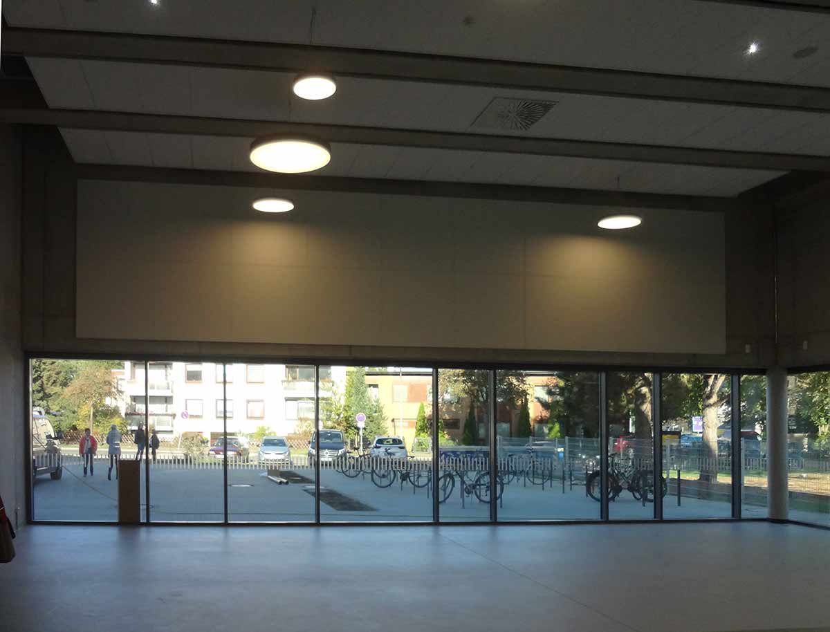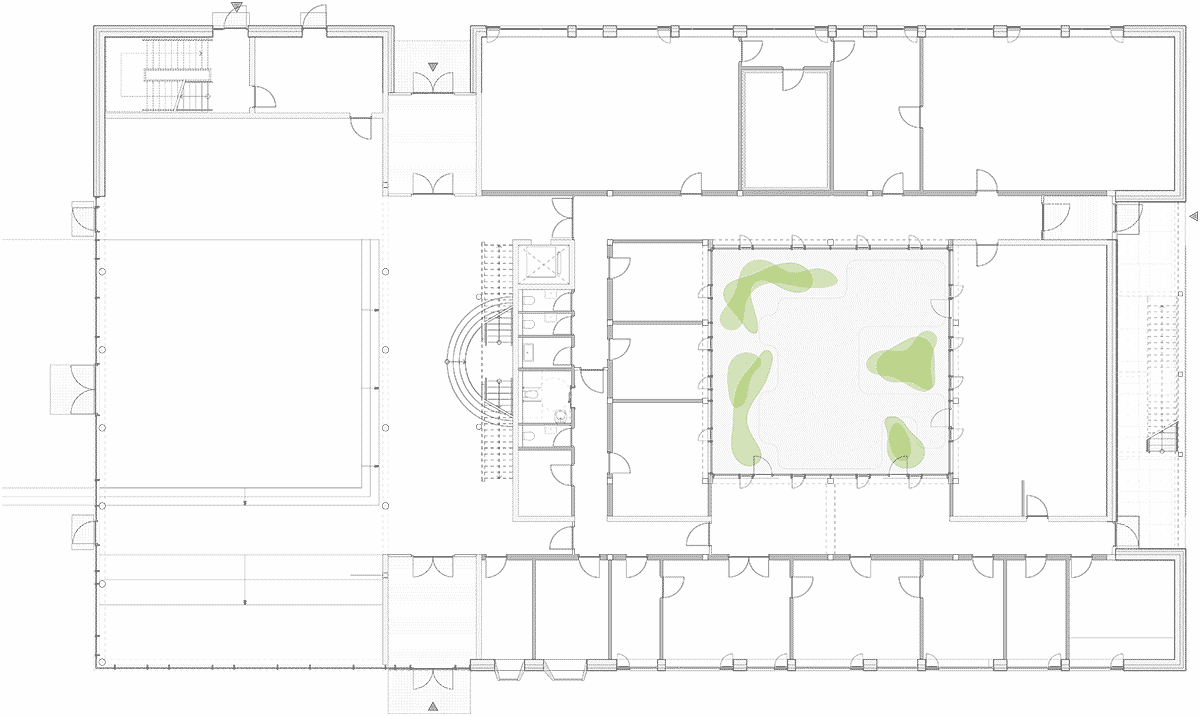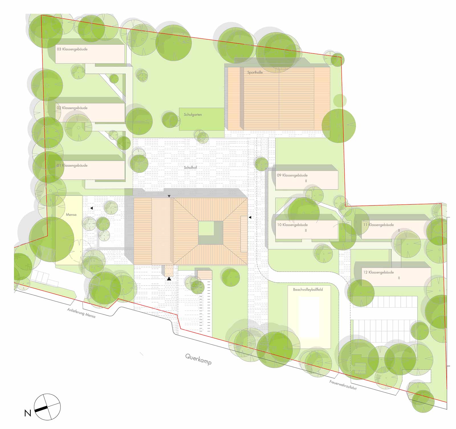 Mit dem Bauteam, bestehend aus der Schulleitung, einer Lehrergruppe und dem Hausmeister haben wir aus dem Flächenprogramm das Raumprogramm erarbeitet und Wünsche der Schule diskutiert und festgelegt. Ein Wunsch war, dass alle Schüler morgens beim Kommen den Eingang des Hauptgebäudes benutzen, dort die aktuellen Informationen erhalten und sich von dort auf dem Schulgelände verteilen. Der Grundriss ist deshalb einfach organisiert: