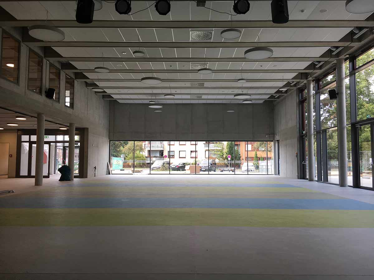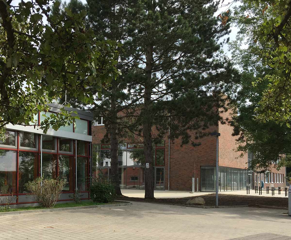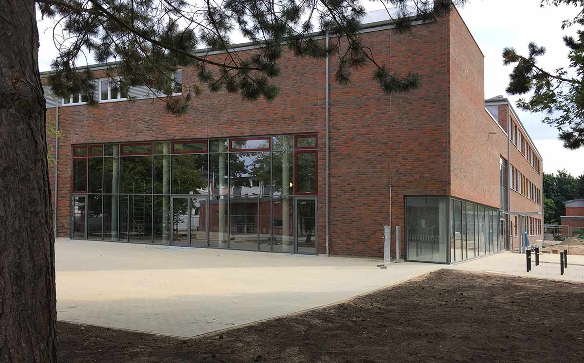 Das Hauptgebäude wird 2018 fertiggestellt, die Zweifeldhalle bis 2020. Das neue Hauptgebäude ist so an der Straße platziert, dass es auf die Maße der Mensa Rücksicht nimmt und gemeinsam mit ihr einen Platz bildet, so dass künftige Schulveranstaltungen Mensa, Platz und Pausenhalle bespielen können.