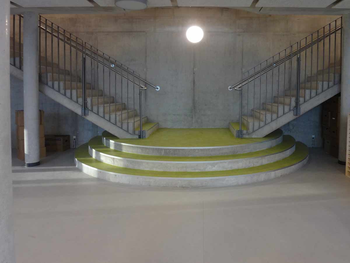 Zwei aus Brandschutzgründen notwendige Treppen liegen jeweils an den Gebäude-Schmalseiten. Über die Treppe an der Pausenhalle wird auch die Hausmeisterwohnung im 2.OG erschlossen, die relativ separat mit Dachterrasse über der Pausenhalle liegt. Das Brandschutzkonzept ist auf der Grundlage der 400 m2-Nutzungseinheiten ausgelegt, dass die Flure vor den Verwaltungsräumen möbliert und genutzt werden können. Notwendige Flure gibt es nur in kleinen Teilbereichen. Planung und Ausführung unterlagen mit einem sehr knappen Budget extremem Kostendruck.