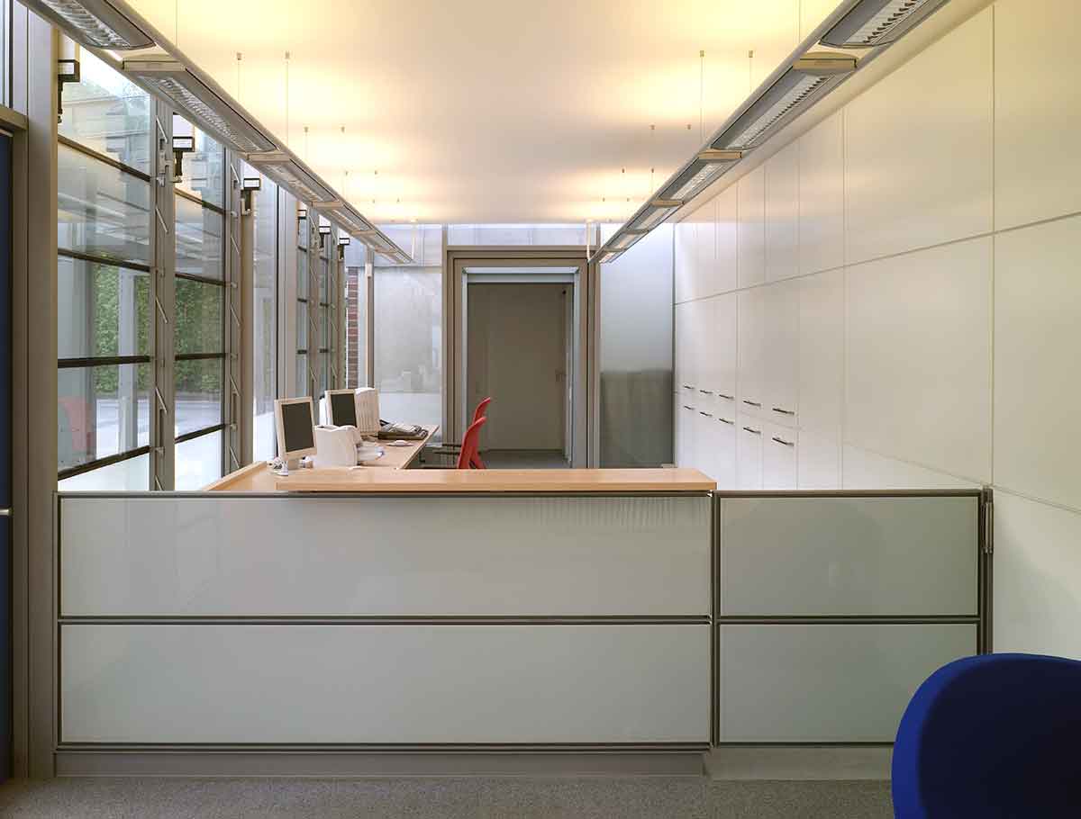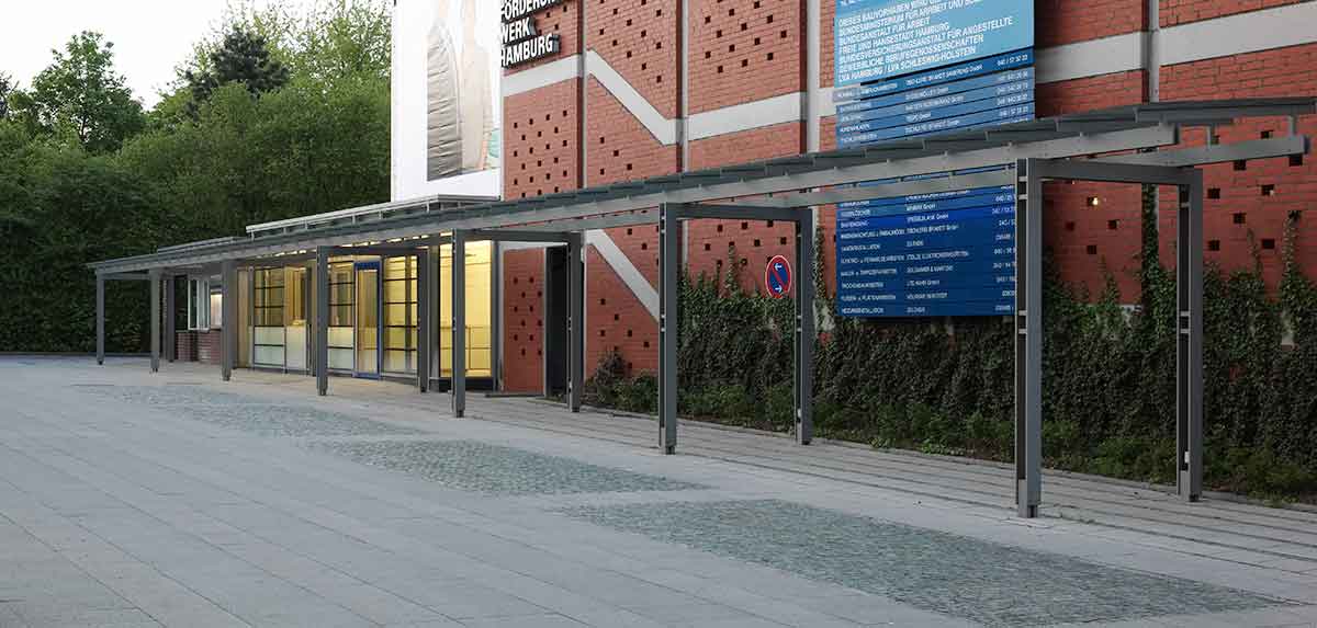 Als erster Bereich sollte die Hauptzufahrt erneuert werden. Das riesige Gelände des BFW bindet wie ein Pfeifenstiel nur mit einem schmalen Stück an das öffentliche Straßensystem an. Von der Straße aus war nur die Stirnseite des Parkhauses erkennbar. Ungepflegte Hecken entlang des Fußweges machten die Zufahrt fast unkenntlich. Inmitten der von Hecken und Vorgärten geprägten Nachbarschaft haben wir eine frei von der Straße einsehbare Vorfahrt als gepflasterten Platz geschaffen. Beleuchtete Hinweisschilder und Vitrinen parallel zum Fußweg weisen auf das BFW hin, Bänke grenzen die Fahrfläche vom Fußgängerbereich ab. Als weiterer Schritt wurde vor dem Parkhaus ein kleines, gläsernes Empfangsgebäude für Besucher errichtet.