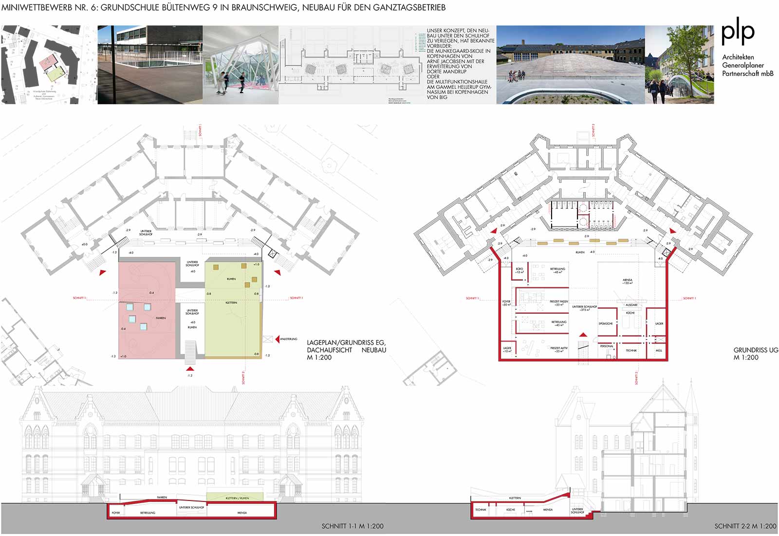 Im Rahmen eines VgV-Verfahrens forderte die Stadt Braunschweig zu einem Vorentwurfskonzept auf. Das Raumprogramm umfasste Mensa mit Küche und Nebenräumen sowie die Räume für die Ganztagsbetreuung.