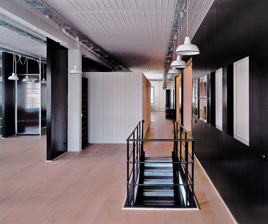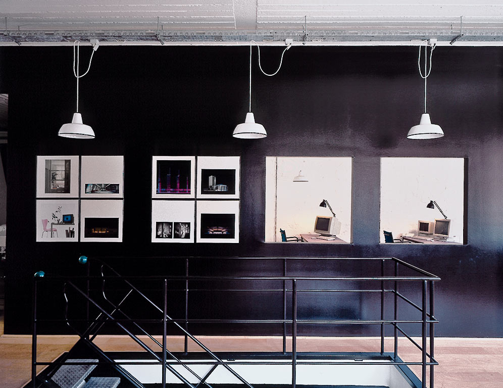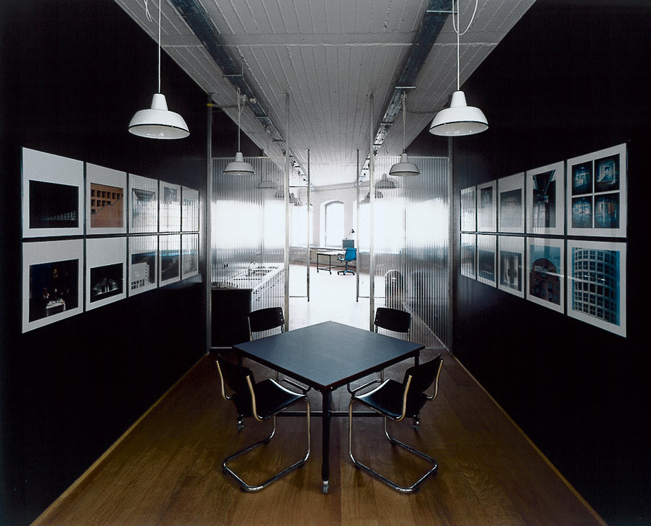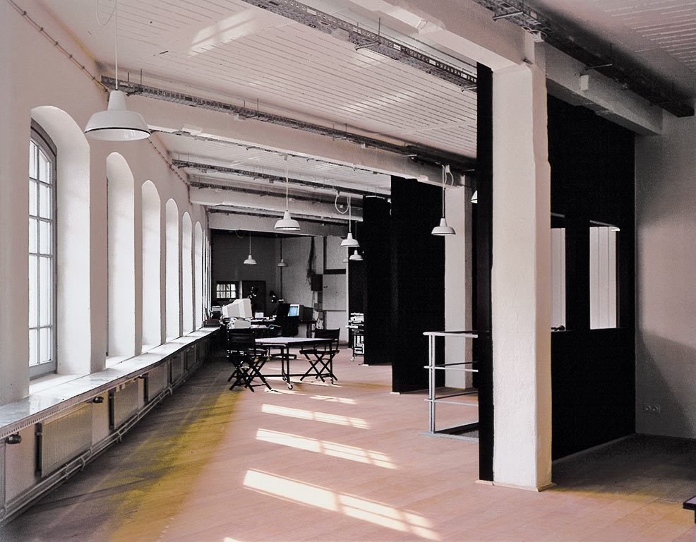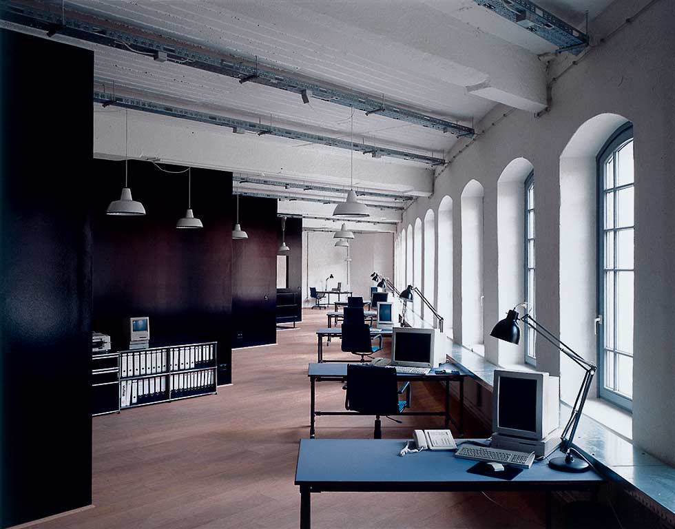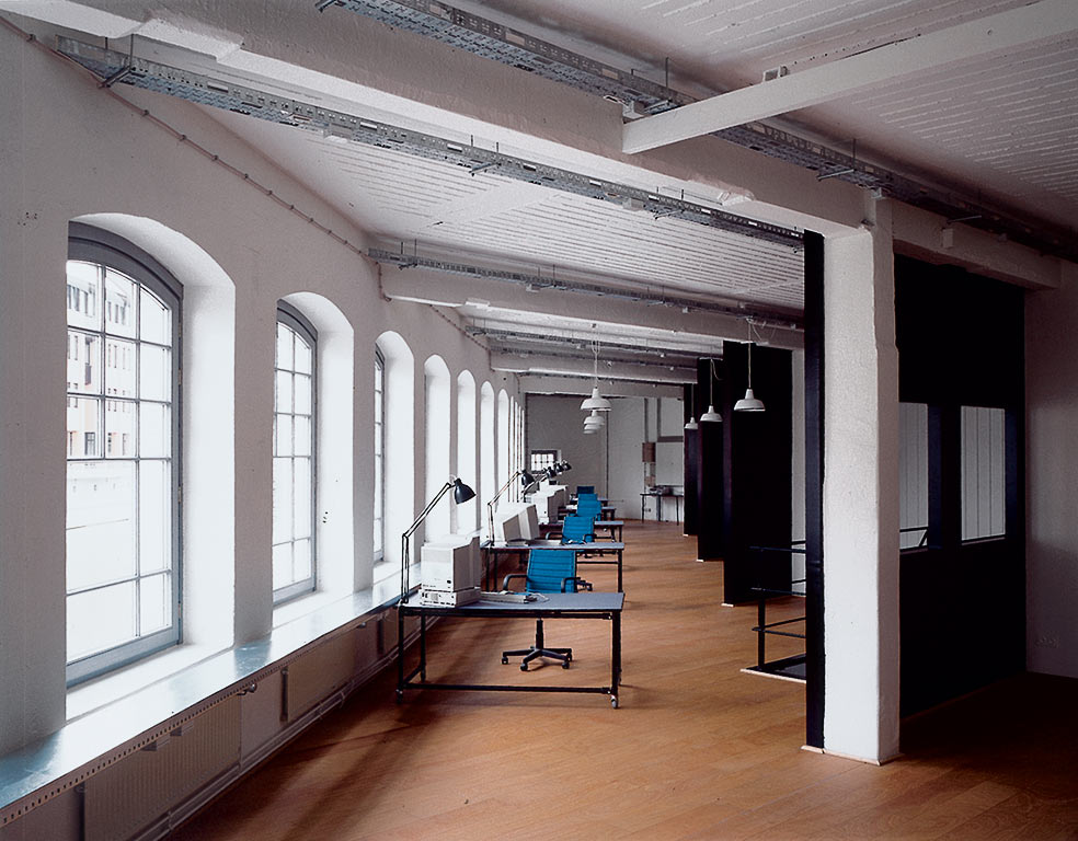 Der Auftraggeber, Fotograf und gleichzeitig Inhaber einer Softwarefirma, brauchte mehr Platz. Auf der Fläche einer Tischlerwerkstatt konnte das Raumprogramm realisiert werden ohne die Fläche in Räume aufteilen zu müssen.
