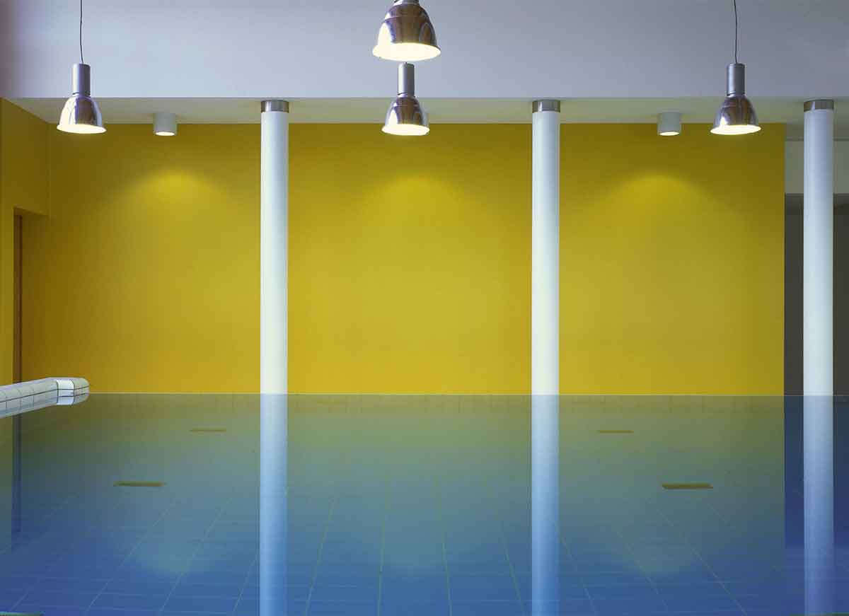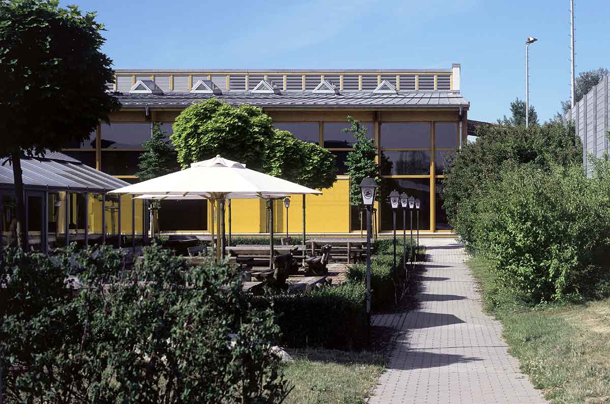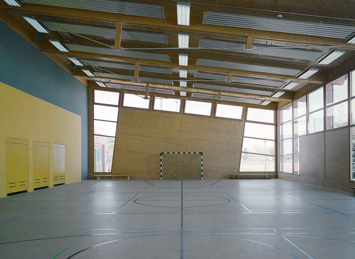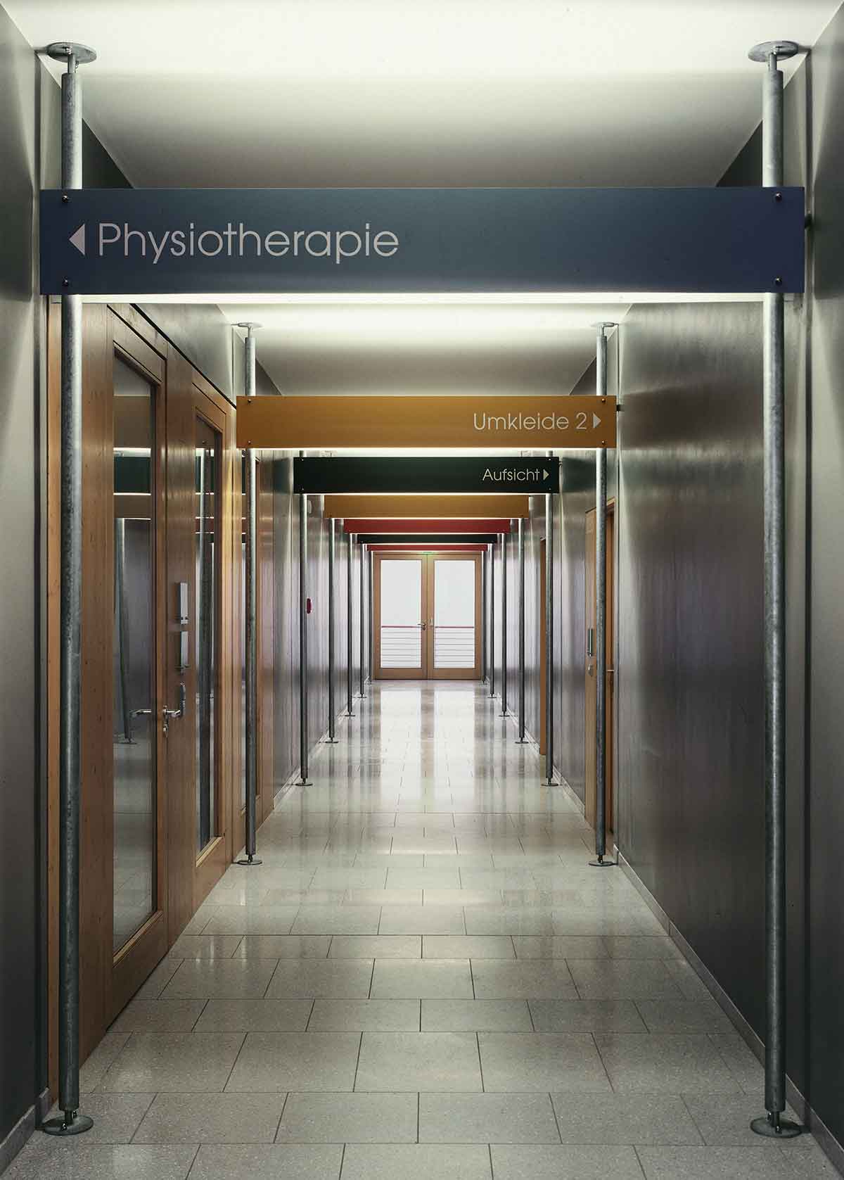 Ausbilden eines kompakten, dreischiffigen Baukörpers, der alle Nutzungen unter einem großen Dach vereint. Im massiven Mittelschiff sind alle kleinräumigen Nutzungen untergebracht (Umkleiden, WC, Nebenräume), daran lehnen sich - zum Forum sichtbar – die Gymnastikhalle und - nach Süden, zum Grünen - die Therapiehalle mit Becken und Bädereinrichtungen. Behindertengerechtes Bauen bis hin zur Saunanutzung. Einbinden des Baukörpers in das geplante städtebauliche Ensemble.