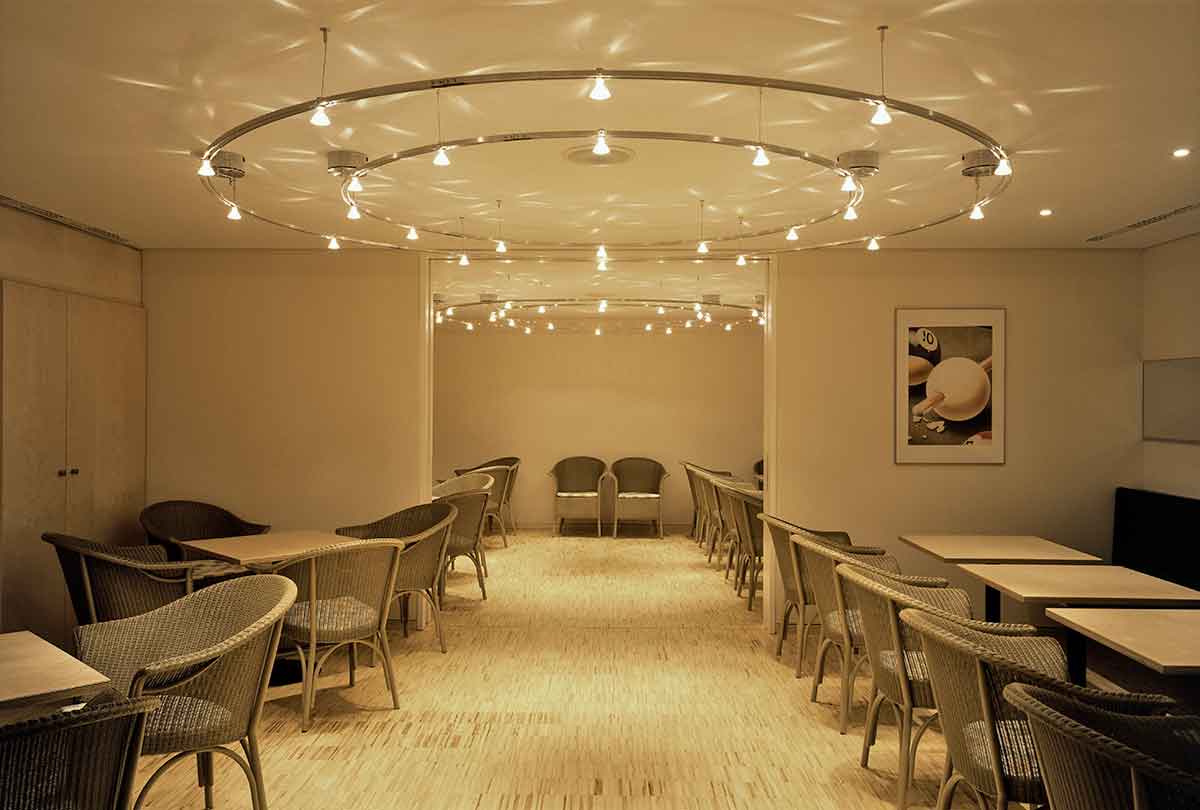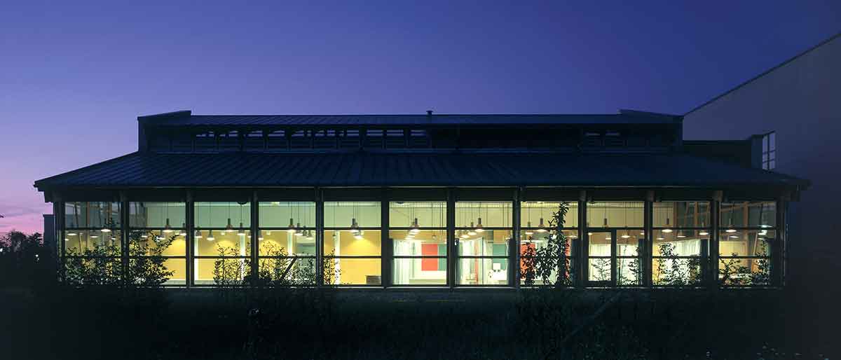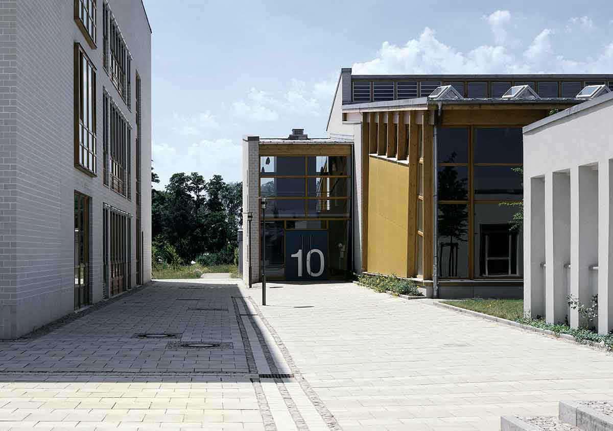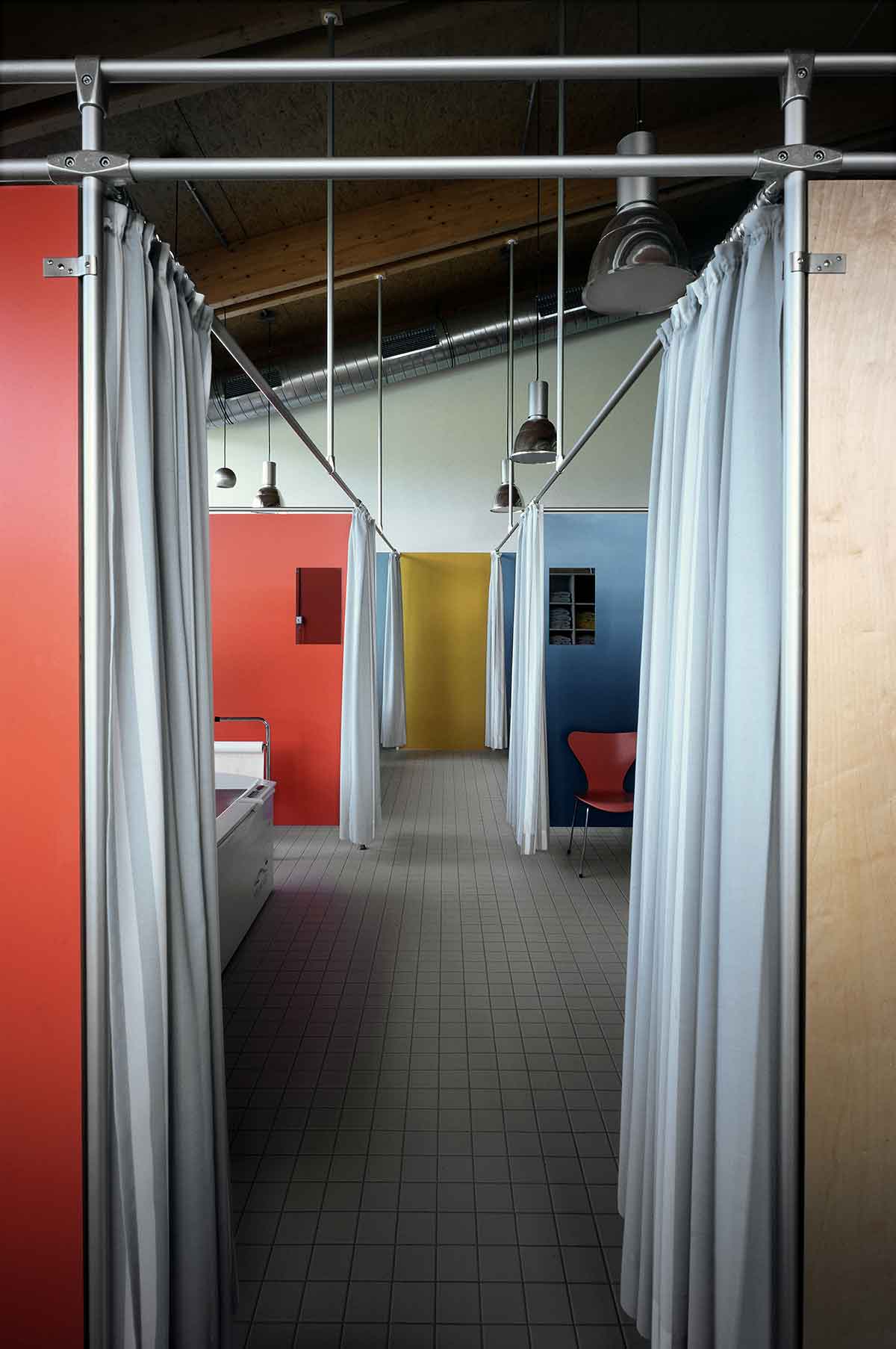 Ausbilden eines kompakten, dreischiffigen Baukörpers, der alle Nutzungen unter einem großen Dach vereint. Im massiven Mittelschiff sind alle kleinräumigen Nutzungen untergebracht (Umkleiden, WC, Nebenräume), daran lehnen sich - zum Forum sichtbar – die Gymnastikhalle und - nach Süden, zum Grünen - die Therapiehalle mit Becken und Bädereinrichtungen. Behindertengerechtes Bauen bis hin zur Saunanutzung. Einbinden des Baukörpers in das geplante städtebauliche Ensemble.