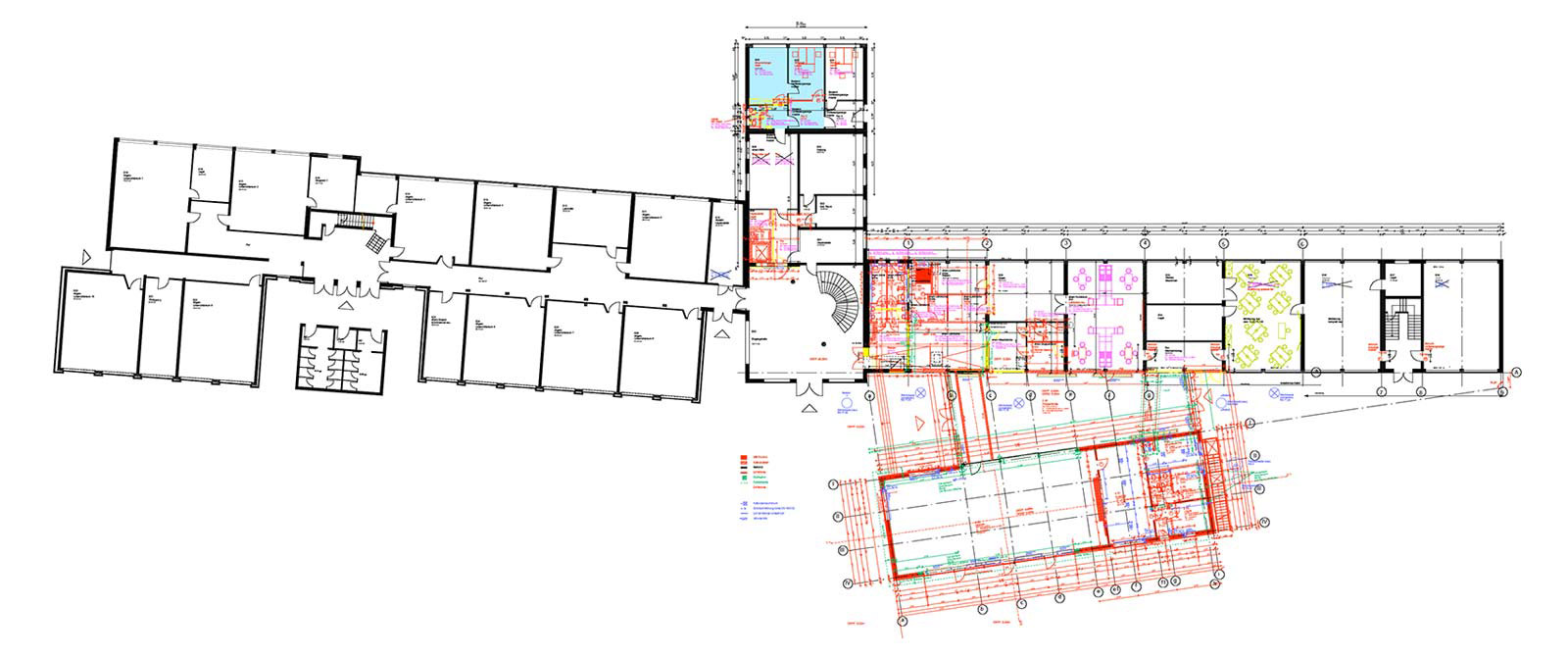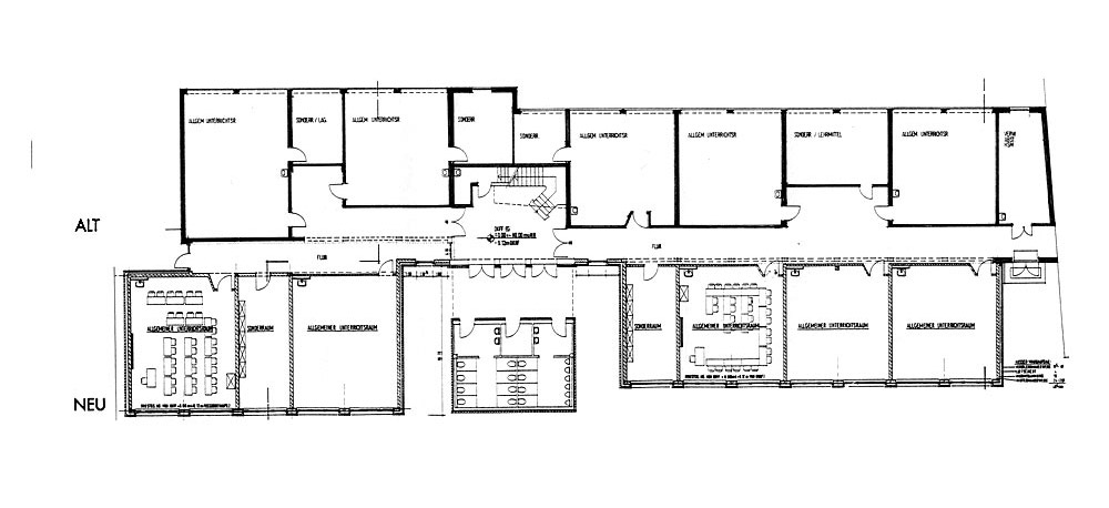 Wir hatten an der Schule Rothenburg bereits Anfang der 90er die erste Schulerweiterung mit Klassenräumen und zentralen WC-Anlagen geplant. Diesmal führten wir an der Schule das Planungskonzept des Hochbauamtes weiter und setzten es in baubare Pläne um. Wichtig war für die Stadt die schnelle, problemlose und kostengünstige Abwicklung der Baumaßnahme während des möglichst störungsfreien Schulbetriebes bei der Realisierung des durchaus ehrgeizigen Entwurfskonzeptes.