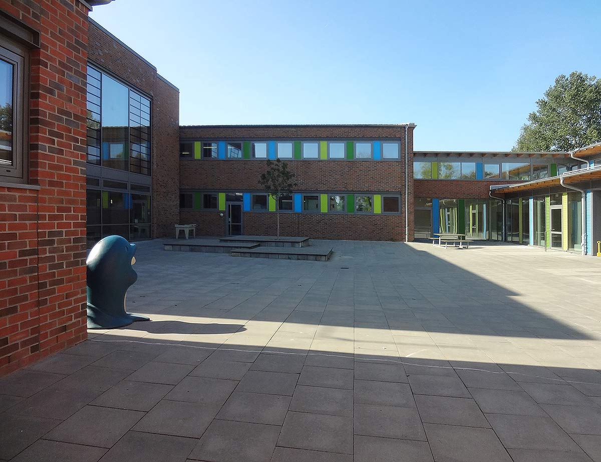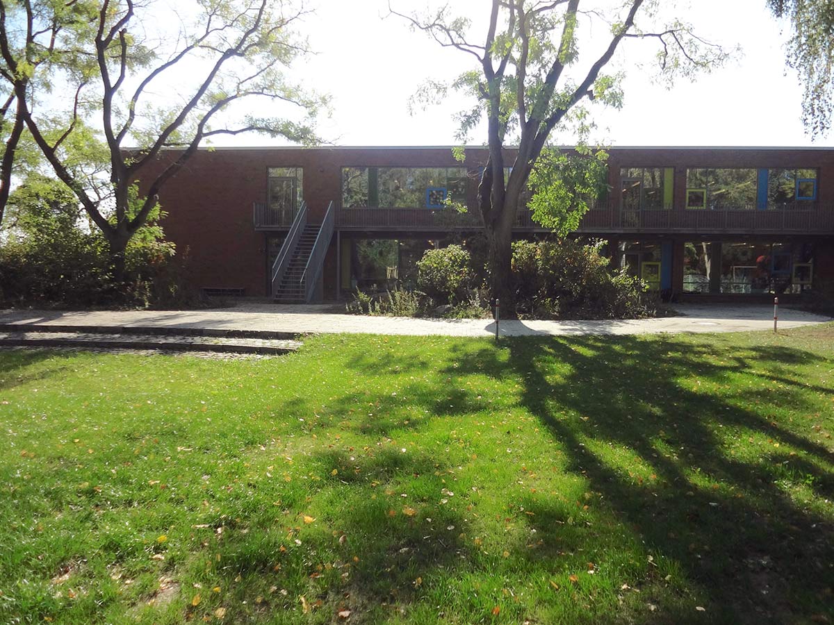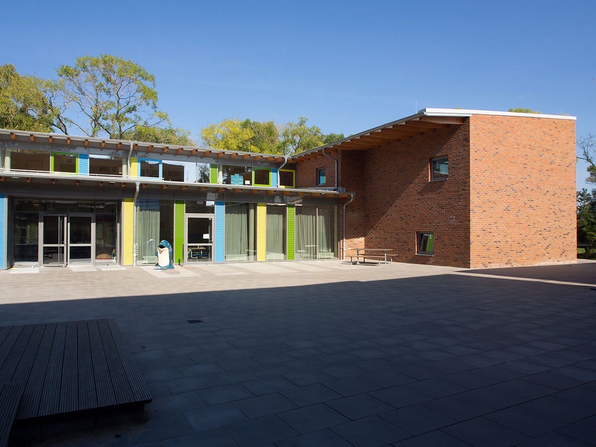 Als 2. Bauabschnitt wurde nach Abbruch der Klassenpavillons und -häuser ein kompakter Baukörper mit allgemeinen Unterrichtsräumen, Küche und Speiseversorgung angebaut. Der Neubau ist ein U-förmiger, symmetrischer Baukörper mit mittigem Eingang, dessen einer Flügel an den Altbau andockt. Der Versatz in der Gebäudeflucht zum Bestand begründet sich durch den Neubau in der Flucht des abgebrochenen Klassenhauses auf der alten Pfahlgründung. Alt- und Neubau umschließen einen kleinen, seitlich offenen Hof, der zwischen Pausenhalle und Mensa liegt und bei Schulfesten mit genutzt wird. Die eigentliche Pausenfläche liegt als landschaftlich gestaltetes Freigelände im Norden und Osten des Neubaus.