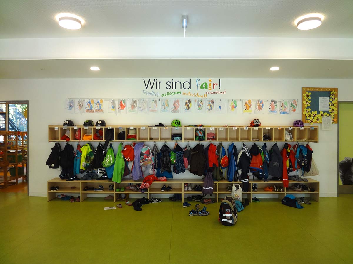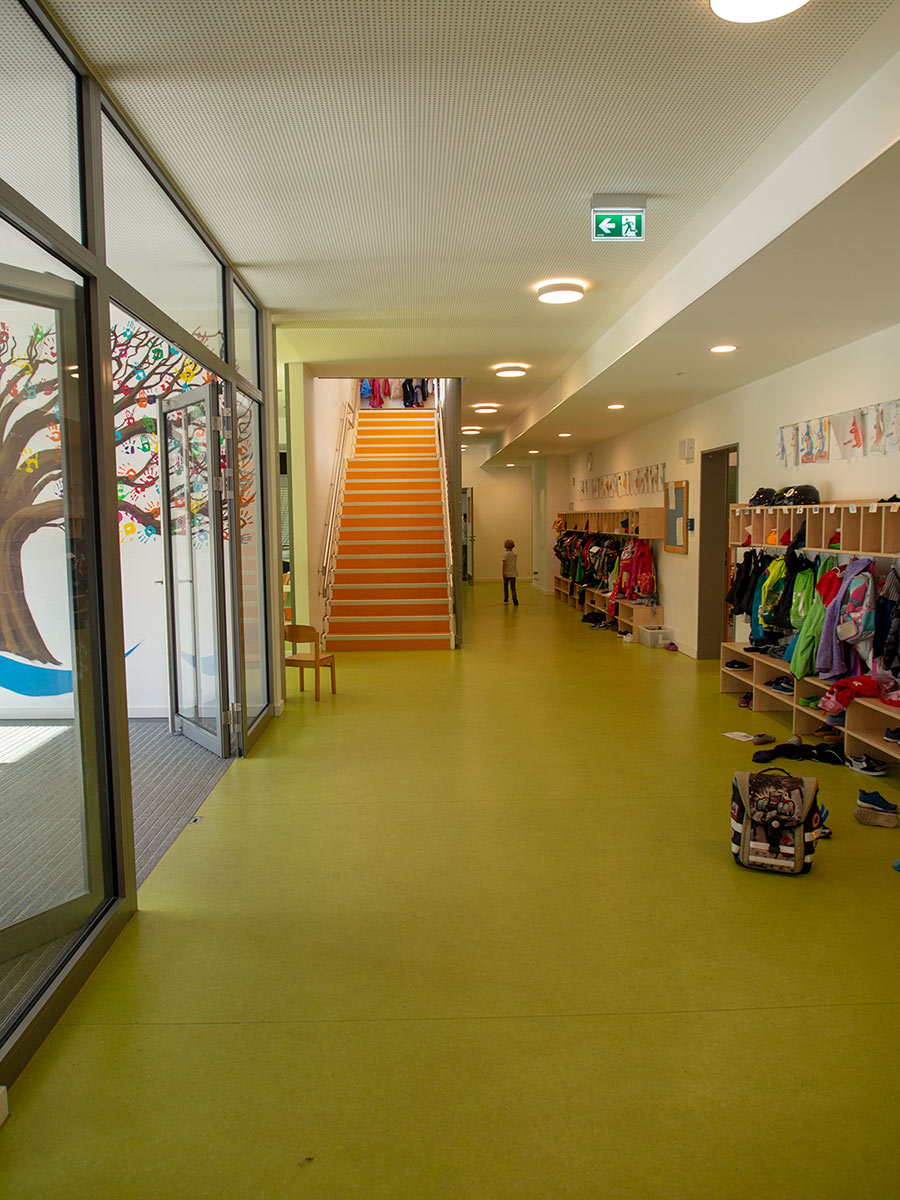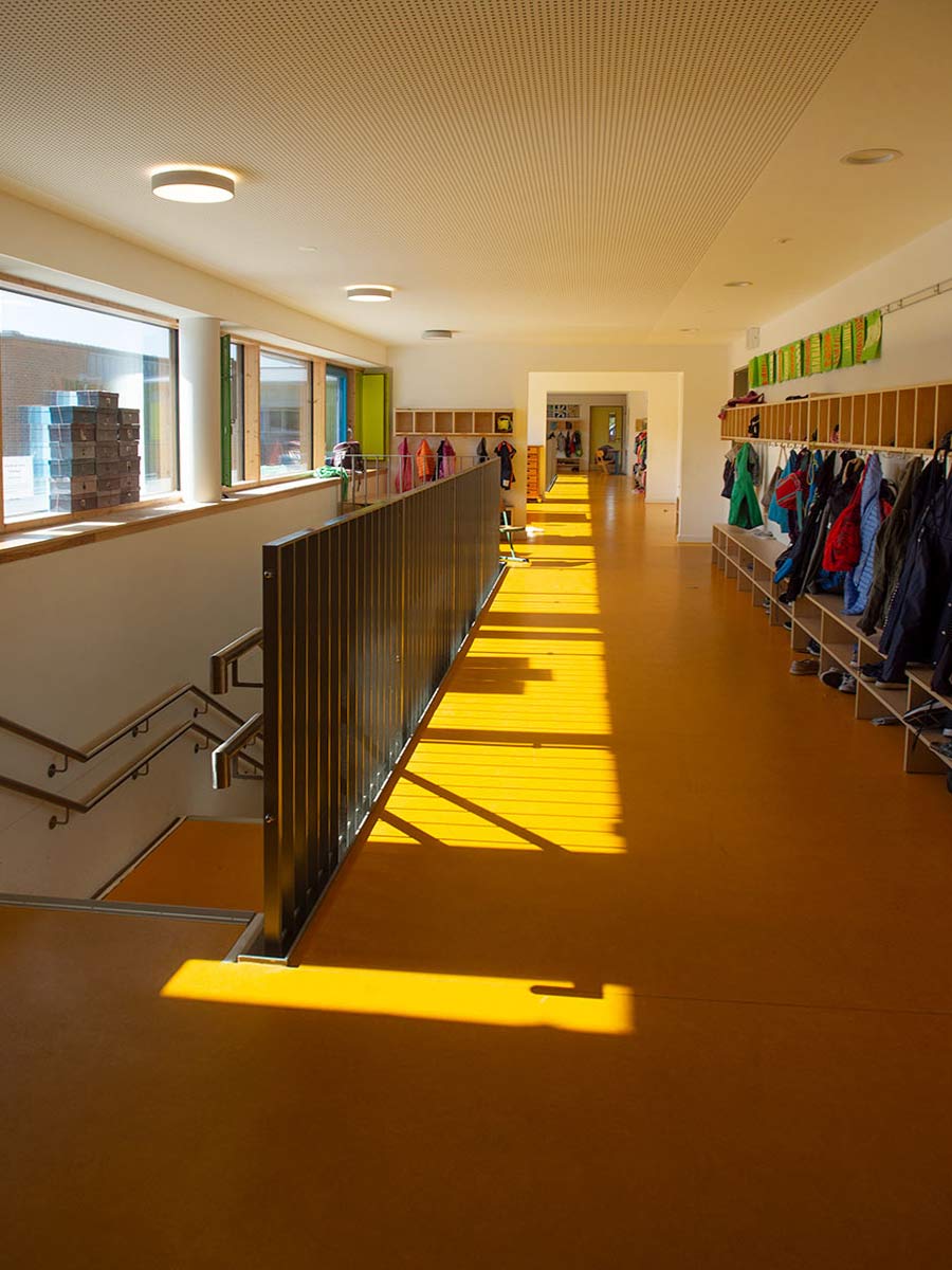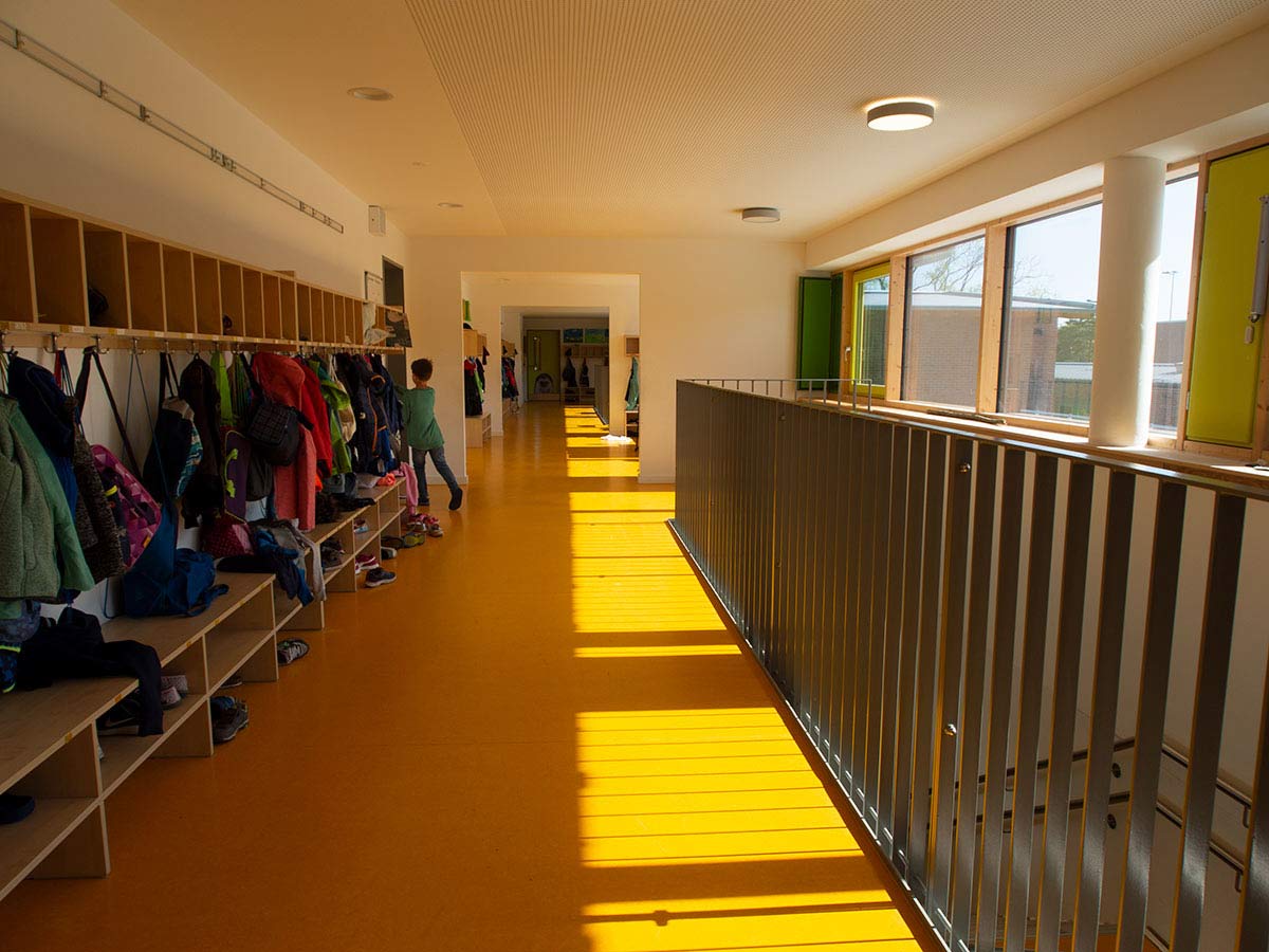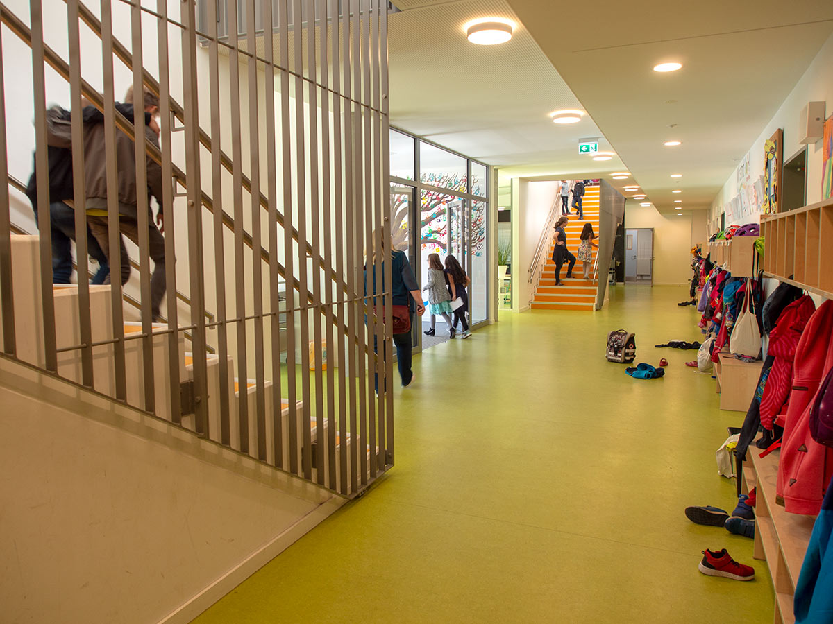 Die zehn Klassenräume für die zweizügige Grundschule mit Vorschule sind jeweils paarweise angeordnet mit einem dazwischen liegenden Differenzierungsraum. Für jede Klasse ist ein eigener WC-Raum mit Waschbecken geplant. Statt eines Klassenpaares liegen im EG die Küche mit Nebenräumen, die Lüftungszentrale und die Hausmeisterwerkstatt.