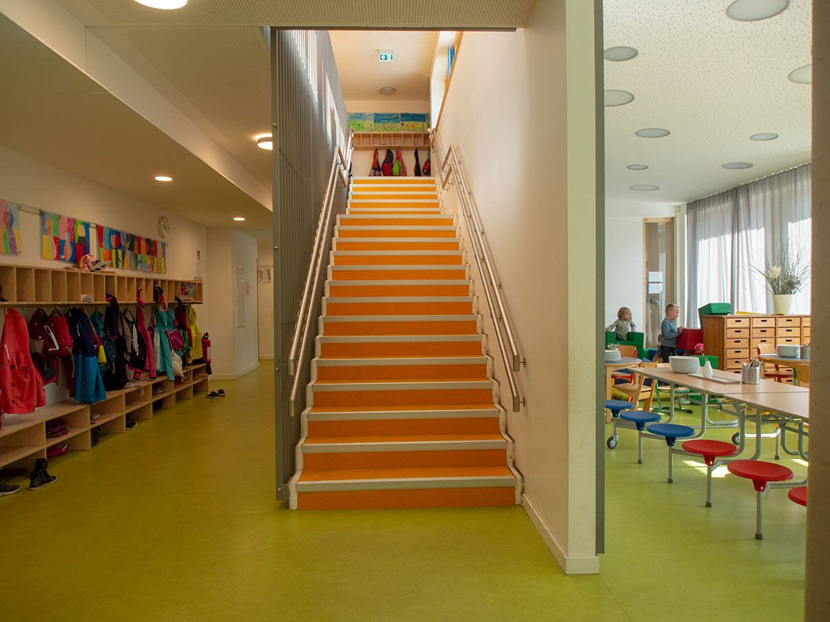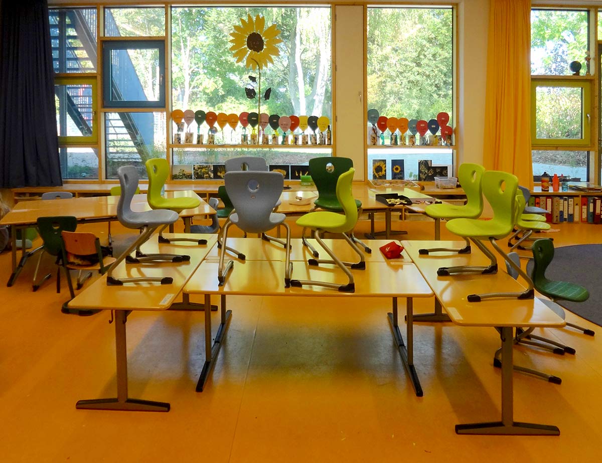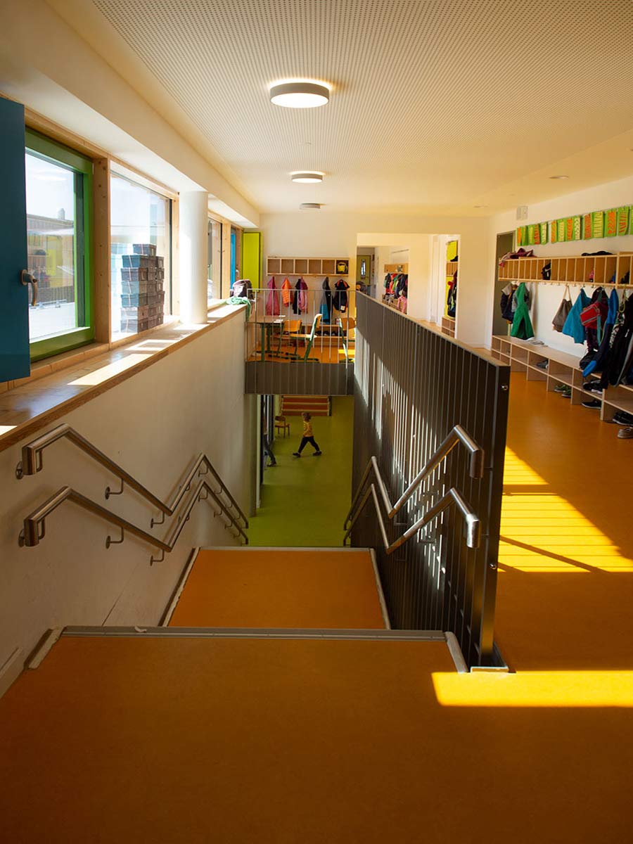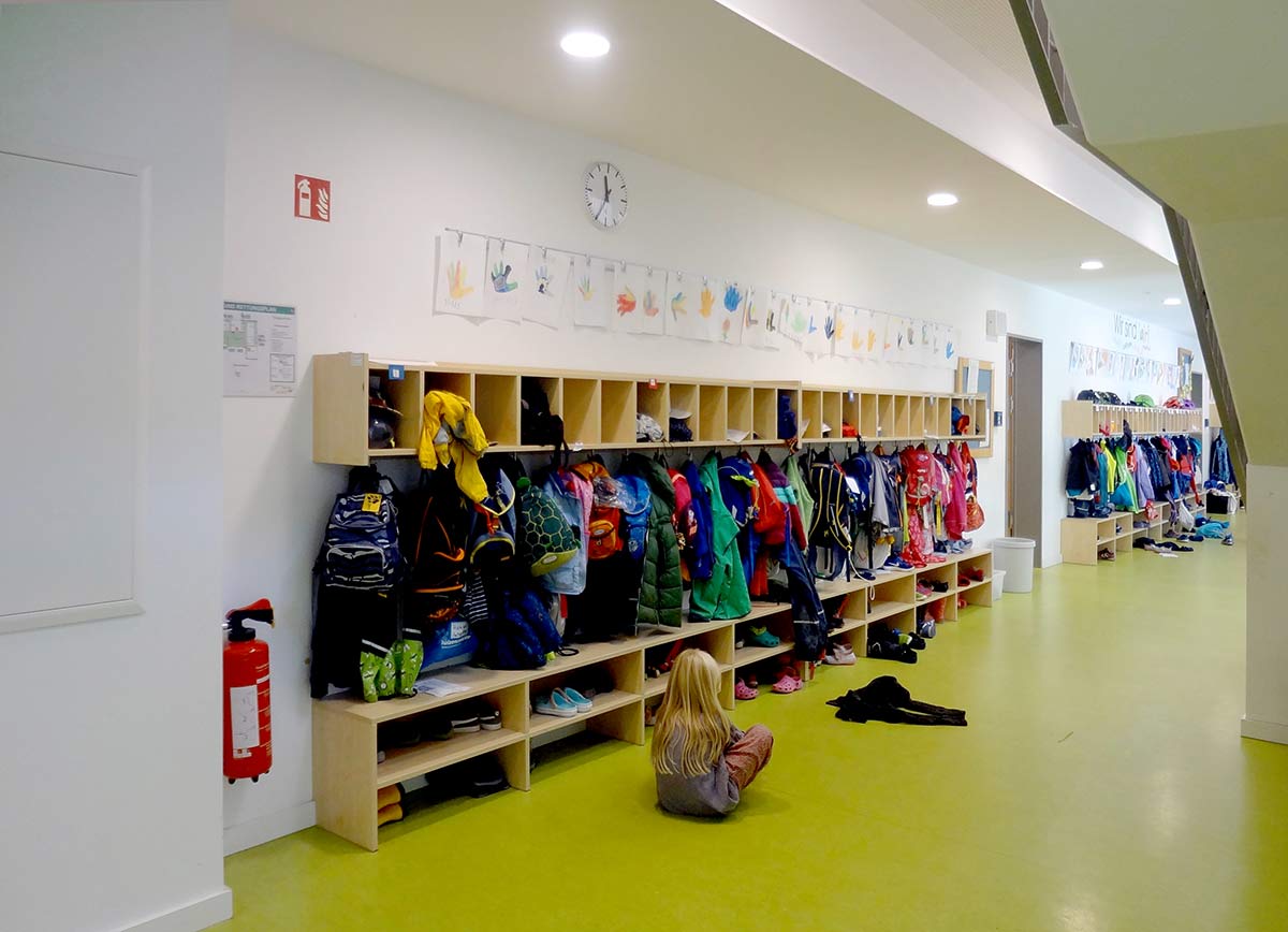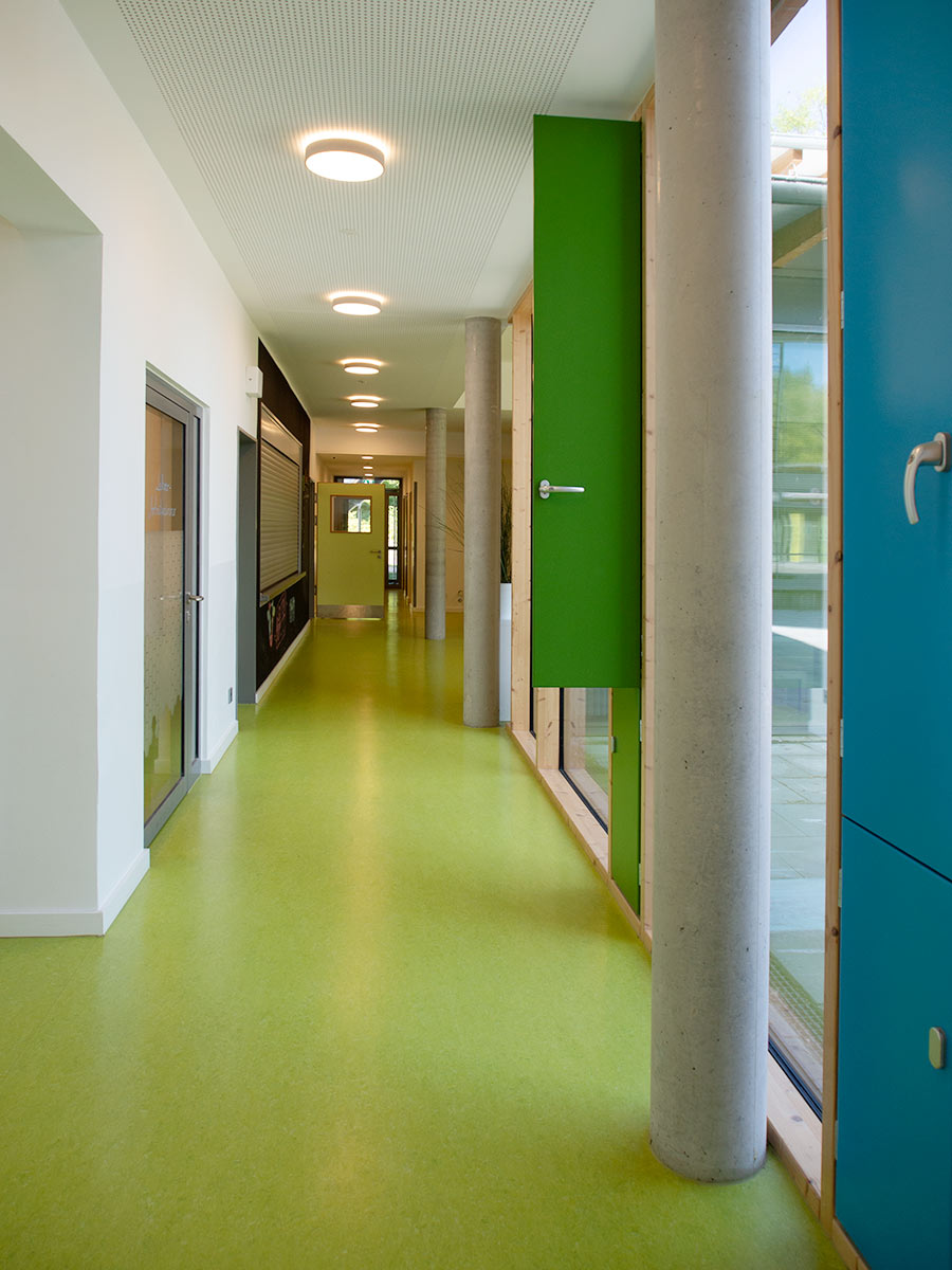 Die zehn Klassenräume für die zweizügige Grundschule mit Vorschule sind jeweils paarweise angeordnet mit einem dazwischen liegenden Differenzierungsraum. Für jede Klasse ist ein eigener WC-Raum mit Waschbecken geplant. Statt eines Klassenpaares liegen im EG die Küche mit Nebenräumen, die Lüftungszentrale und die Hausmeisterwerkstatt.