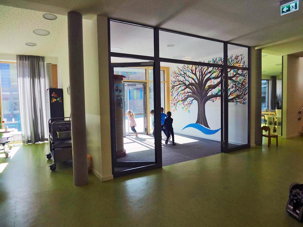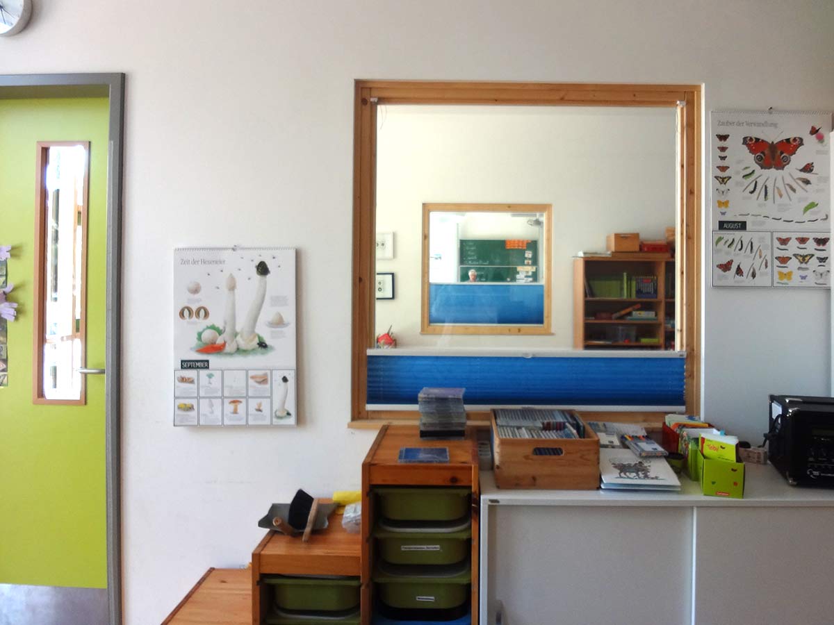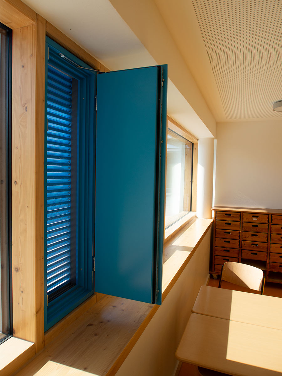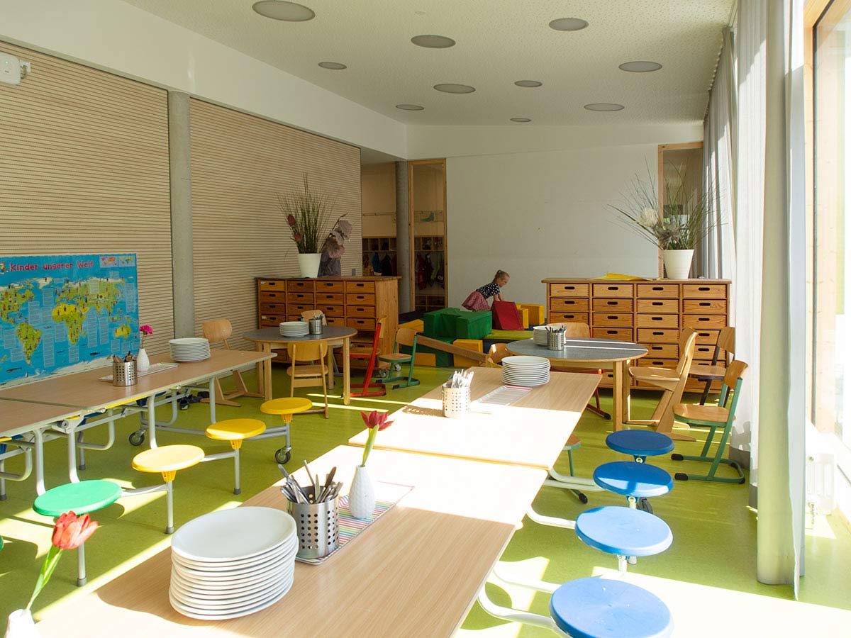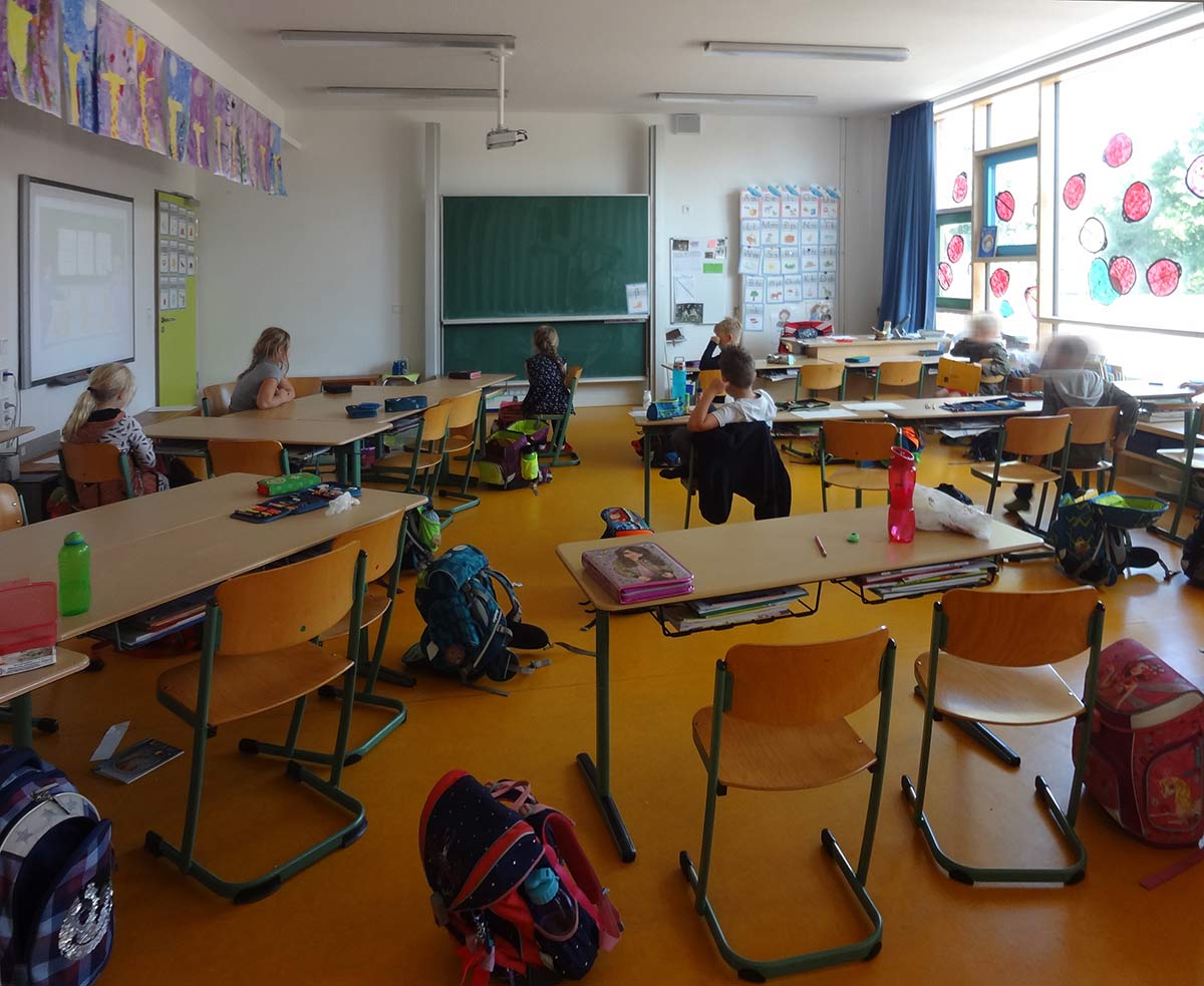 Die zehn Klassenräume für die zweizügige Grundschule mit Vorschule sind jeweils paarweise angeordnet mit einem dazwischen liegenden Differenzierungsraum. Für jede Klasse ist ein eigener WC-Raum mit Waschbecken geplant. Statt eines Klassenpaares liegen im EG die Küche mit Nebenräumen, die Lüftungszentrale und die Hausmeisterwerkstatt.
