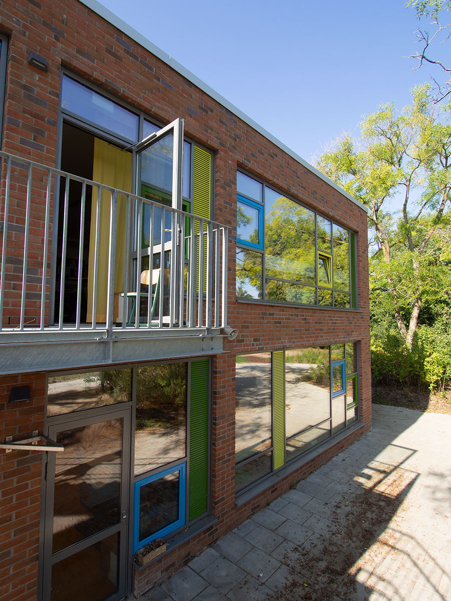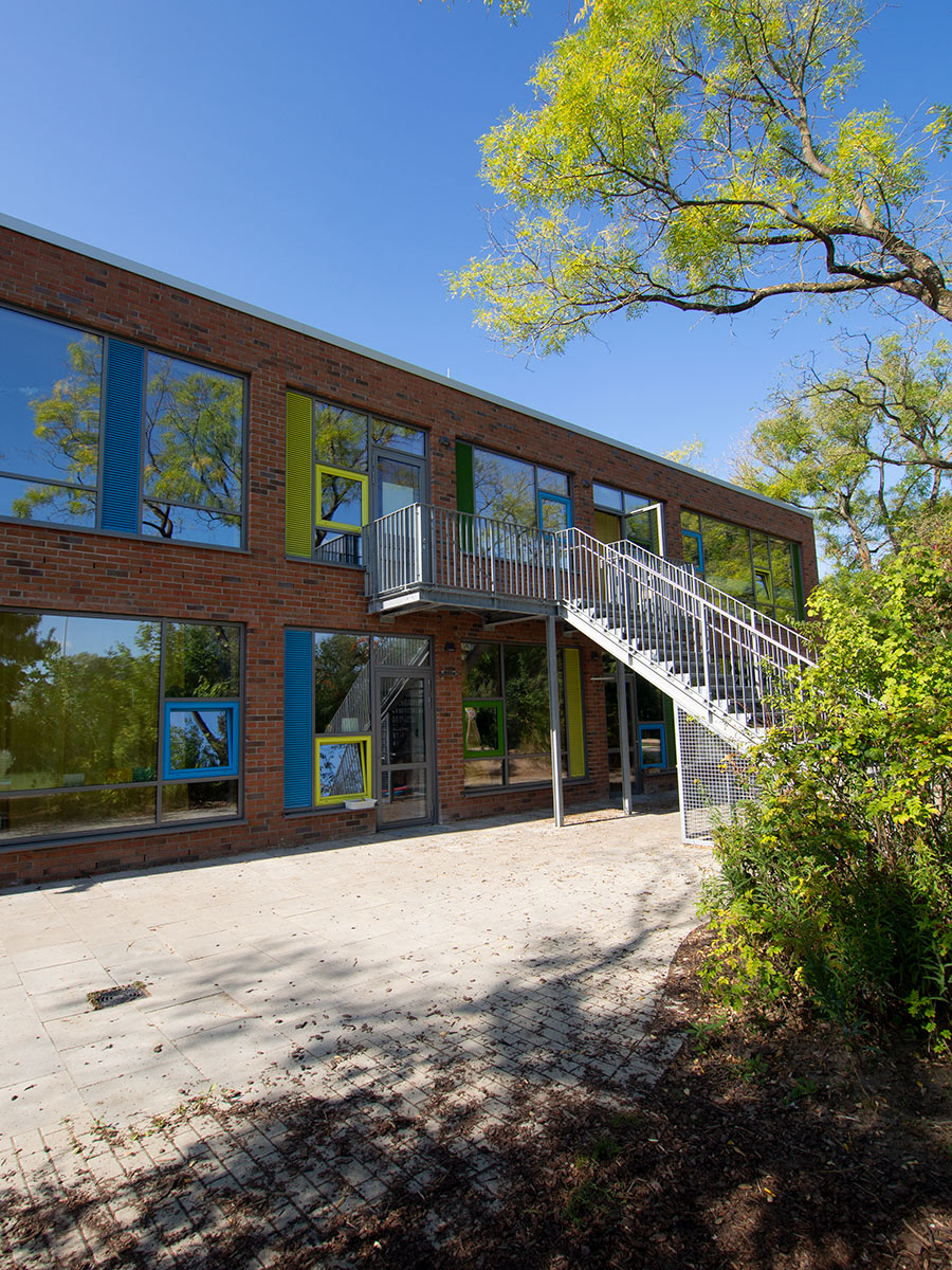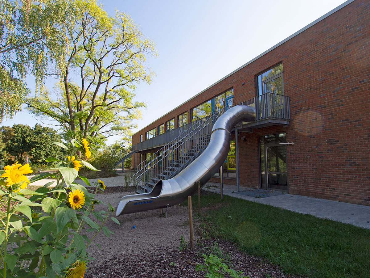Die Fläche des Speiseraumes haben wir in Abstimmung mit der Schulleitung in zwei Räume geteilt, die flexibel genutzt werden können. Um die Flure möblierbar und für den Schulbetrieb nutzbar zu machen, haben wir die notwendigen Rettungswege als Fluchtbalkone ausgebildet, von denen auch eine Rutsche ins Freigelände führt.
