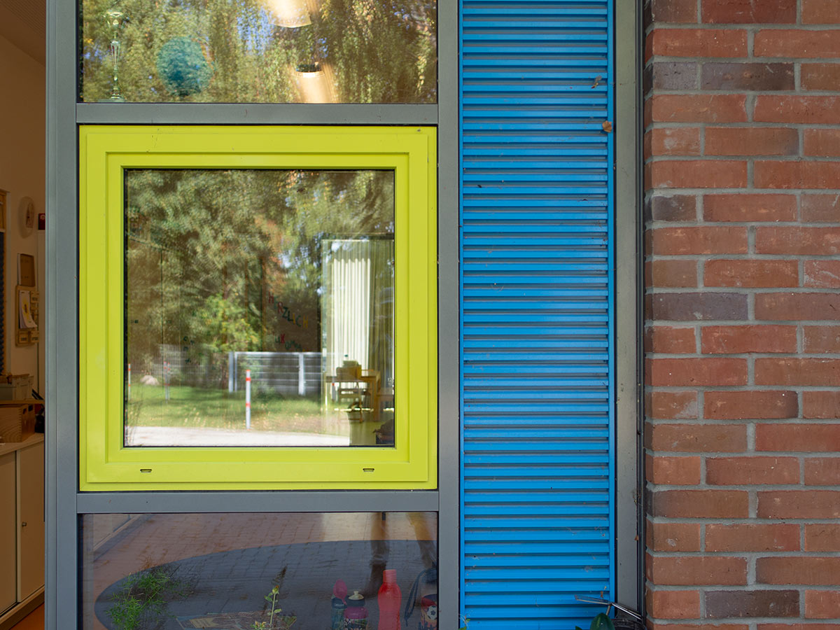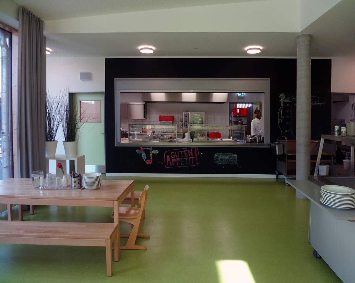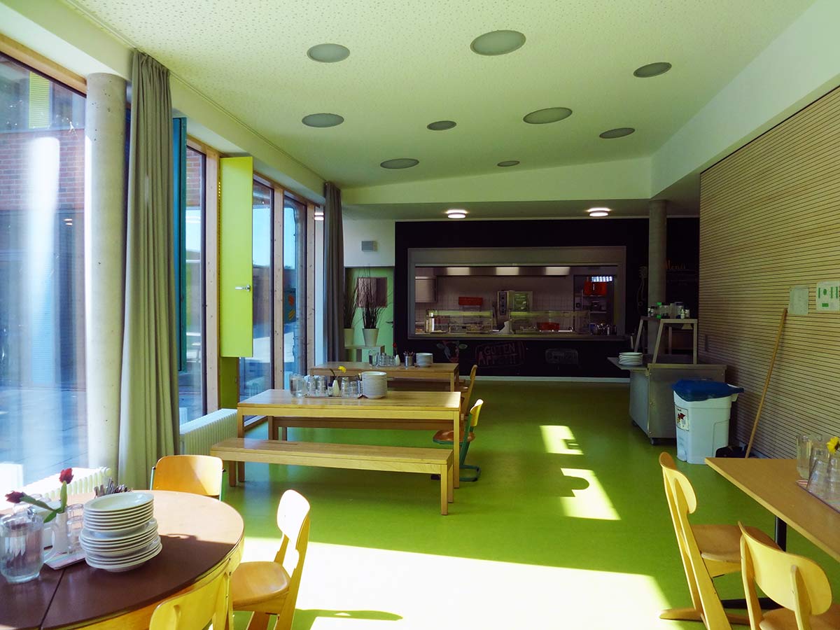 Die Fläche des Speiseraumes haben wir in Abstimmung mit der Schulleitung in zwei Räume geteilt, die flexibel genutzt werden können. Um die Flure möblierbar und für den Schulbetrieb nutzbar zu machen, haben wir die notwendigen Rettungswege als Fluchtbalkone ausgebildet, von denen auch eine Rutsche ins Freigelände führt.