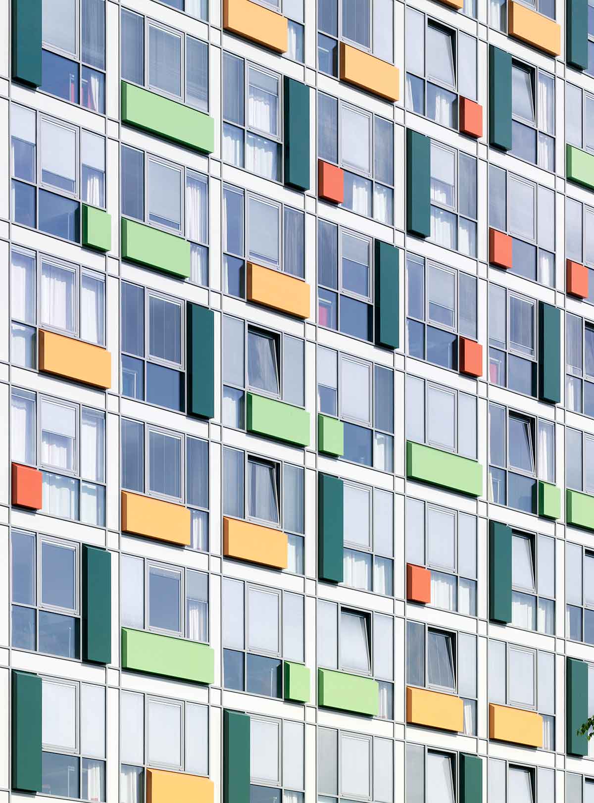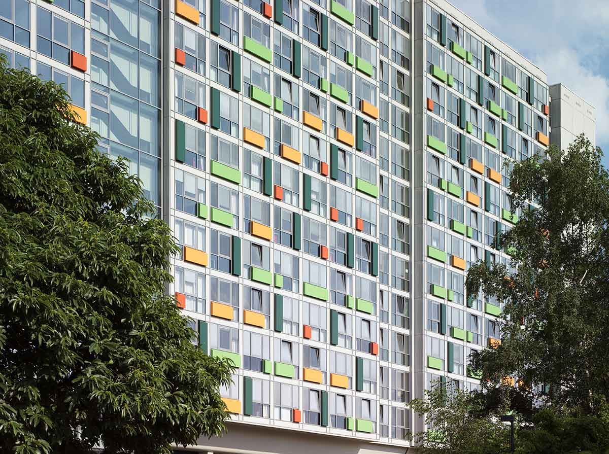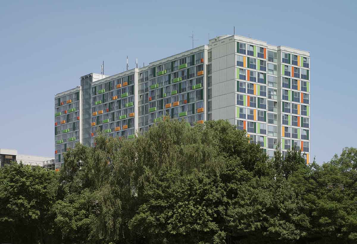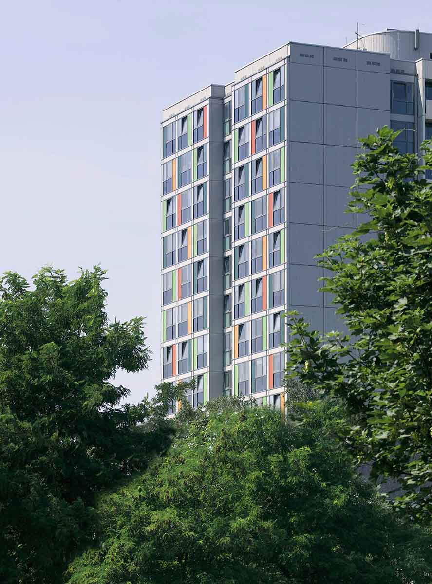 Da die rund 530 Internatszimmer durch Hinzunehmen der Balkonfläche vergrößert wurden, rückte die Fassade des 14-geschossigen Hochhauses in eine andere Ebene und musste völlig neu hergestellt werden. Brandschutz, Sonnenschutz, Wärmeschutz und Fassadenreinigung mussten in die gestalterische Fassadenlösung integriert werden. |