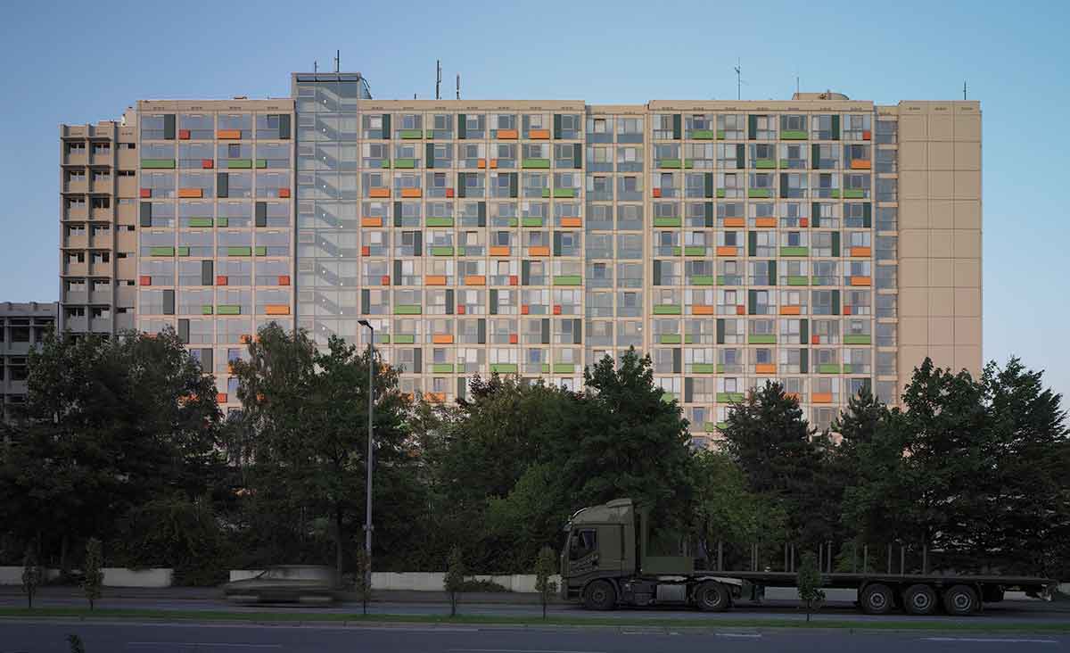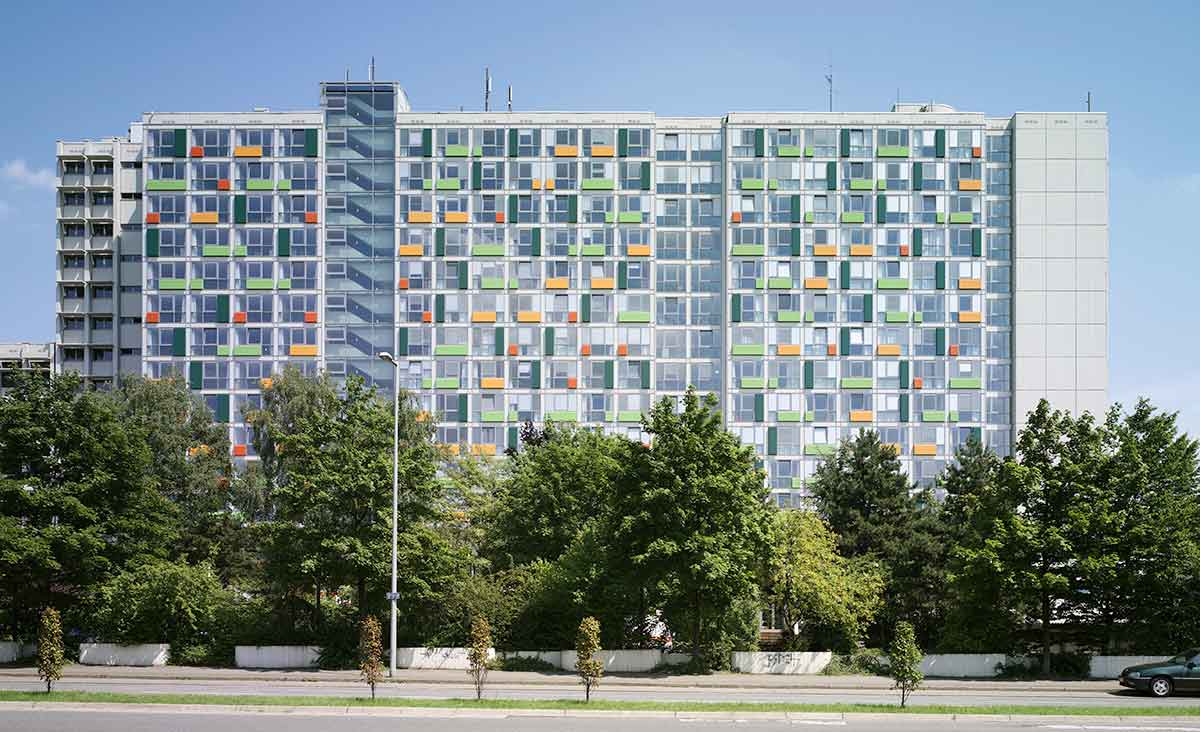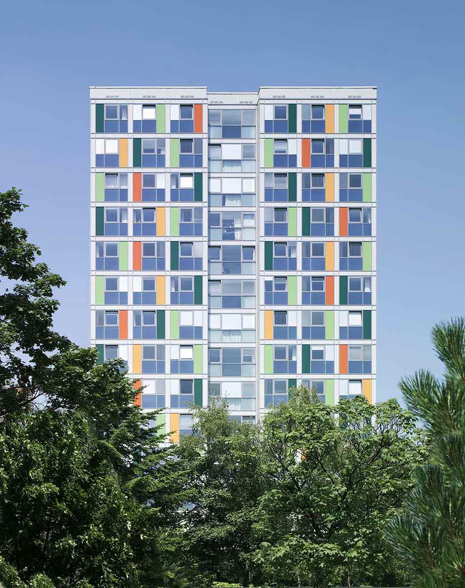 Beton wird durch Glas ersetzt. Die Betonburg der 70er wird zum gläsernen, farbigen, ungewöhnlichen Hochhaus, das neugierig macht auf seine Inhalte und damit auf das Berufsförderungswerk. Die Zimmer- und damit Tragstruktur bleibt erkennbar: Decken und Schotten bilden das sichtbare Grundraster. Sie werden gedämmt und mit Glaspaneelen in Betongrau verkleidet. Im Kontrast dazu stehen die Rot- und Grüntöne der geschlossenen Fassadenfelder als Blech"kästen" in verschiedenen Abmessungen, die sich nach außen wölben und raumseitig als Regal nutzbar sind. Die Vielfalt bei der Fassadengestaltung der Zimmer symbolisiert die Vielfalt der Bewohner.