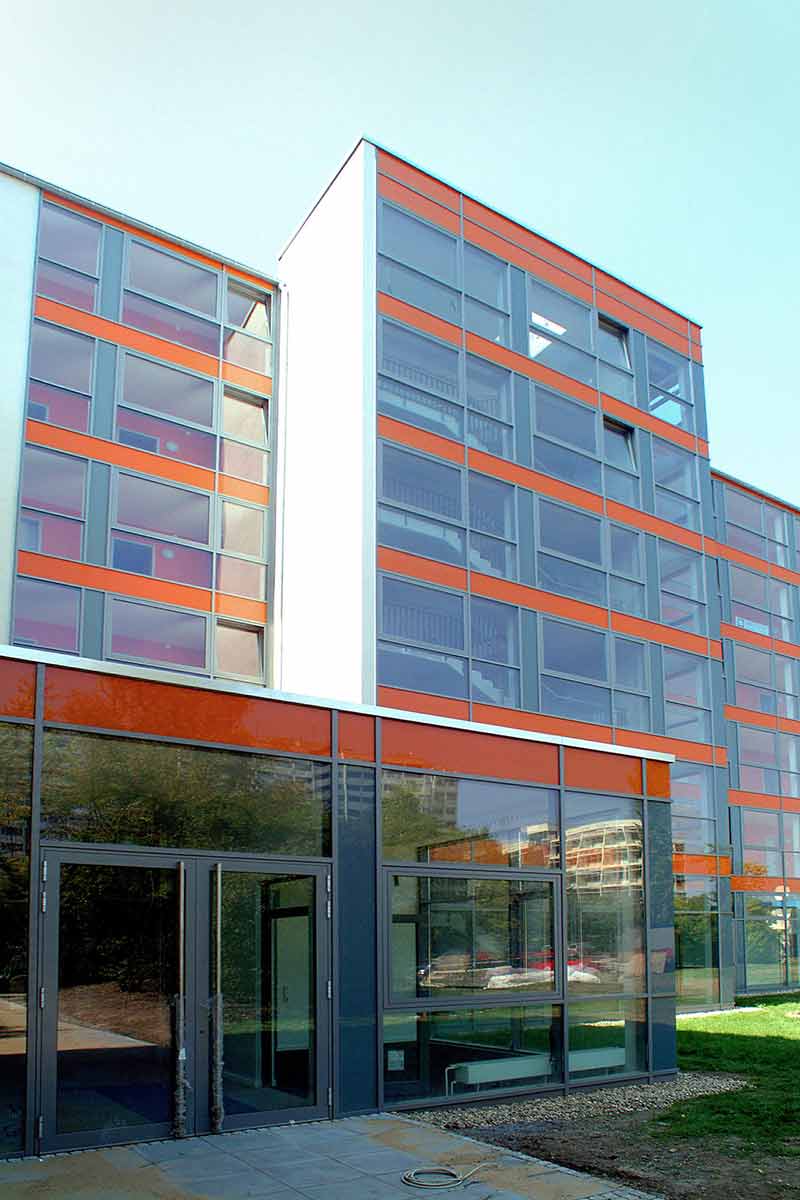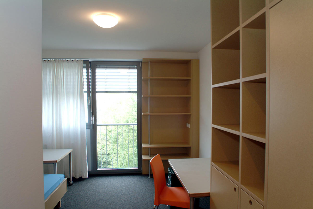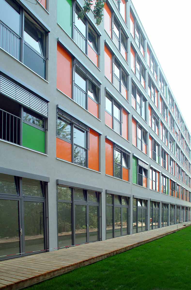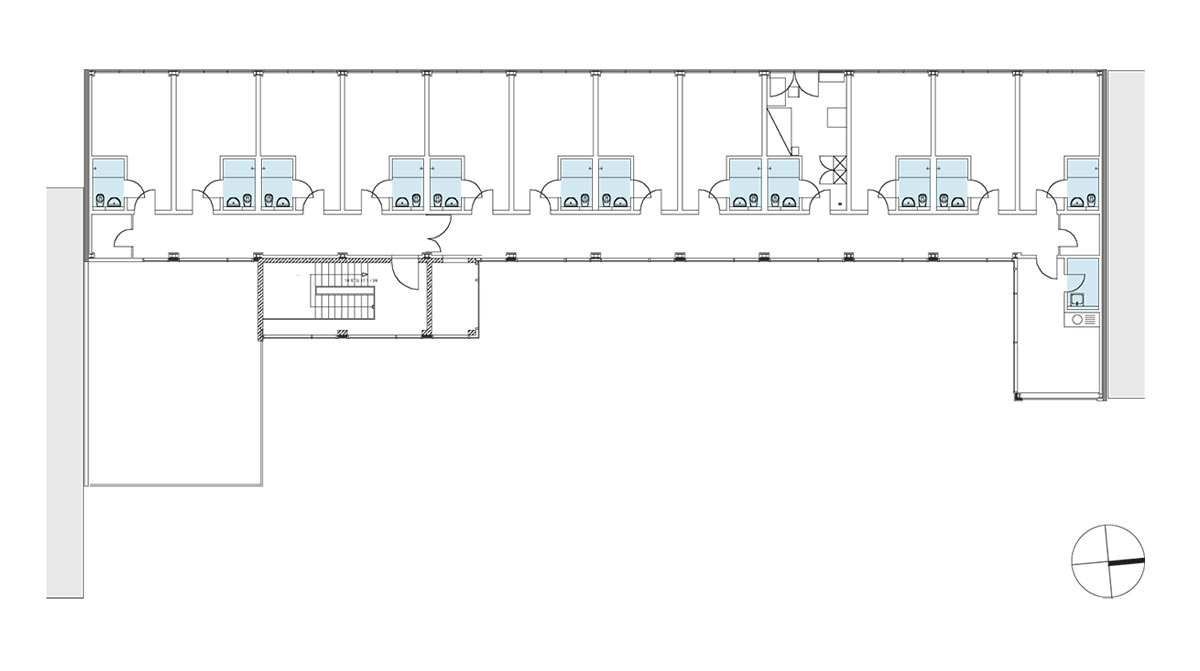 Wir füllen die vorhandene Baulücke gegenüber dem BFW mit einem sechsgeschossigen Gebäude in Modulbauweise, das in fünf Obergeschossen jeweils 12 Zimmer, Nebenräume und Teeküche enthält, im Erdgeschoss liegen Büro, Empfang, Aufenthalts- und Nebenräume.