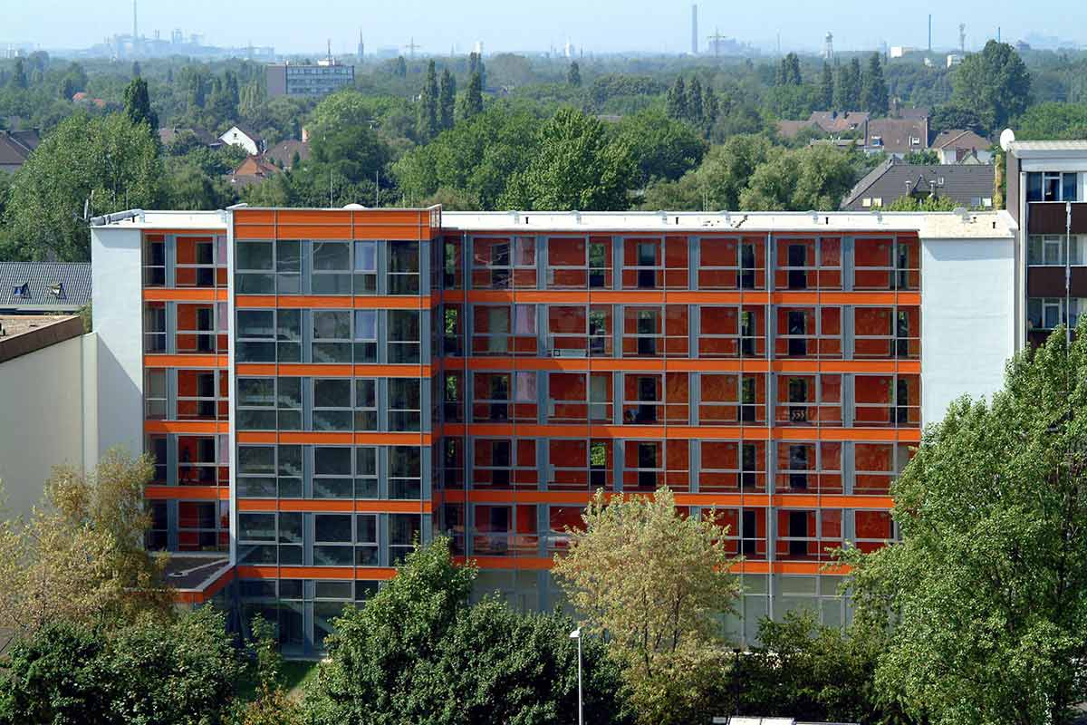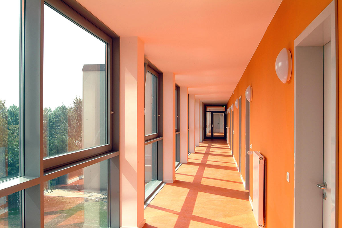 Der Grundriss ist als schmaler Einbund organisiert, um zur Straße hin möglichst viel Fläche für eventuelle Erweiterungen zur Verfügung zu haben. Die Stadt Oberhausen, die das Grundstück am liebsten unbebaut gelassen hätte, stimmte der Bebauung - trotz B-Plan – nur unter der Prämisse zu, dass die rückwärtige Flucht der Nachbarbebauung nicht überschritten wird und der grüne Innenhof erhalten bleibt. Das Projekt wurde unter großem Zeitdruck innerhalb eines Jahres als Modulbau realisiert: die Genehmigungsverfahren dauerten 6 Monate, die Gesamtbauzeit bis zum Bezug betrug ebenfalls 6 Monate.