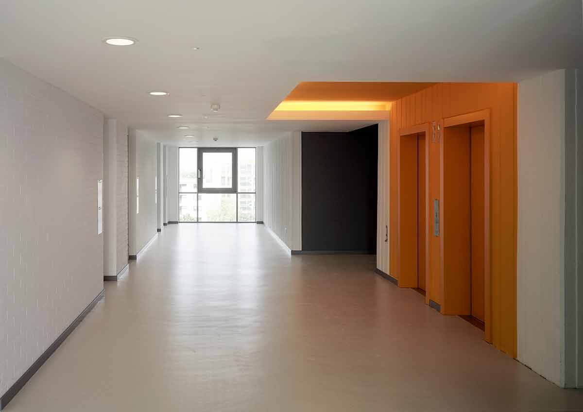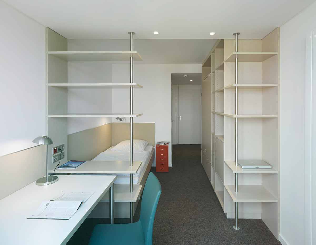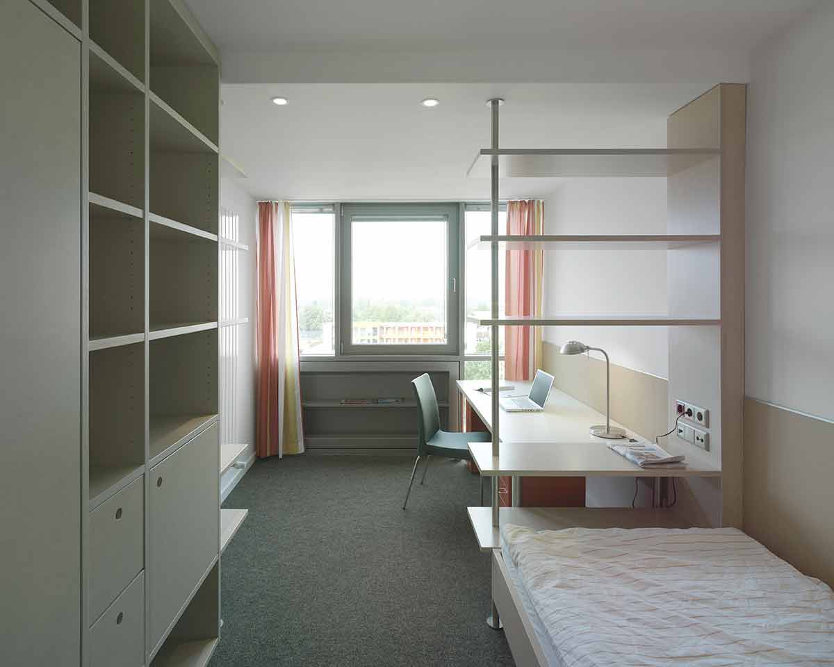 Das konstruktive System des Internatshochhauses aus tragenden Stahlbetonschotten im Abstand von 3,00 m verbot die Vergrößerung der Zimmer durch das Zusammenlegen von Einheiten. Die Balkone wurden zur Zimmerfläche addiert, so dass sich eine Grundfläche von 18 m2 ergibt. Die Balkonbrüstungen werden abgenommen. Die neue Fassade ist weitgehend verglast und enthält für jedes Zimmer eine farbige, nach außen ragende Blech“kiste“, die zum Raum hin als Regal nutzbar ist. Den entstandenen Innenraum gliedern wir mit einem Raumteiler in den hellen und den dunklen Bereich, der variabel möblierbar ist. In den niedrigen Fluren ohne Tageslicht mit unterschiedlichen Wandoberflächen betonen wir den Kunstlicht-Charakter: Es gibt einen sehr hellen, Licht reflektierende Boden und optisch zurücktretende dunkle Wände und Decken. Licht betont jeweils die weißen Zimmertüren und die Farbflächen, die als monochrome Bilder die Mittelwand gestalten.