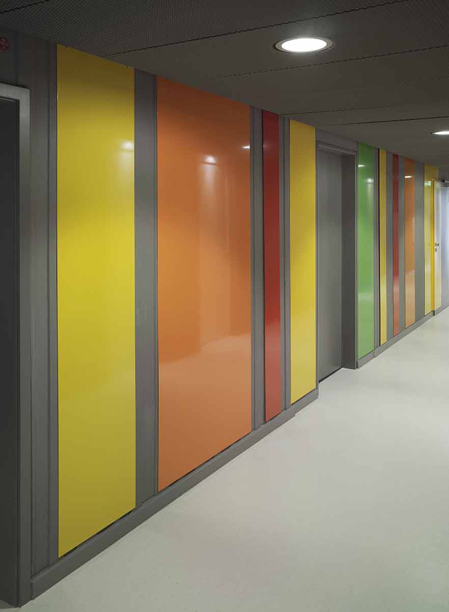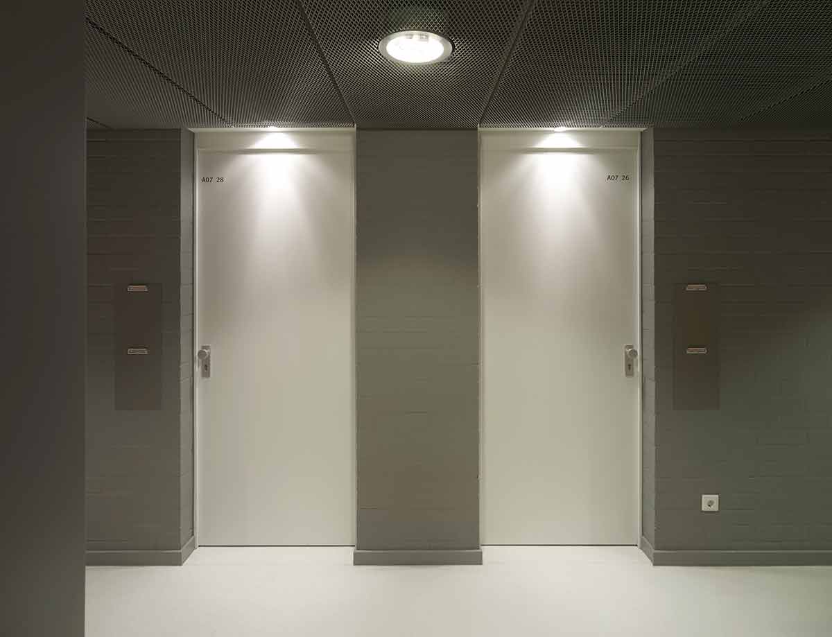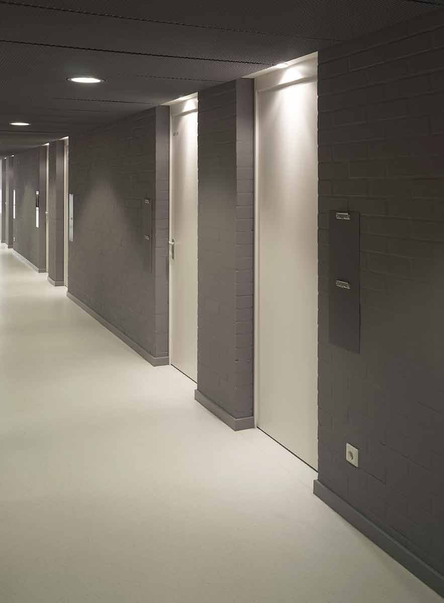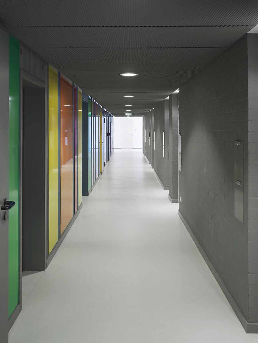 Das konstruktive System des Internatshochhauses aus tragenden Stahlbetonschotten im Abstand von 3,00 m verbot die Vergrößerung der Zimmer durch das Zusammenlegen von Einheiten. Die Balkone wurden zur Zimmerfläche addiert, so dass sich eine Grundfläche von 18 m2 ergibt. Die Balkonbrüstungen werden abgenommen. Die neue Fassade ist weitgehend verglast und enthält für jedes Zimmer eine farbige, nach außen ragende Blech“kiste“, die zum Raum hin als Regal nutzbar ist. Den entstandenen Innenraum gliedern wir mit einem Raumteiler in den hellen und den dunklen Bereich, der variabel möblierbar ist. In den niedrigen Fluren ohne Tageslicht mit unterschiedlichen Wandoberflächen betonen wir den Kunstlicht-Charakter: Es gibt einen sehr hellen, Licht reflektierende Boden und optisch zurücktretende dunkle Wände und Decken. Licht betont jeweils die weißen Zimmertüren und die Farbflächen, die als monochrome Bilder die Mittelwand gestalten.