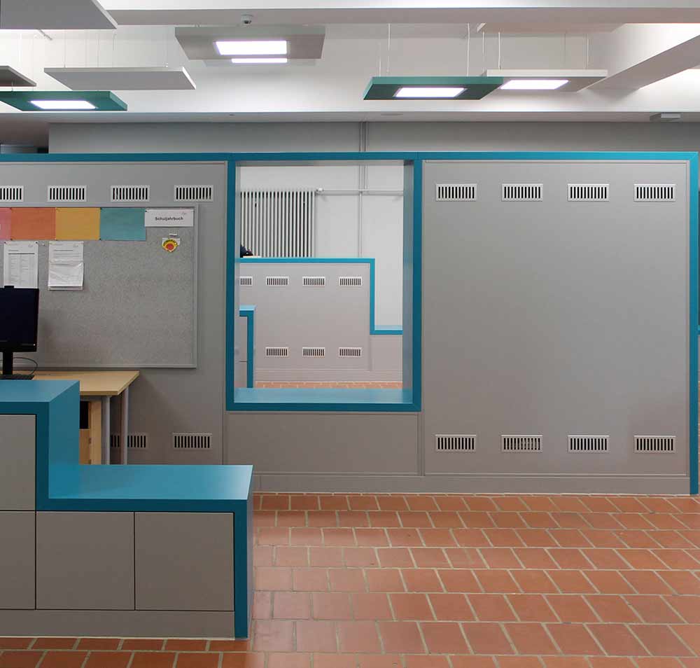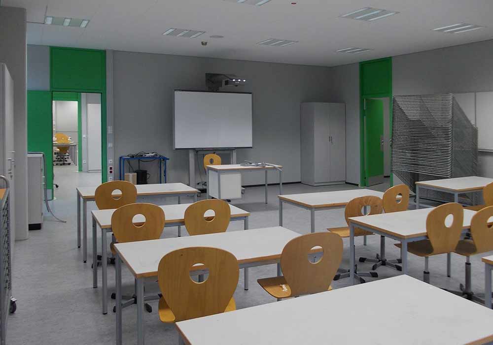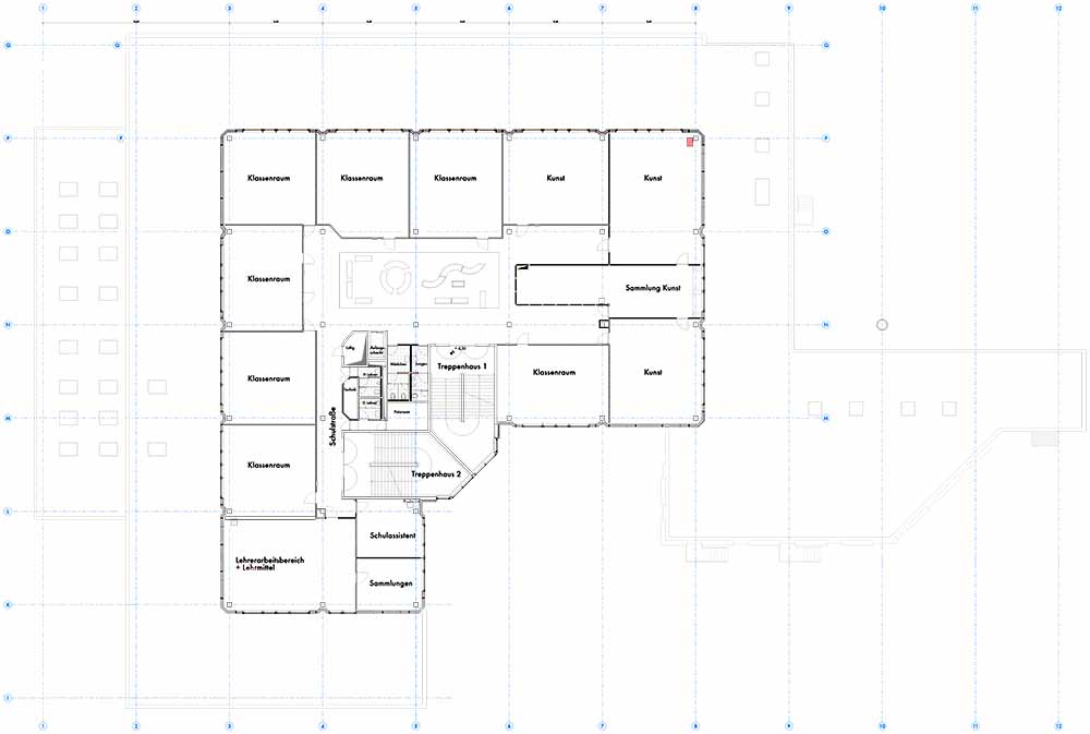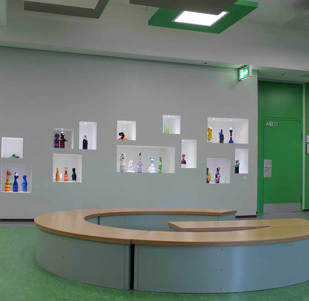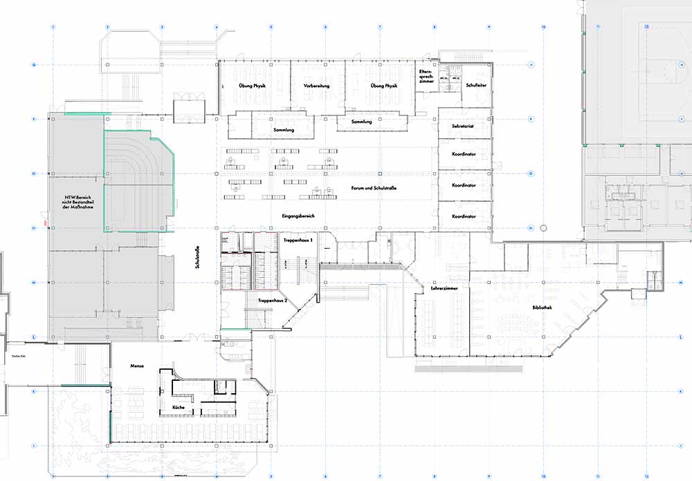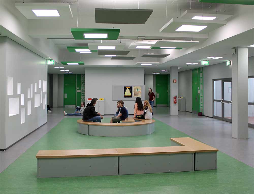 Interne Umzüge gingen einher mit der Sanierung aller Räume und der Erneuerung der Haustechnik. Im 3. Bauabschnitt wurde das EG erneuert: Auch hier wurden die Fassaden ausgetauscht, die Mensa eingerichtet und die Eingangshalle als Aufenthaltszone hergerichtet. Wir haben gemeinsam mit der Schule das Innenraumkonzept beschlossen: Im EG eine Rückzugs- und individuelle Lernlandschaft mit den notwendigen Schließfächern als Gliederung. In den Obergeschossen Aufenthaltsflächen mit Sitzmöglichkeiten in der Mittelzone sowie eine Präsentationswand vor den Kunsträumen für Exponate. Die Küche ist als Vollküche mit Kochkessel und Kombidämpfern ausgestattet. Pro Tag werden bei ca. 135 Sitzplätzen rund 300 Essen aus- gegeben.