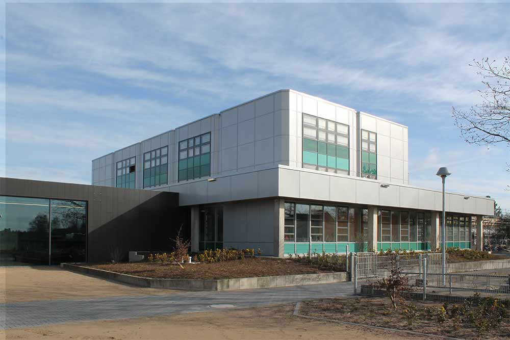 Das Lessinggymnasium im Norden von Braunschweig ist eine Schule aus den 70er Jahren mit allen Problemen der Gebäude dieser Zeit und 40 Jahren Abnutzung. Dies sollte nun in mehreren Bauabschnitten bei laufendem Schulbetrieb behoben werden. Außerdem sollte die Lern- und Verweilqualität der Räume verbessert werden. Die Schule wurde innerhalb dieser Maßnahmen zur Ganztagsschule ausgebaut. Die finanziellen Mittel waren äußerst knapp bemessen. Zunächst haben wir ein Fassaden- und Farbkonzept entwickelt, das von den damaligen Architekten freigegeben werden musste. Die Farben Orange und Grün sind die Leitfarben -Reminiszenz an die 70er. Nach dem Farbkonzept wurden zunächst alle WC-Anlagen erneuert. Im zweiten Bauabschnitt wurden die beiden Obergeschosse saniert: die Fassaden wurden ausgetauscht, alle Dachflächen gedämmt und erneuert.