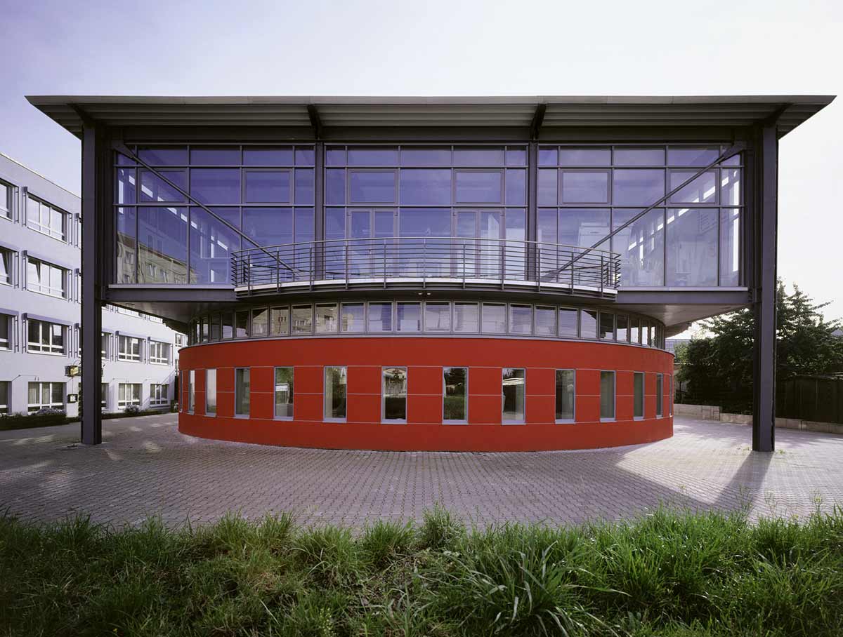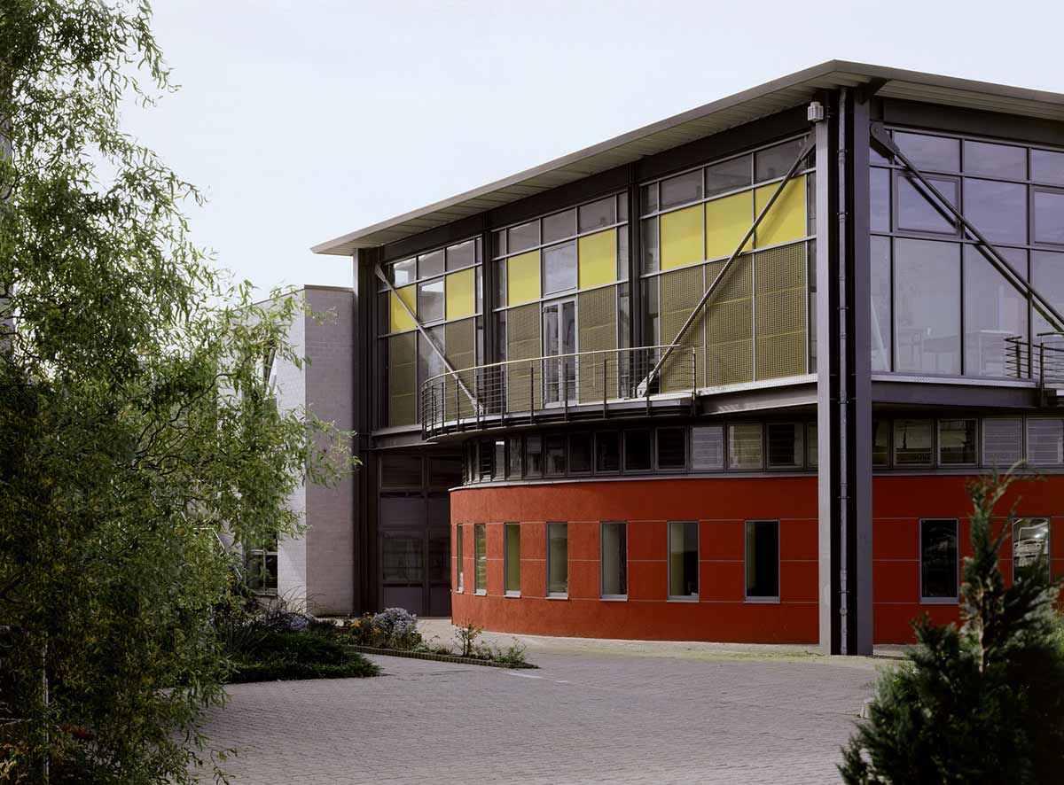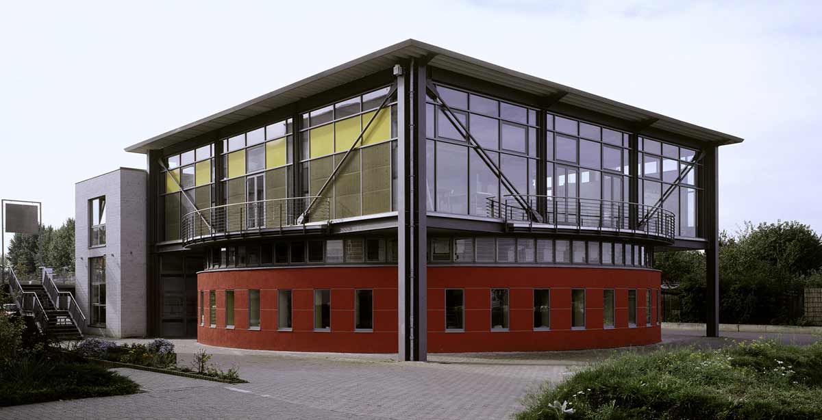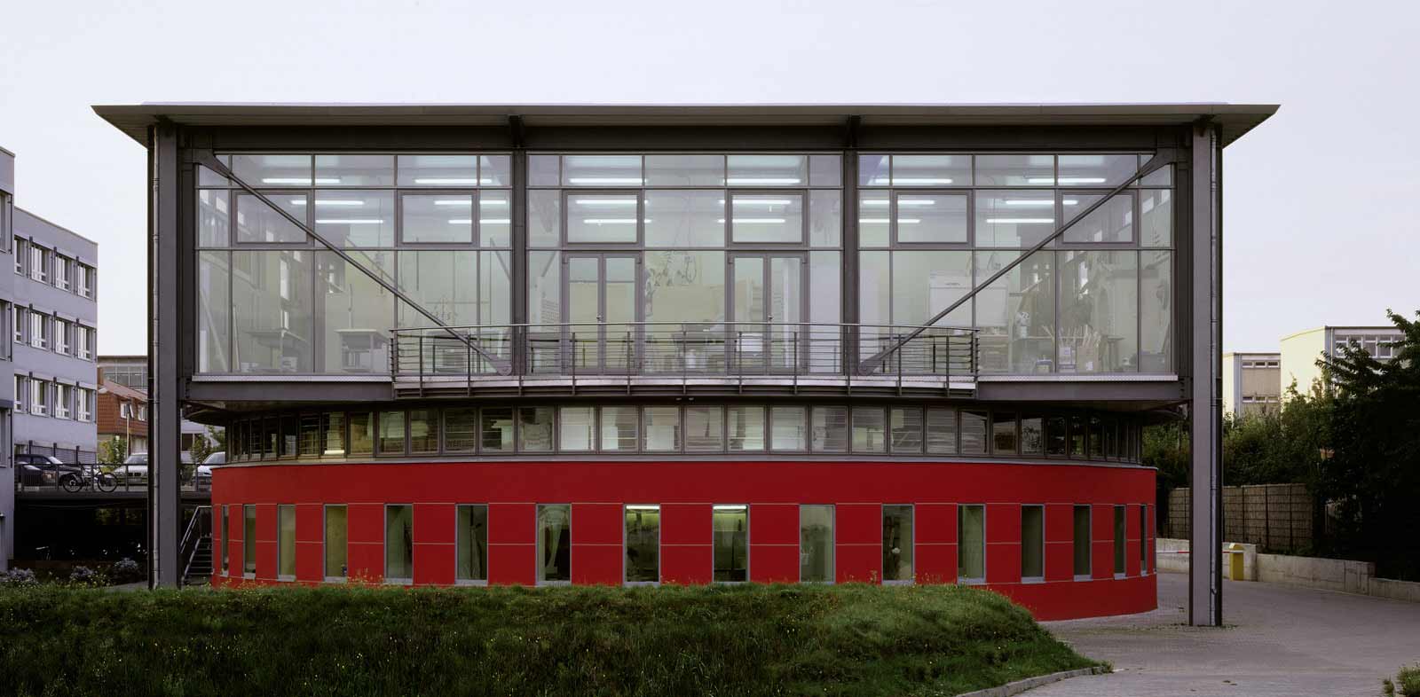 Ziel war das Herstellen optimaler Arbeitsbedingungen. Dies führte zum kreisförmigen Grundriss im EG, in dem 16 gleiche Tapezierkojen mit gleichen Licht- und Lüftungsbedingungen um Waschstrecken und Materiallager angeordnet sind, und zum quadratischen Obergeschoss mit dem großflächigen Atelier, das über eine verglaste Nordfassade und ein Oberlichtband natürlich belichtet wird. Nebenräume sind in einem zweigeschossigen Riegel angegliedert, der sich der Parkpalette zuwendet. Die Detailplanung erfolgte in enger Abstimmung mit dem Bauherrn, da das Gebäude überwiegend in Eigenleistung errichtet wurde.