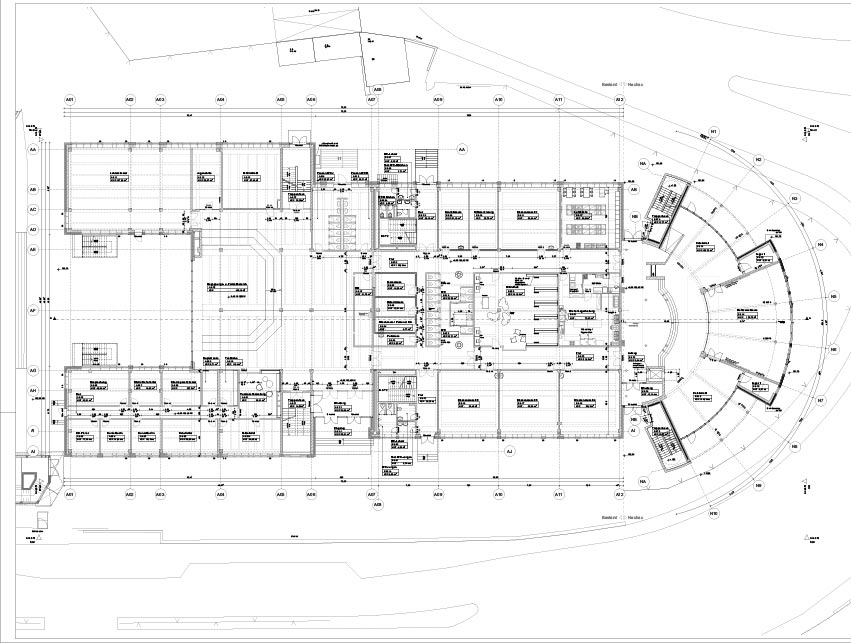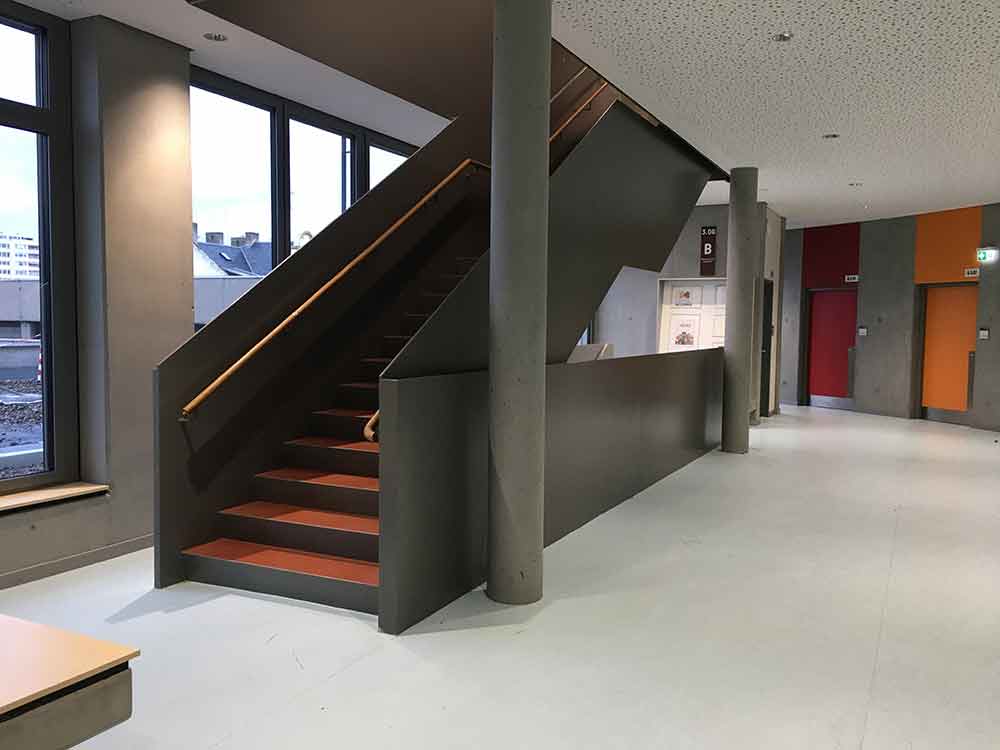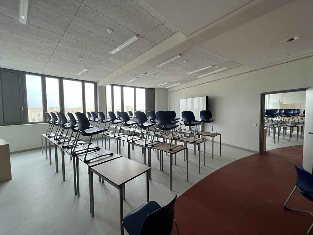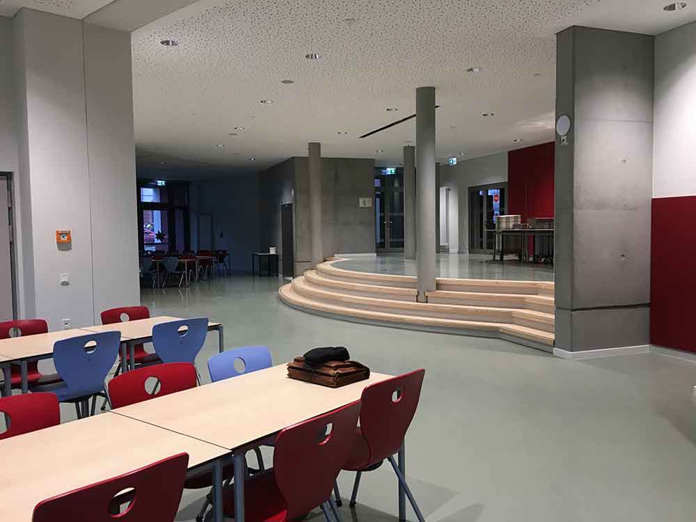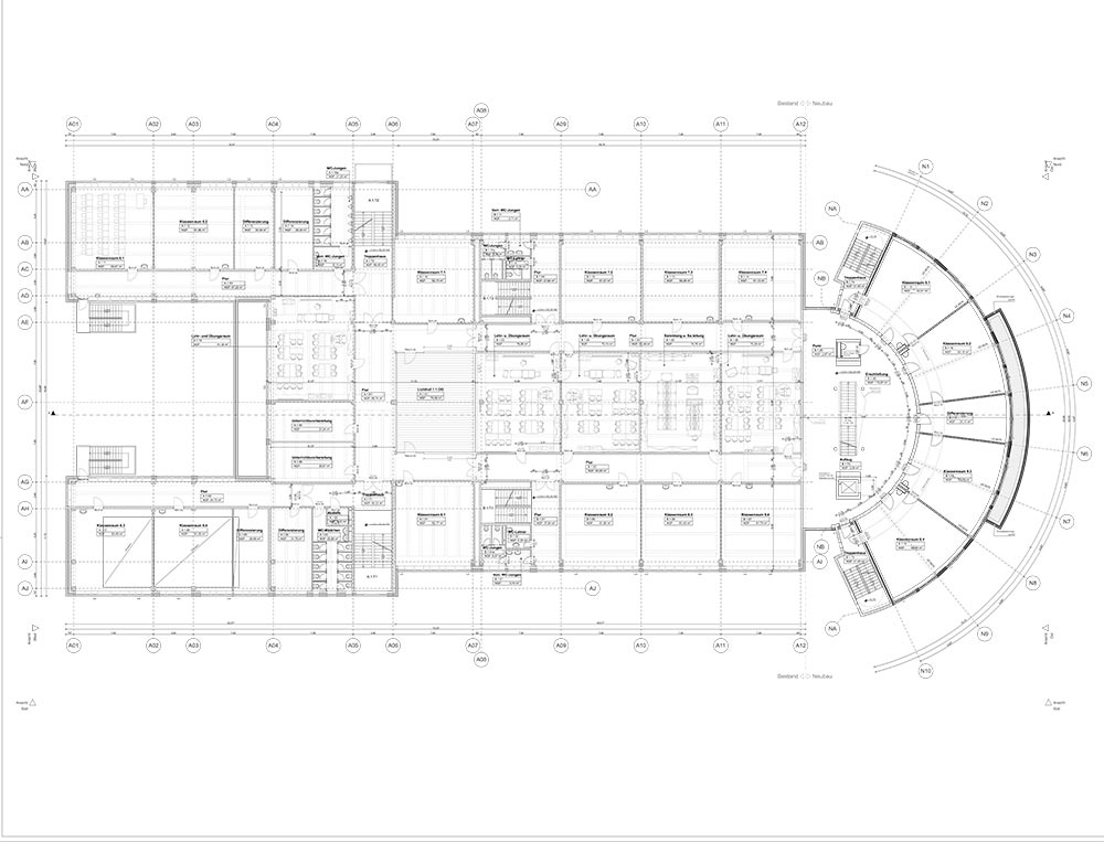 Der Ergänzungsbau ist ein sechsgeschossigen Kopfbau, der als Kreissegment an den Altbau andockt und eine neue Landmarke "Bildung" in Offenbach werden wird. Auf aufwendiger Pfahlgründung gibt es erdgeschossig Mensa und abtrennbaren Mehrzweckraum, in den OGs jeweils Platz für vier Klassenräume und Differenzierungsfläche. Die "Halle", der Erschließungsraum vor den Klassen, ist ebenfalls nutzbare Fläche für den Schulbetrieb. Im Erdgeschoss des Altbaus gibt es komplett umgebaute Flächen für Verwaltung und Kollegium, die Schulbibliothek sowie die Küche mit Nebenflächen und die Räume der Freien Träger. Die neuen WC- Anlagen werden als Unisex-WCs mit offenen Waschbrunnen geplant. Im 1.OG gruppieren sich die Klassenräume der Sek.1 um die Fachklassen, das 2.OG beherbergt komplett die Grundschule. In den weiteren Obergeschossen werden Ganztagsbetrieb und inklusionsraum sowie Fachräume Musik und EDV untergebracht. Das Projekt steht unter starkem Kostendruck. Deswegen erhält das Gebäude eine WDVS-Fassade, so weit wie möglich soll der Bestand im Altbau erhalten bleiben. Die unverwüstlichen Bodenbeläge aus Spaltklinker bleiben also und werden Ausgangsbasis für unser Farbkonzept.