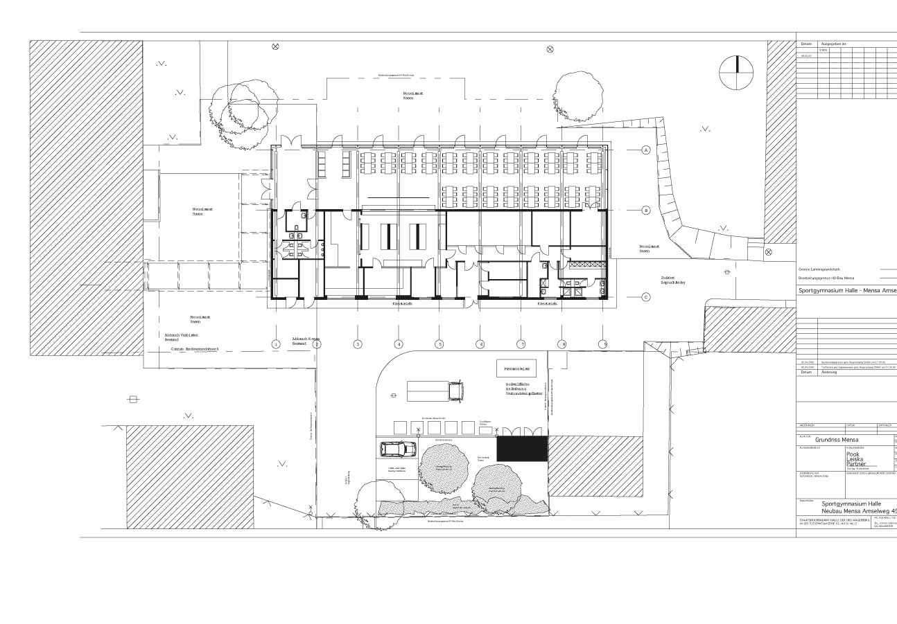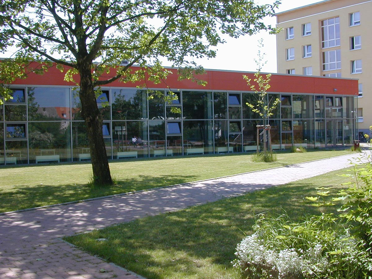 Da die Bausubstanz des DDR-Streifenbaus desolat war, das Gebäude insgesamt zu groß und seine architektonische und städtebauliche Qualität gering, haben wir Abbruch und Neubau empfohlen, auch weil die Kosten für den Neubau nicht wesentlich höher als die der Sanierung waren. In unserem Entwurf orientiert sich der Speiseraum nun nach Norden, zum „Campus“, auf dem leider keine Sitzplätze im Freien gestattet wurden. Im Speiseraum ist Platz für 160 Schüler. Küche und Nebenräume liegen ebenerdig der Straße und der Anlieferung zugewandt. Die Küche ist ausgelegt für 600 Mittagessen, dazu kommen 1. und 2. Frühstück, Vesper und Abendessen.