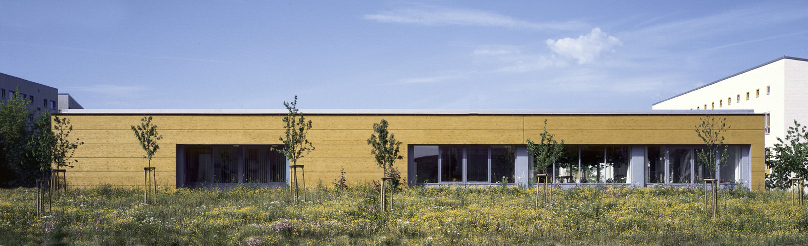Der Speiseraum bekam eine Runderneuerung einschließlich Lichtkonzept und Möblierung. Die Mensafassade erhielt eine Verkleidung aus Holzwerkstoffplatten. Der warme Holzton der Fassade korrespondiert mit den Holzfenstern der Neubauten. Die Plattenformate betonen die Horizontalität des Hauses