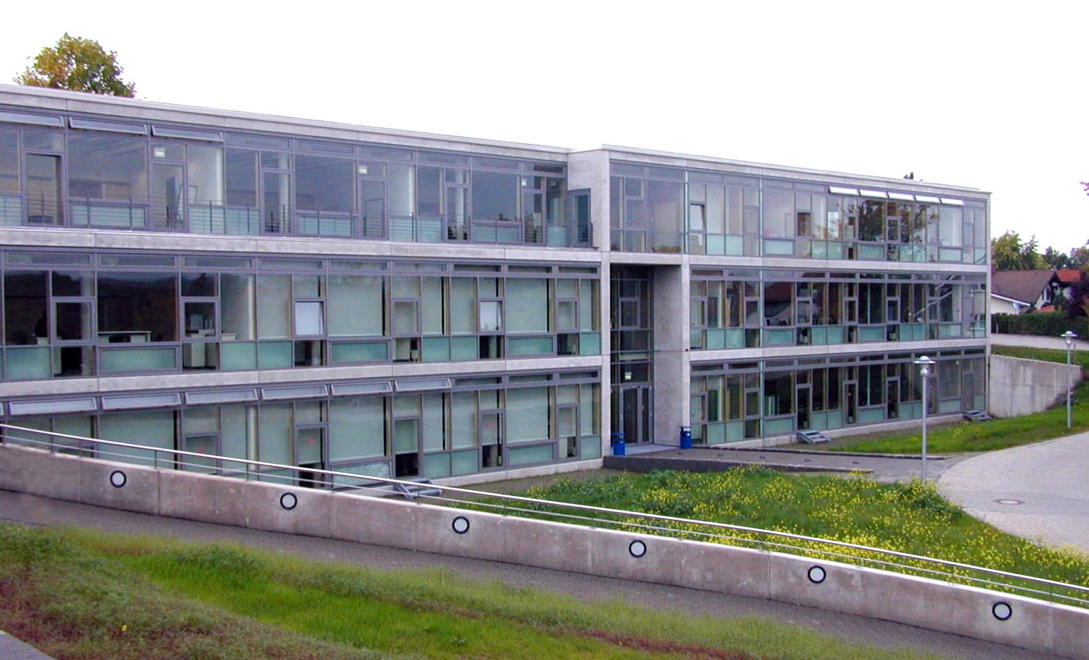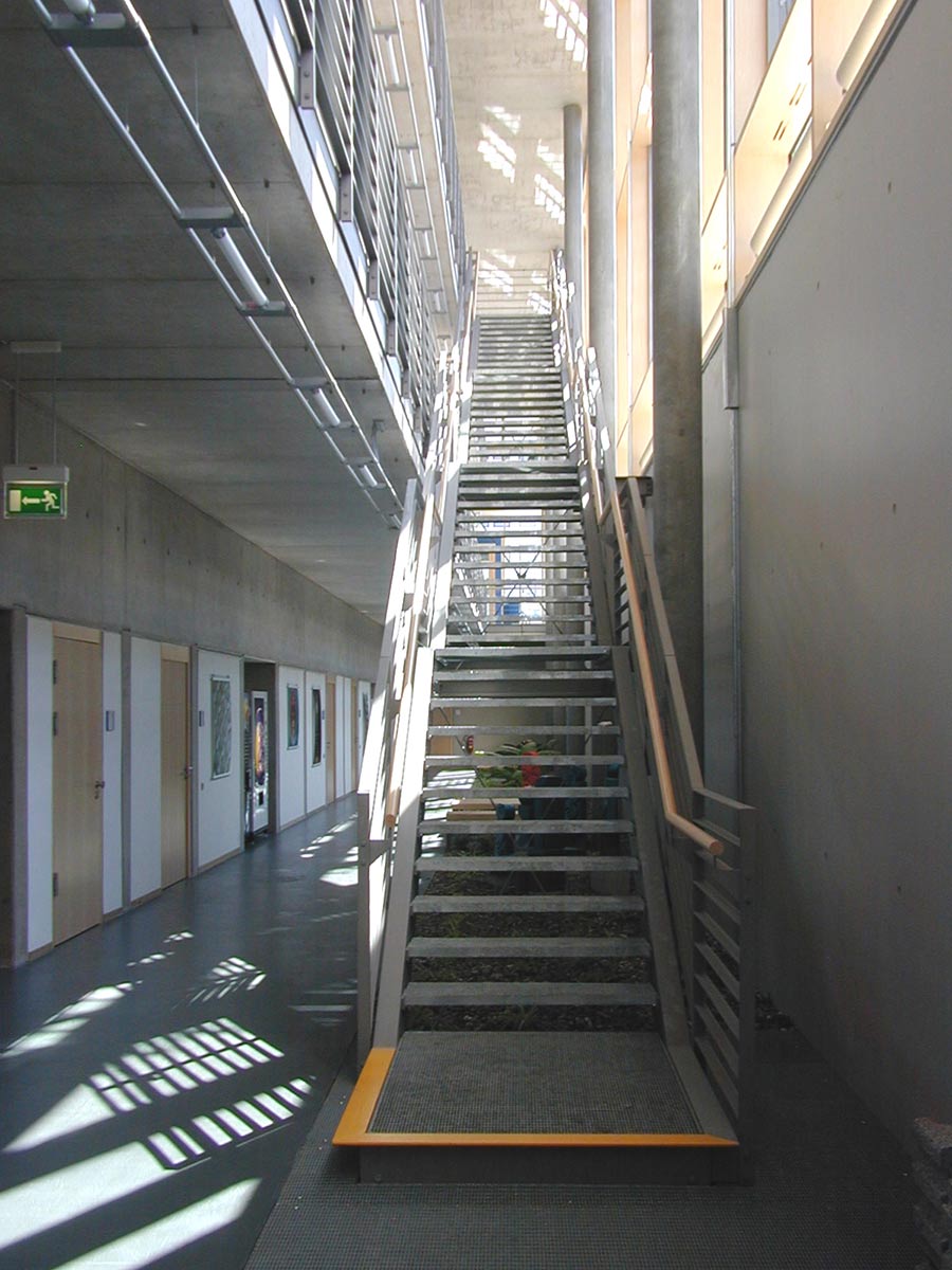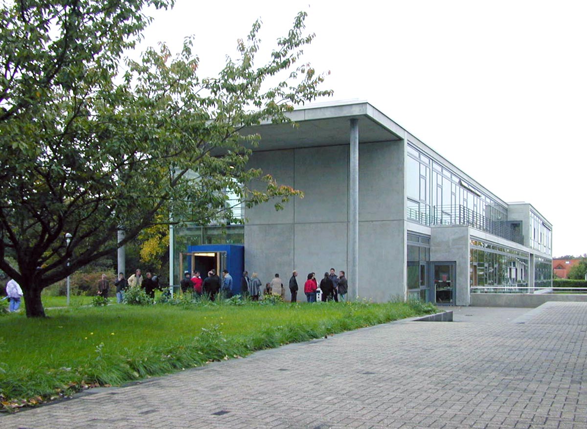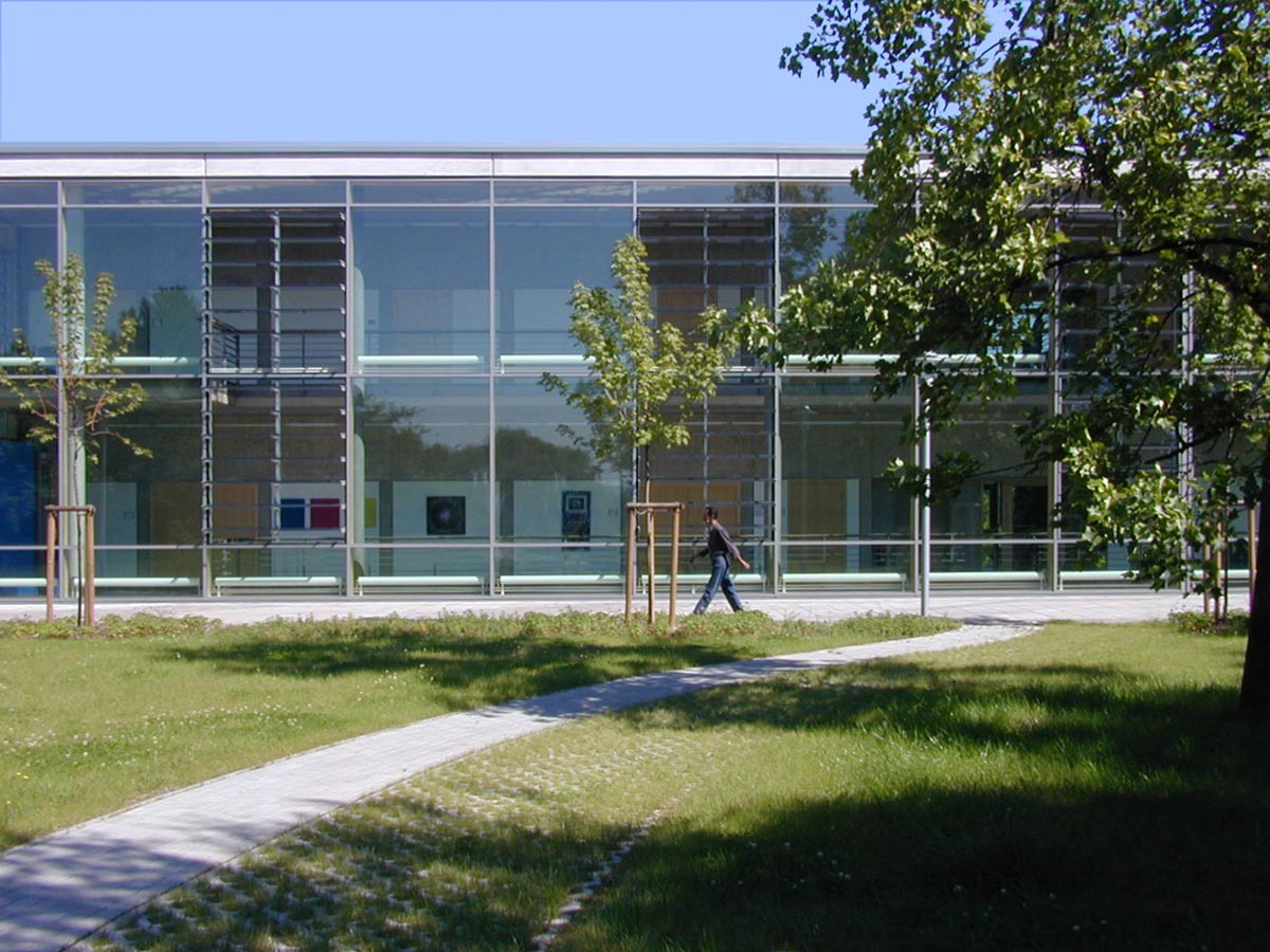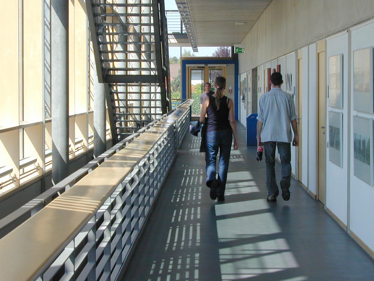 Da die Gesamtanlage des BFW aus den 70ern sehr distanziert zur Straße auf einem parkartigen Grundstück liegt, wurde der Neubau nun als Signal am Hauptzugang der Anlage positioniert. Gestalterisch ist das Haus von 2000 wie das alte BFW der 70er ein Bau aus Sichtbeton. Das dreigeschossige Gebäude ist als Einbund organisiert. Alle Arbeitsräume sind nach Norden orientiert, ohne Sonnenschutz und ohne direkte Wärmeeinstrahlung. Im Süden vor den Unterrichtsräumen liegen Flur und Treppe als Pufferzone. Die gesamte Haustechnik findet Platz in der Flurwand, deren Tiefe für die Unterrichtsräume Abstellmöglichkeiten bietet. Es gibt Eingänge an beiden Schmalseiten, und einen dritten Eingang, der das Haus für Rollstuhlfahrer von der -1-Ebene der Parkplätze aus erschließt. Das Gebäude ist barrierefrei.