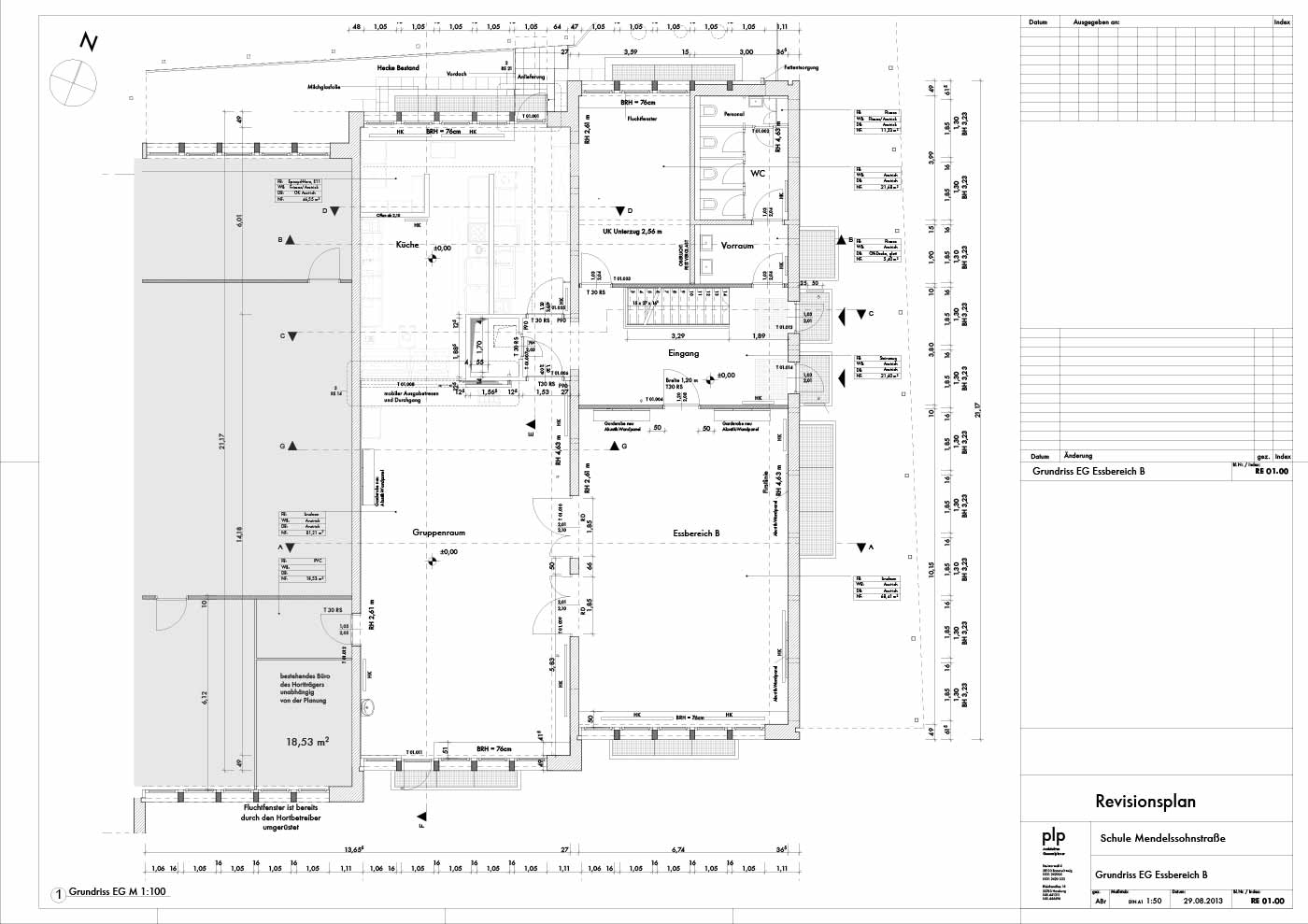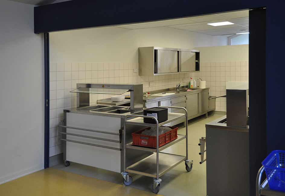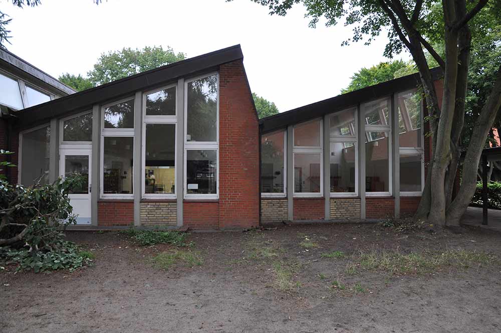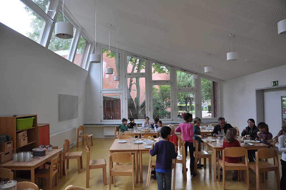 Die Maßnahme erfolgte im Rahmen des GBS-Programms für Hamburger Grundschulen, die den Beginn der Ganztagsbetreuung zum Schuljahr 2013/14 vorsah. Im GBS-Programm waren alle Flächengrößen festgelegt und mussten so gut wie möglich in den Bestand integriert werden. Eigentlich nur eine kleine Umbaumaßnahme, zeigte sich die Aufgabe als relativ komplex in der Betreuung - unsere Arbeit umfasste die Aus- und Einzugsplanung von Schule und sonstigen Nutzern, die eigentliche Planung bis zur Abstimmung mit dem Denkmalschutz und die Absprachen mit Schulleitung, Hausmeister und Caterer. Die Essensausgabe sollte sowohl mit Tresen als auch mit fahrbaren Tresen-Elementen zur Bedienung an den Esstischen funktionieren können. Deshalb wird die Küche mit türhohen Schiebe-Elementen verschlossen.