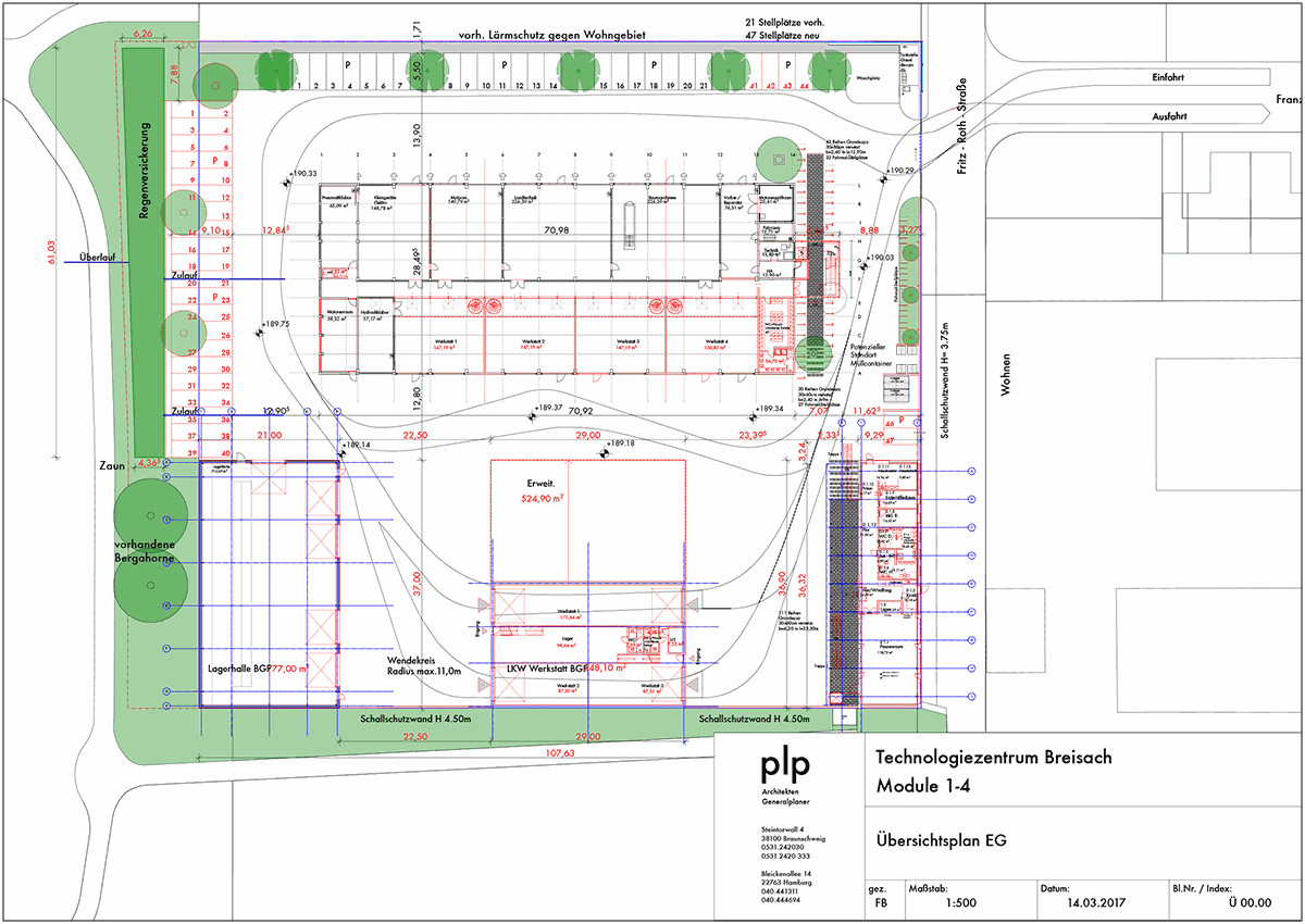 Wir sind in das Projekt eingestiegen, als in der bestehenden Halle bereits Land- und Baumaschinenwerkstätten betrieben wurden und an der östlichen Grundstücksgrenze eine 5m hohe Lärmschutzwand zu den Nachbarn errichtet worden war. Es gab einen gültigen B-Plan und ein Lärmschutzgutachten, das dreiseitig Lärmschutzwände für das Grundstück vorsah. Entgegen dem B-Plan stehen inzwischen die Neubauten der Schule als Grenzbebauung auf dem Grundstück, die Stadt Breisach war dabei sehr kooperativ.