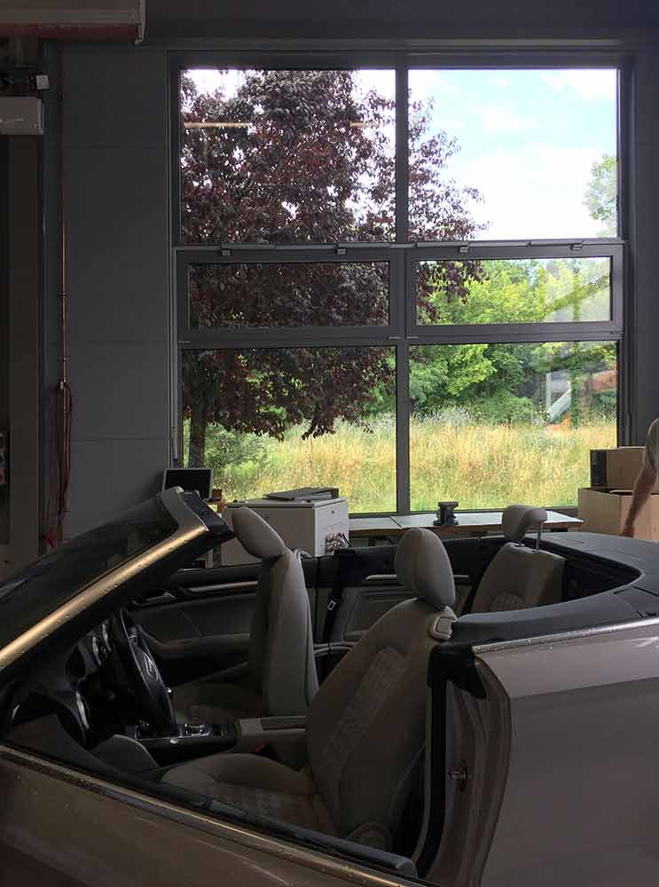 Den Lehrern war natürlich wichtig, dass die Lkws gut ein- und ausfahren können, deshalb sind die Hofflächen zu den jeweiligen Nachbargebäuden mindestens 22,50 m breit. Die Hallenhöhe resultiert aus dem Wunsch, einen Lkw aufbocken und das Führerhaus aufklappen zu können.