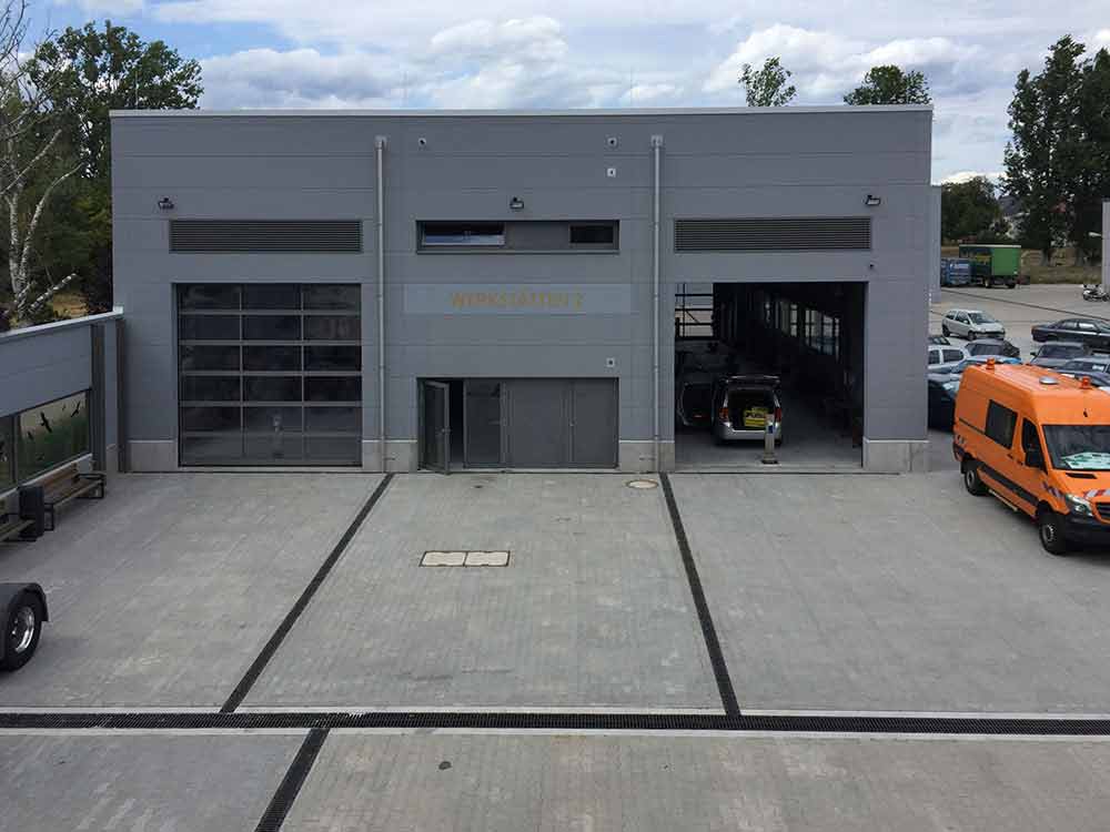 - zwei Werkstätten mit halber Länge, die bei Bedarf auch als Durchfahrts-Werkstatt genutzt werden können