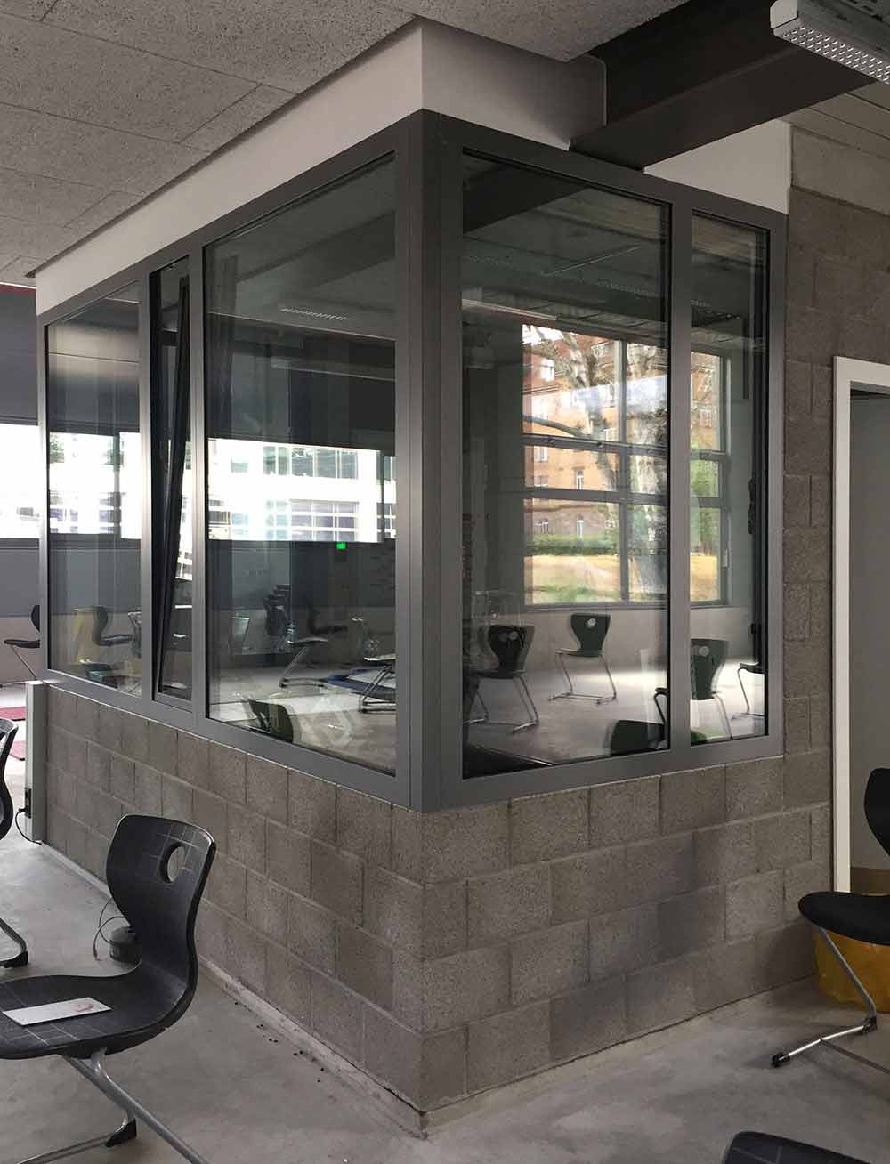 - zwischen den beiden Werkstätten liegen als Mittelzone Hausanschlussraum, Theoriebereich und Lehrerstation